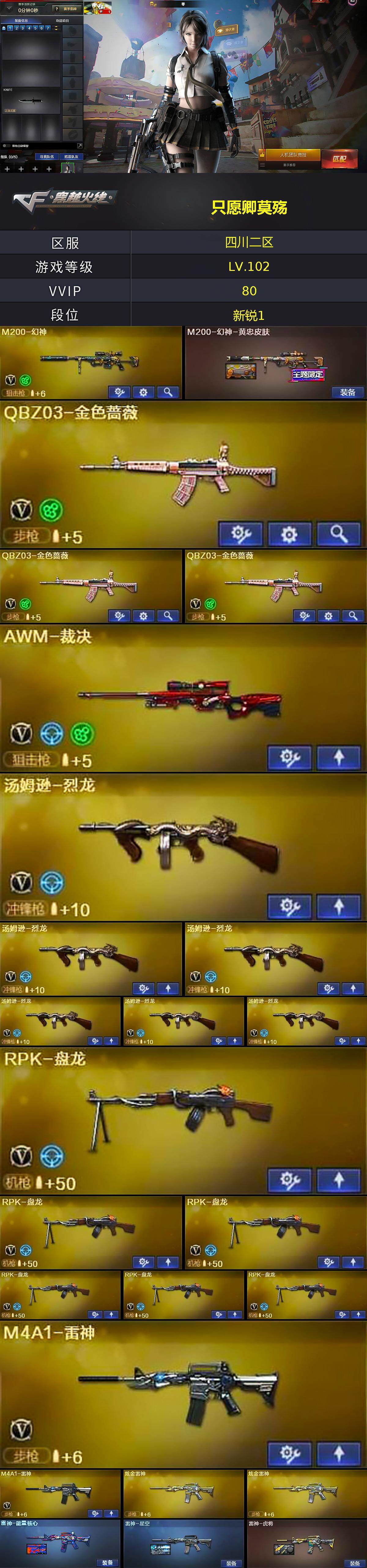 【热门武器】:QBZ03-金色蔷薇*3,HK417-朱雀,M200-幻神,M4A1-黑骑士,汤姆逊-烈龙*6,RPK-盘龙*6,加特林-炼狱*2,降世魔童,沙鹰-修罗*7