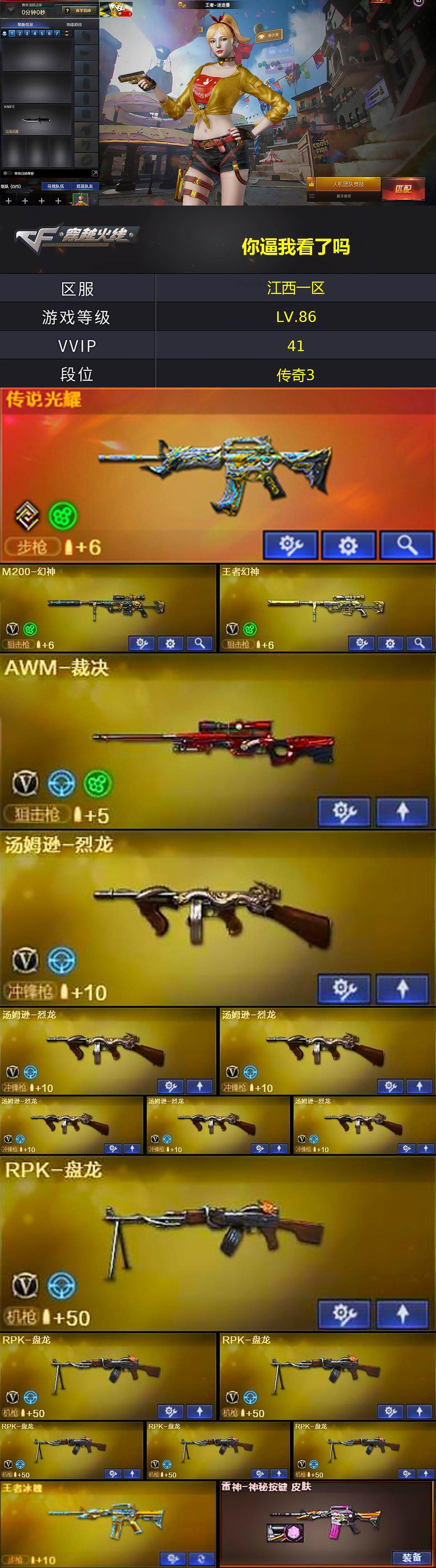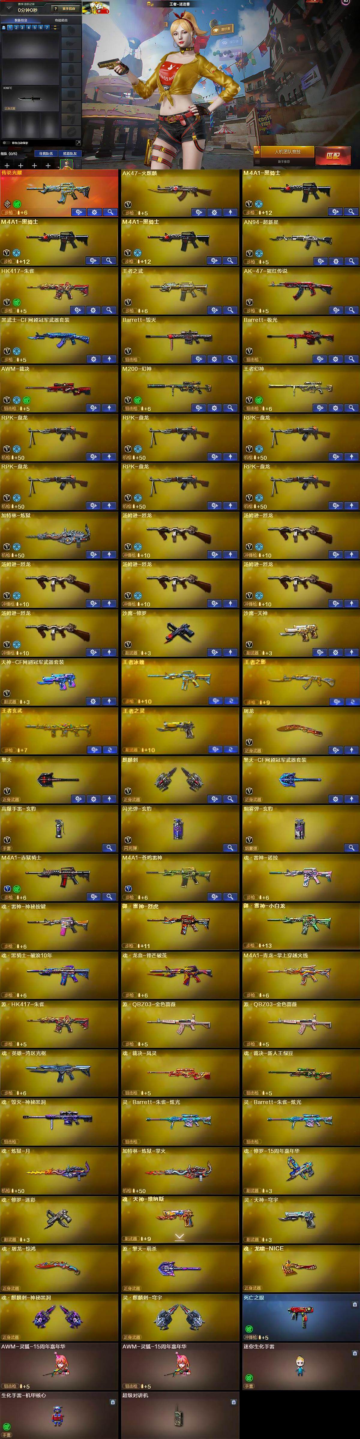 【热门武器】:传说光耀,HK417-朱雀,M200-幻神,死亡之眼,M4A1-黑骑士*3,汤姆逊-烈龙*6,RPK-盘龙*6,加特林-炼狱,沙鹰-修罗