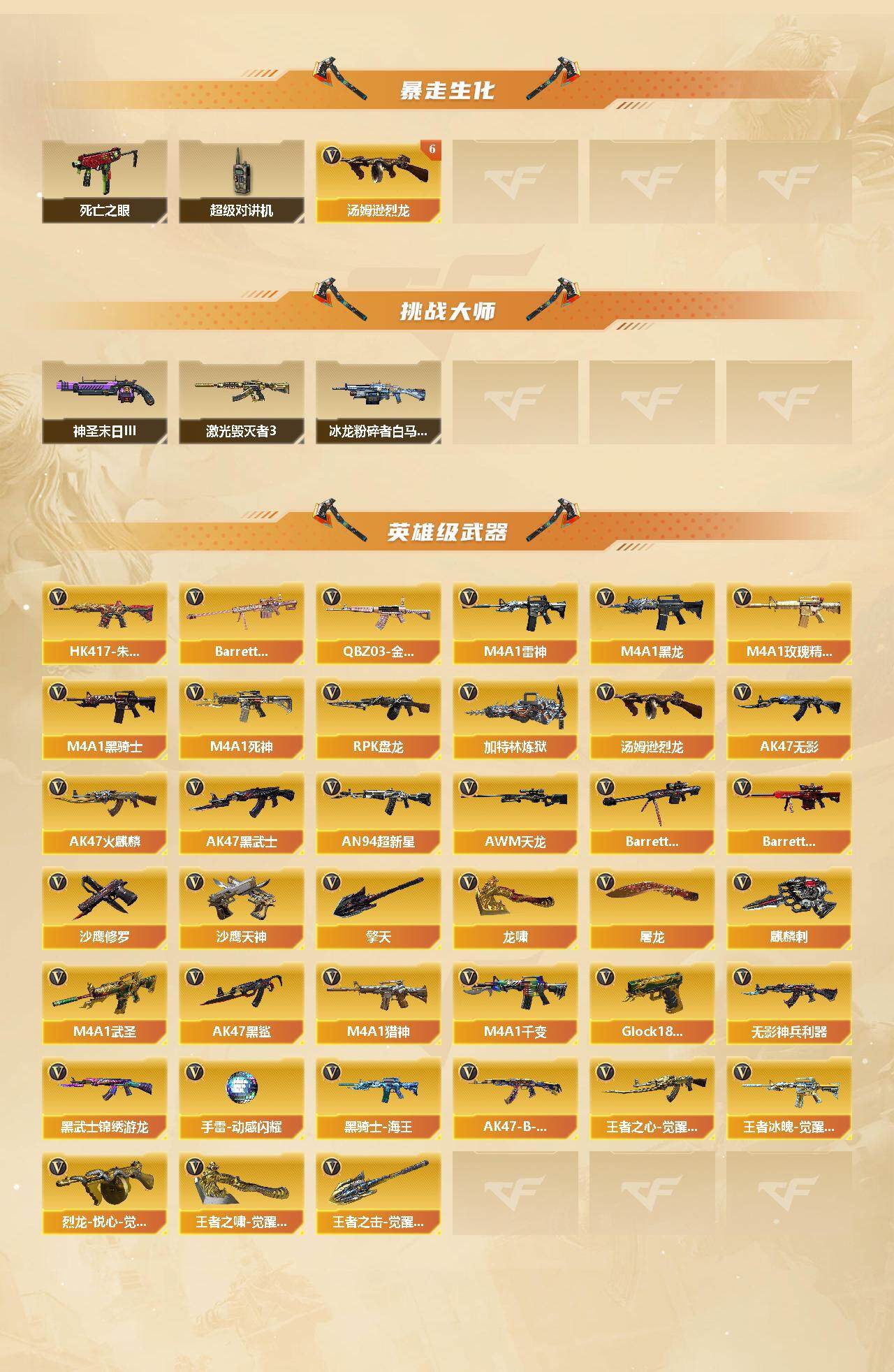 【热门武器】:QBZ03-金色蔷薇,HK417-朱雀,死亡之眼,C.A.T,M4A1-黑骑士*2,汤姆逊-烈龙*6,RPK-盘龙*4,加特林-炼狱*4,沙鹰-修罗*5