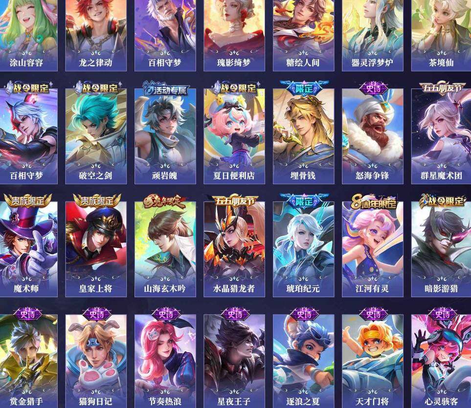 【限定皮肤】:暃埋骨钱,蒙犽顽岩魄,蔡文姬夏日便利店,大乔绒语心约,虞姬夏日便利店,姜子牙天穹之誓,狄仁杰阴阳师,赵云皇家上将,马可波罗暗影游猎,马可波