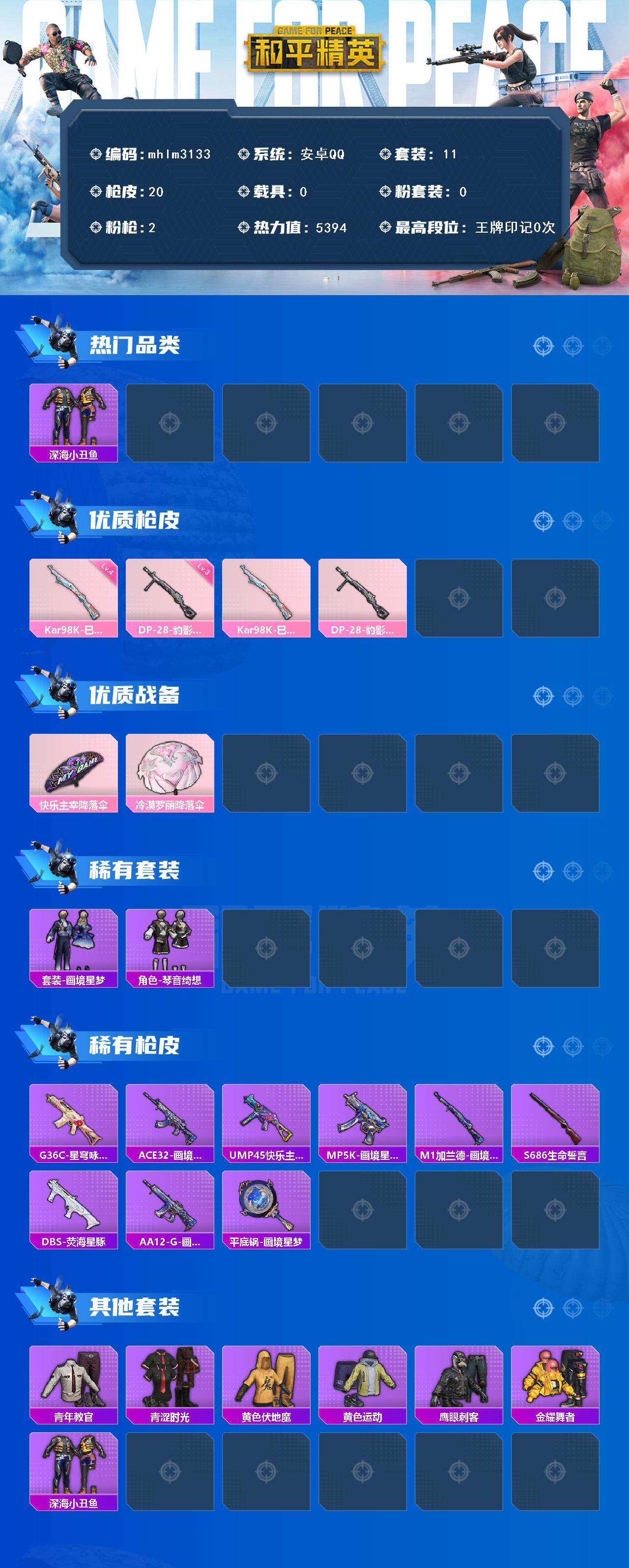 【mhlm3133】安卓 手Q-0粉装-2特效枪-0载具-1粉色飞行器-5394热力值-0王牌印记-11套装-20枪皮