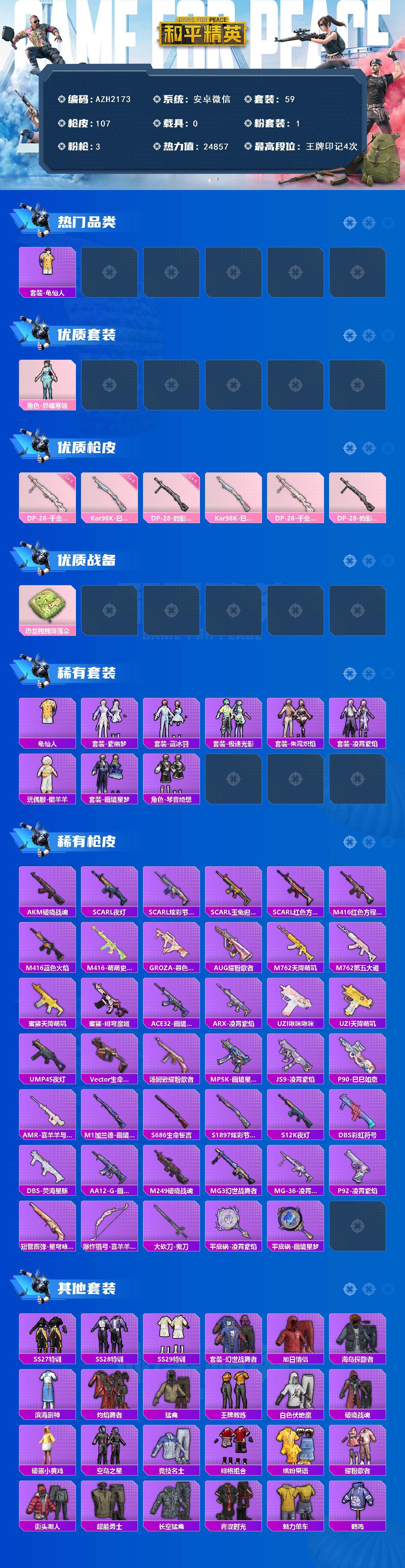 【AZH2173】安卓 微信【1粉角色-异瞳寒姬懒羊羊 五级千金淑猫DP-28】1粉装-3特效枪-0载具-1粉色飞行器-24857热力值-4王牌印记-59套装-107枪皮