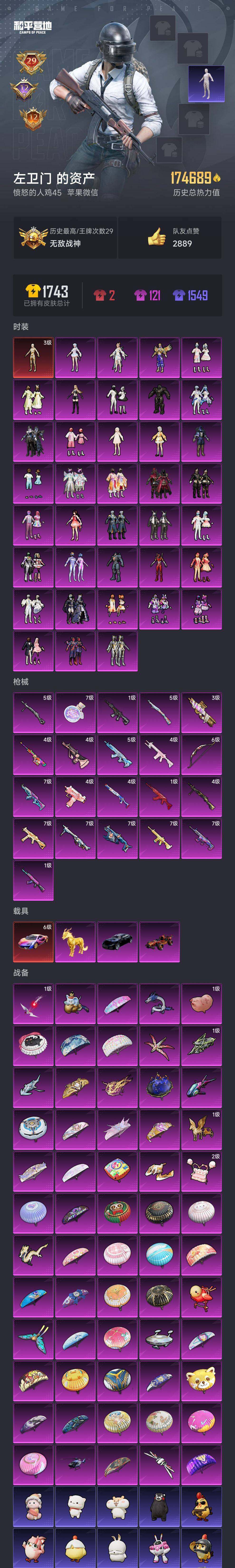 【AZH2174】苹果 微信【29印记 无敌战神框 六级迈凯伦(镭射紫)三级图卡盟 梦幻火箭木乃伊红螳螂小丑女 满级梦之光华AKM满级机甲封神SCAR-L满级暖熊萌萌M416满级环太平洋Vector满级洛神天依MG3 粉熊背包 4载具1僚机】无敌战神框-1神装-37粉装-21特效枪-4载具-17粉色飞行器-174689热力值-29王牌印记-307套装-436枪皮