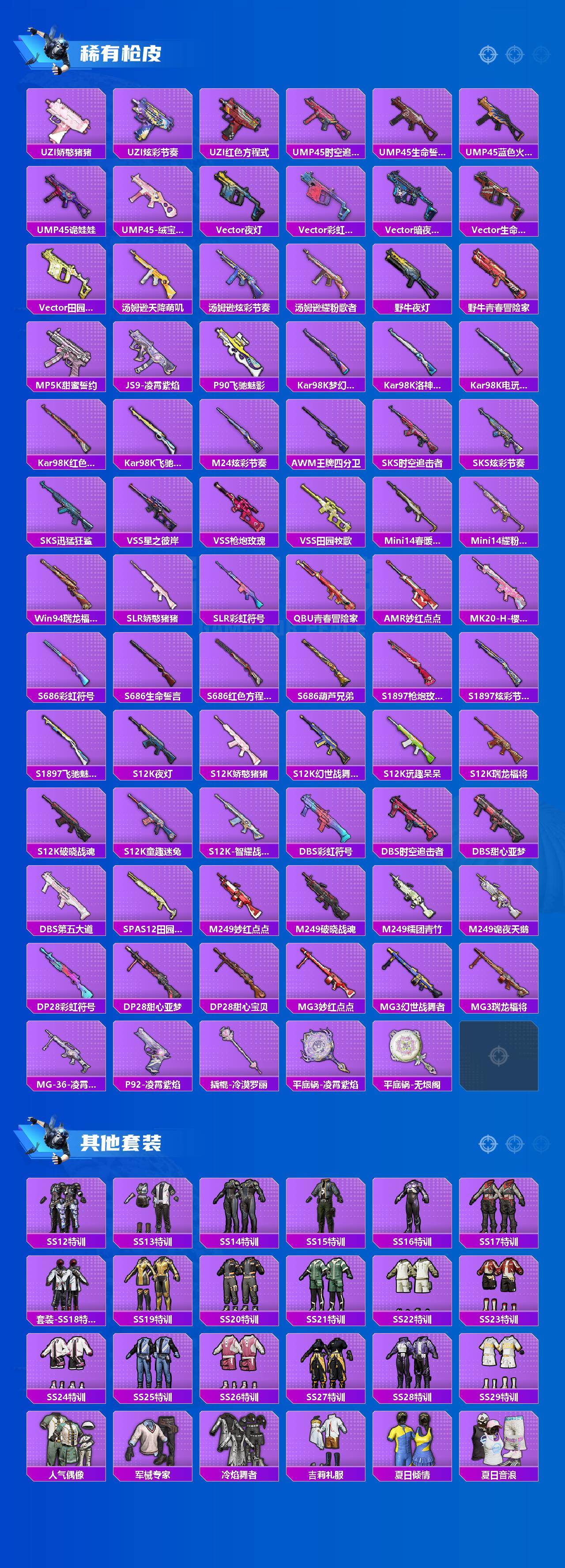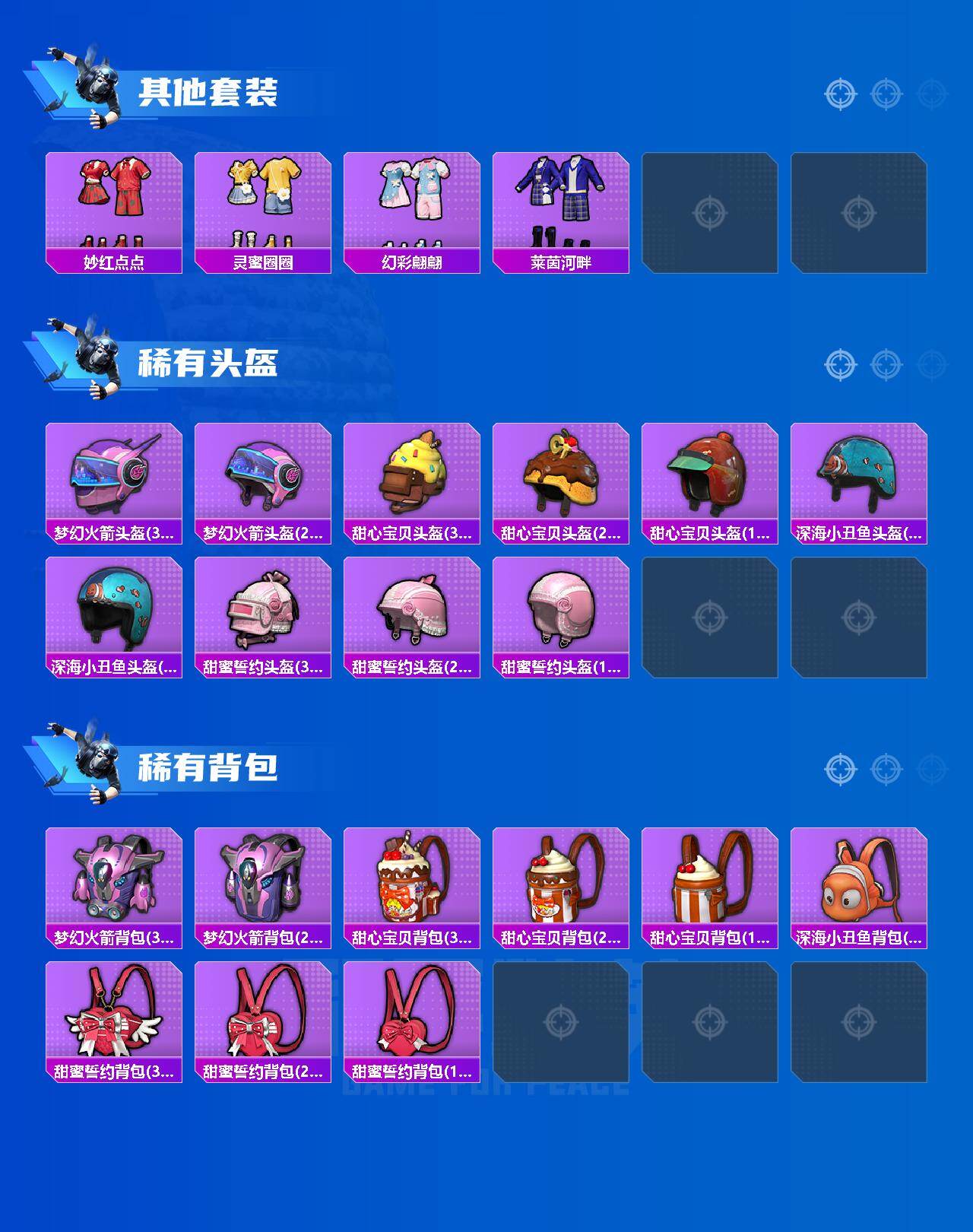 【粉色套装】:粉装-宝贝奶油派,粉装-天使彩虹糖,粉装-梦幻火箭,粉装-甜蜜誓约,粉装-冰霜白皇,粉装-炙焰红王,粉装-蜜桃特工,粉装-暗夜玫瑰,角色-羊梦糖心
