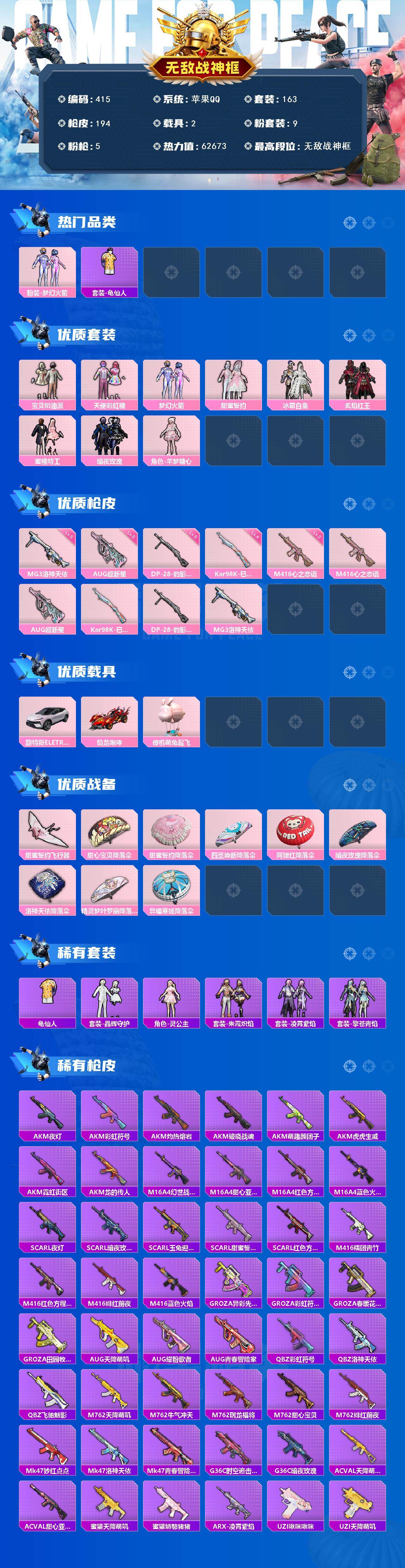 苹果 手Q-无敌战神框-9粉装-5特效枪-2载具-1粉色飞行器-62673热力值-13王牌印记-163套装-194枪皮