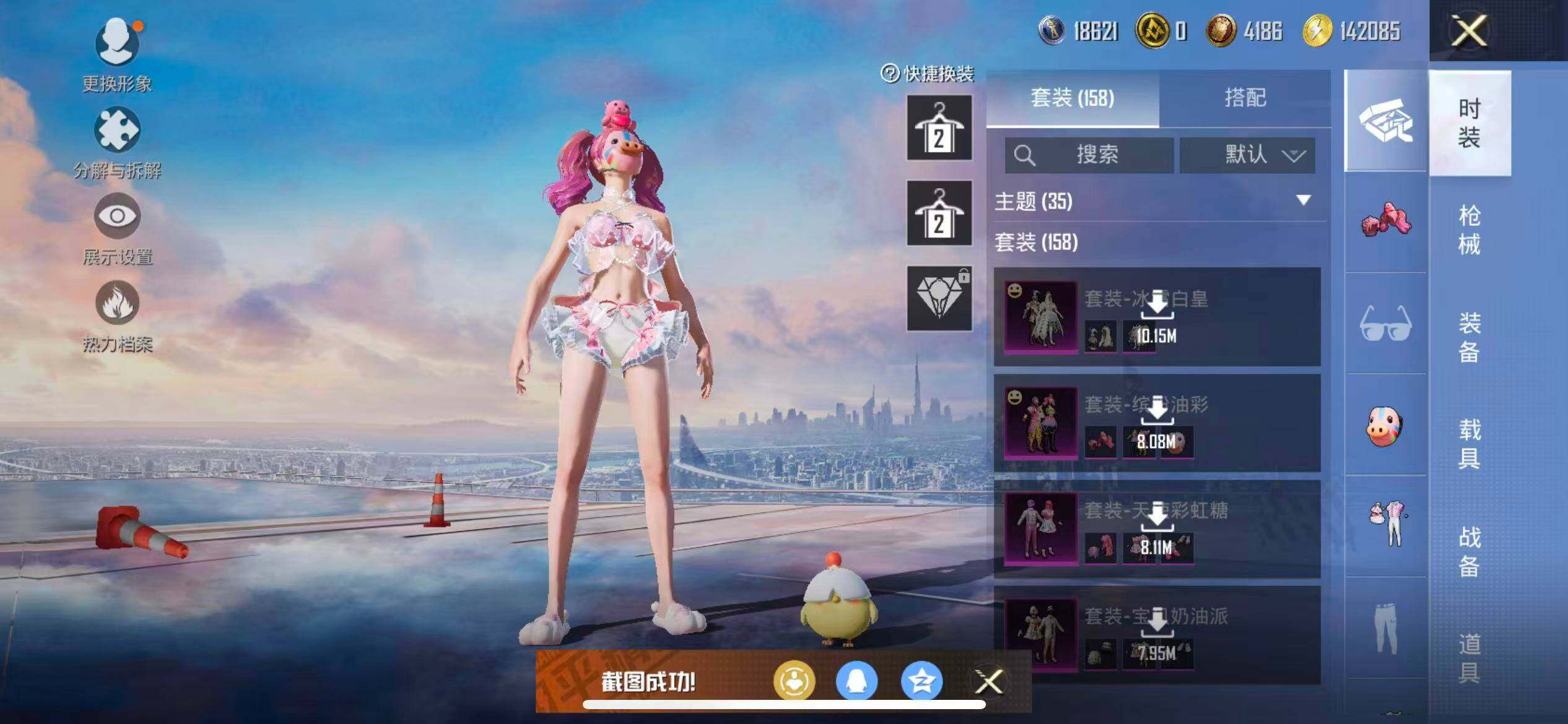 【粉色套装】:粉装-宝贝奶油派,粉装-天使彩虹糖,粉装-缤纷油彩,粉装-冰霜白皇,粉装-彩虹鹿灵,粉装-山涧鹿灵,角色-萨利娅,角色-冷漠罗丽,角色-宁雨蝶