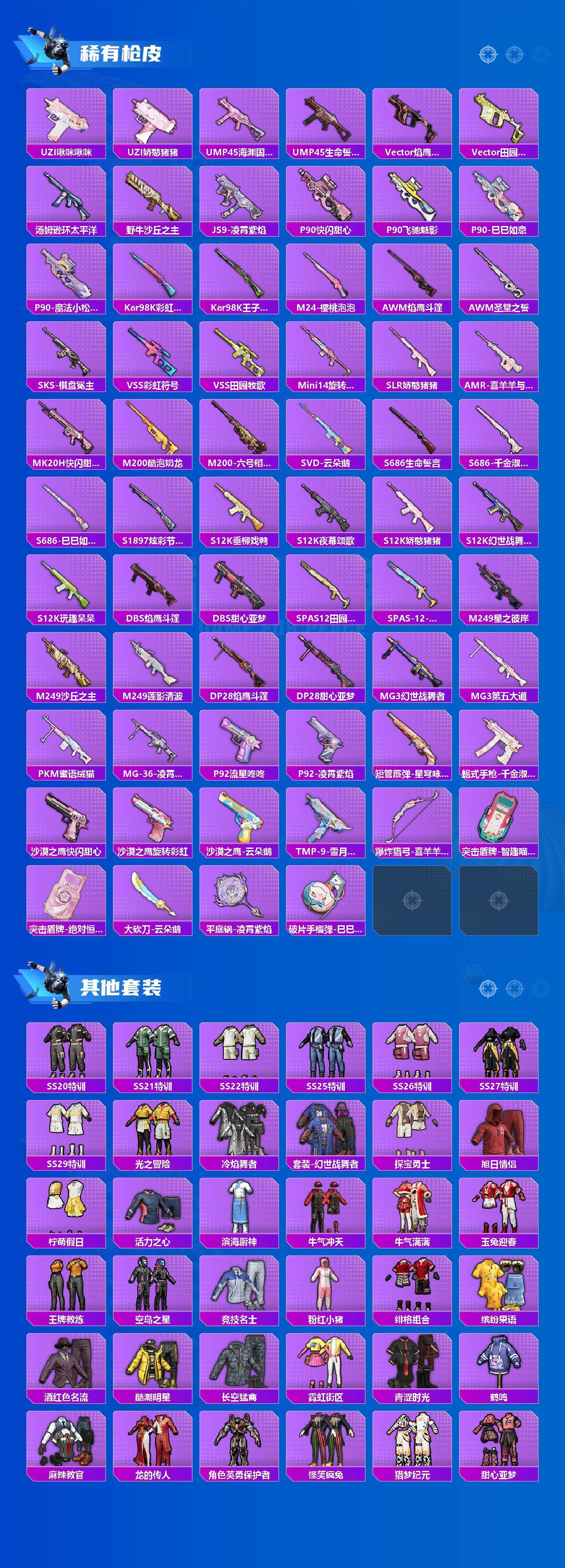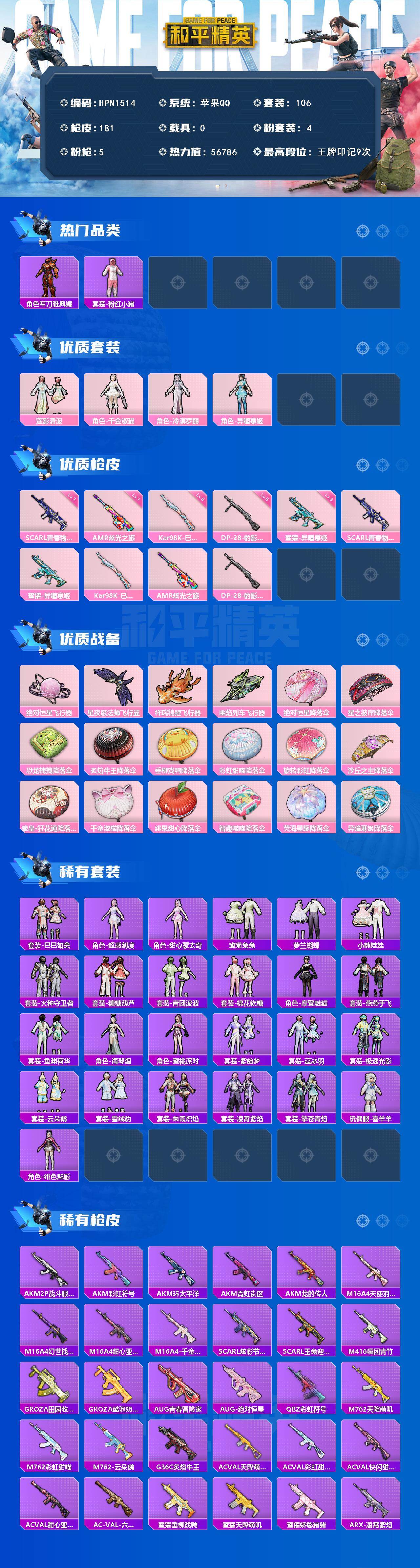 【HPN1514】106套装/枪械5/装备250/战备129/王牌印记9/热力值56786/七级SCAR-L-青春物语/三级蜜獾-异瞳寒姬/五级Kar98K-巳巳如意/七级AMR-炫光之旅/五级DP-28-豹影疾电/军刀雅典娜/套装-粉红小猪/莲影清波/角色-千金淑猫/角色-冷漠罗丽/角色-异瞳寒姬/SCAR-L-青春物语/蜜獾-异瞳寒姬/Kar98K-巳巳如意/AMR-炫光之旅/DP-28-豹影疾电/绝对恒星飞行器/星夜魔法师飞行翼/祥瑞锦鲤飞行器/幽焰列车飞行器/绝对恒星降落伞/星之彼岸降落