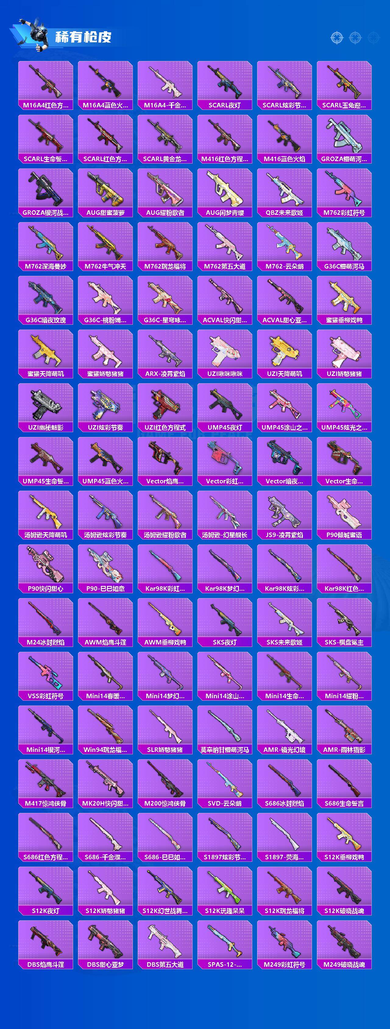 【粉色枪皮等级】:AKM-梦之光华(七级),SCAR-L-锦绣绵绵(五级),M416-五爪金龙(七级),M416