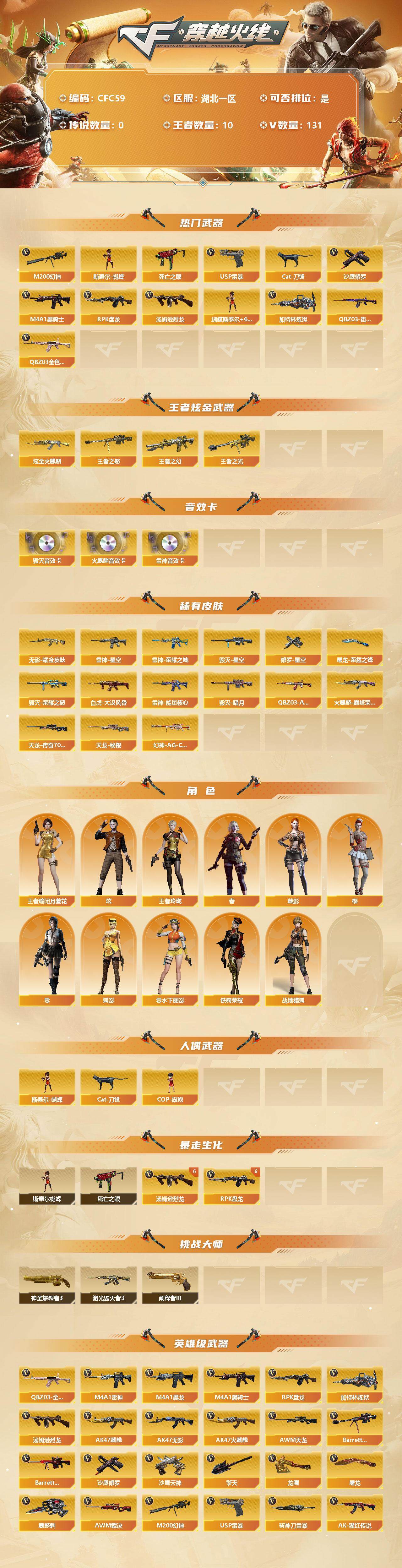 【CFC59】123V/102级/荣耀元首/10王者/1炫金/8英雄/QBZ03-金色蔷薇/M200_幻神/死亡之眼/QBZ03-街机/Cat-刀锋/M4A1_黑骑士/汤姆逊烈龙/RPK_盘龙/加特林_炼狱/蝴蝶/USP_雷暴/沙鹰_修罗/蝴蝶斯泰尔+6烈龙/炫金火麒麟/王者之幻/王者之光/王者之怒/AK47-火麒麟音效卡/M4A1-雷神音效卡/Barrett-毁灭音效卡/幻神-AG-CFPL S24冠军 皮肤/白虎-大汉风骨/QBZ03-AG-CFPLS19冠军/雷神-能量核心/雷神-荣耀之魄