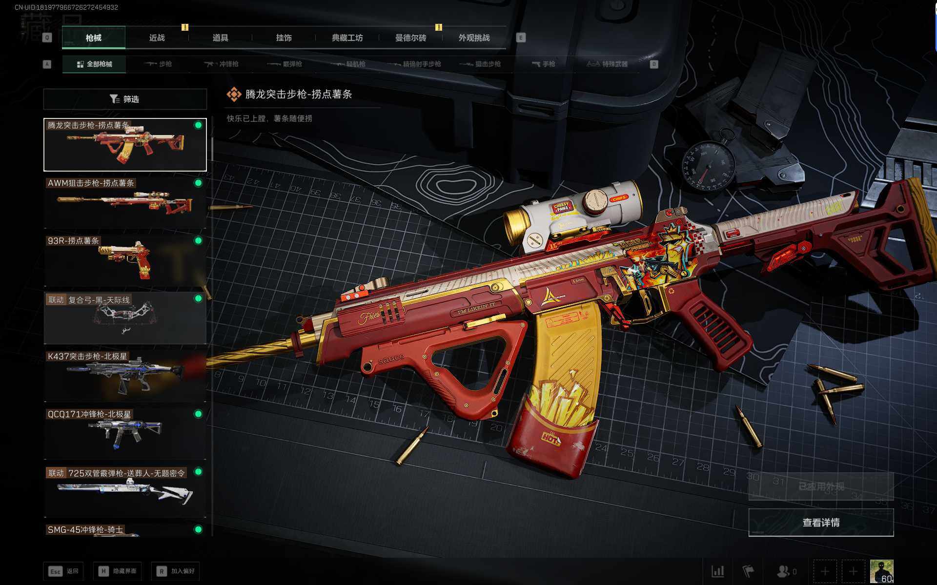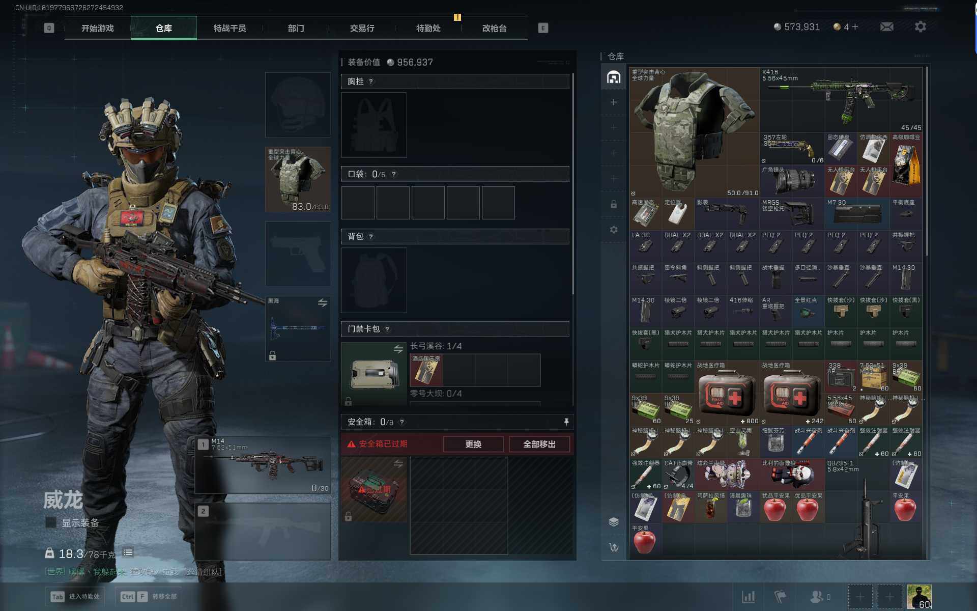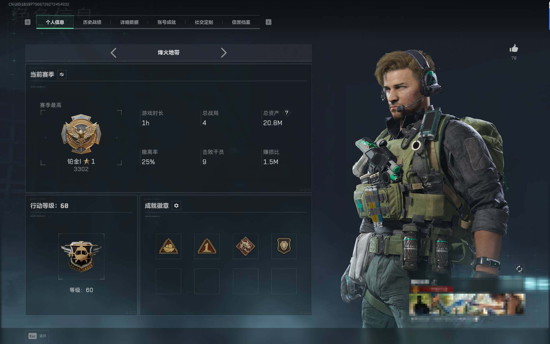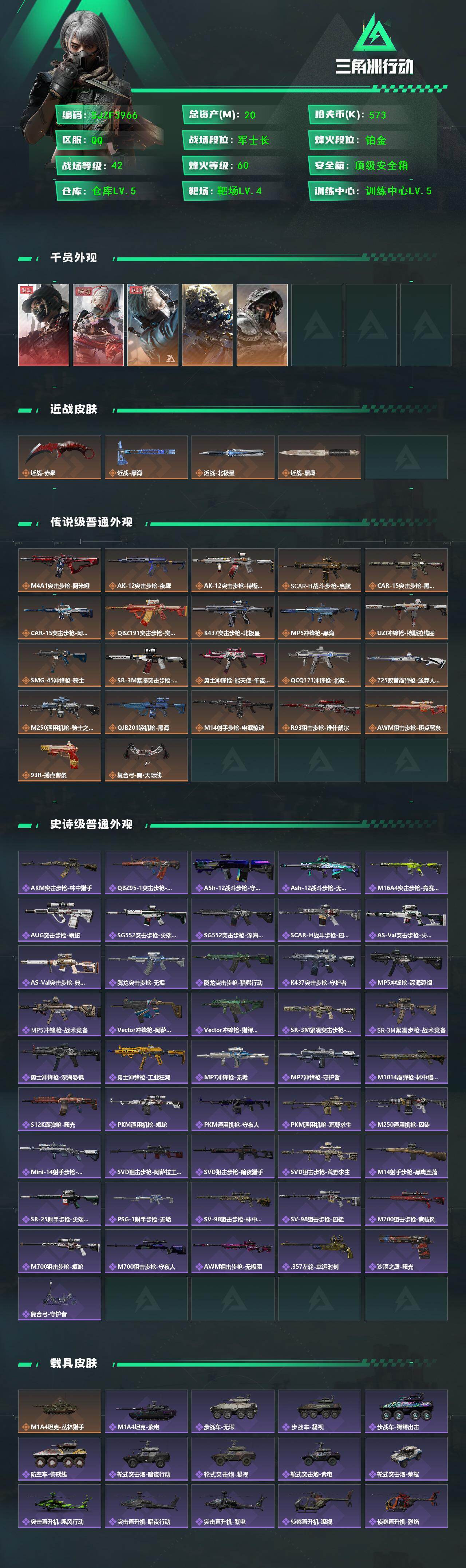 总资产(M):20M/哈夫币(K):573K/传说枪皮数:22/全面战场等级:42_段位:军士长/烽火地带等级:60_段位:铂金/
