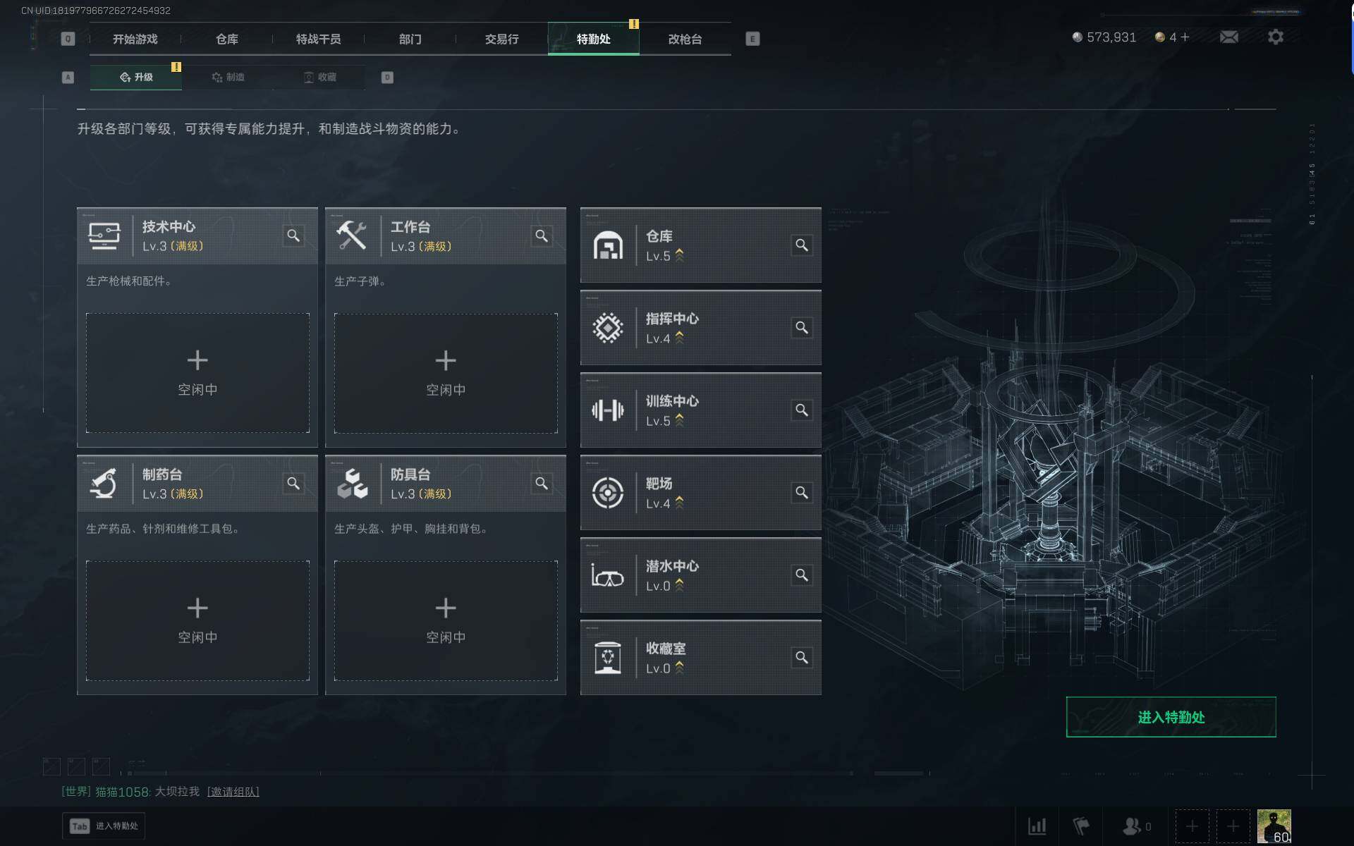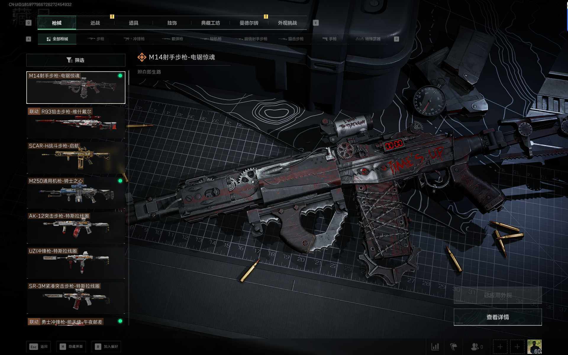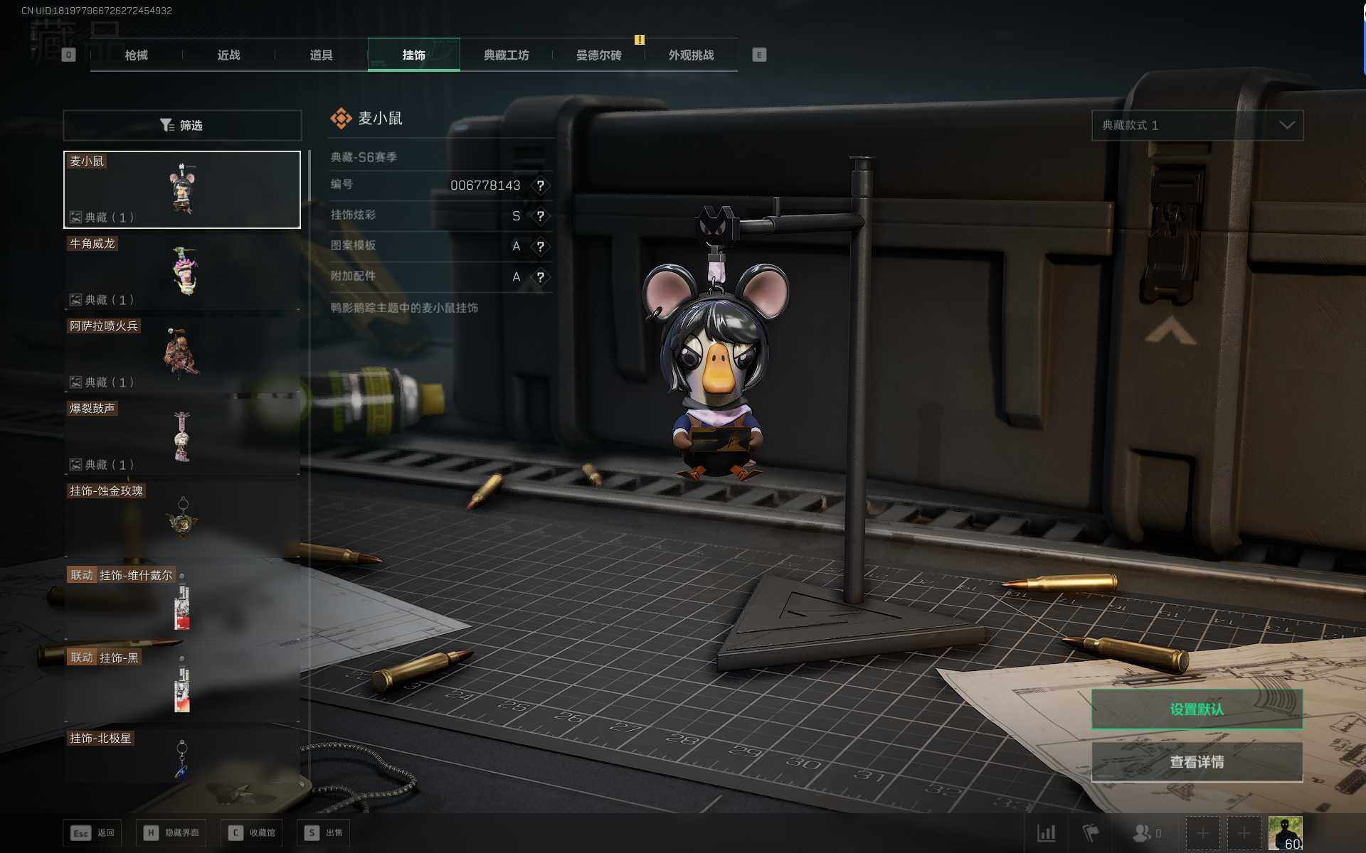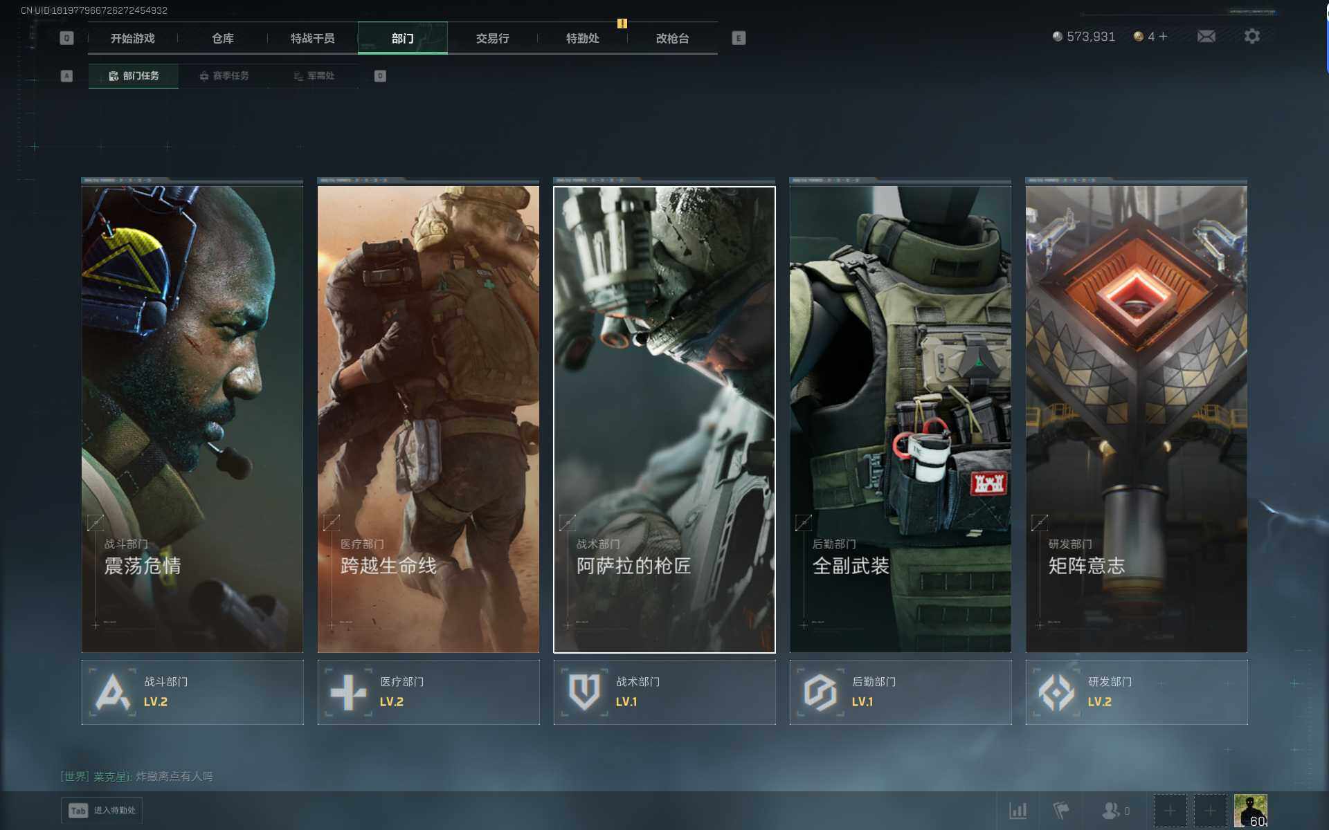 总资产(M):20M/哈夫币(K):573K/传说枪皮数:22/全面战场等级:42_段位:军士长/烽火地带等级:60_段位:铂金/