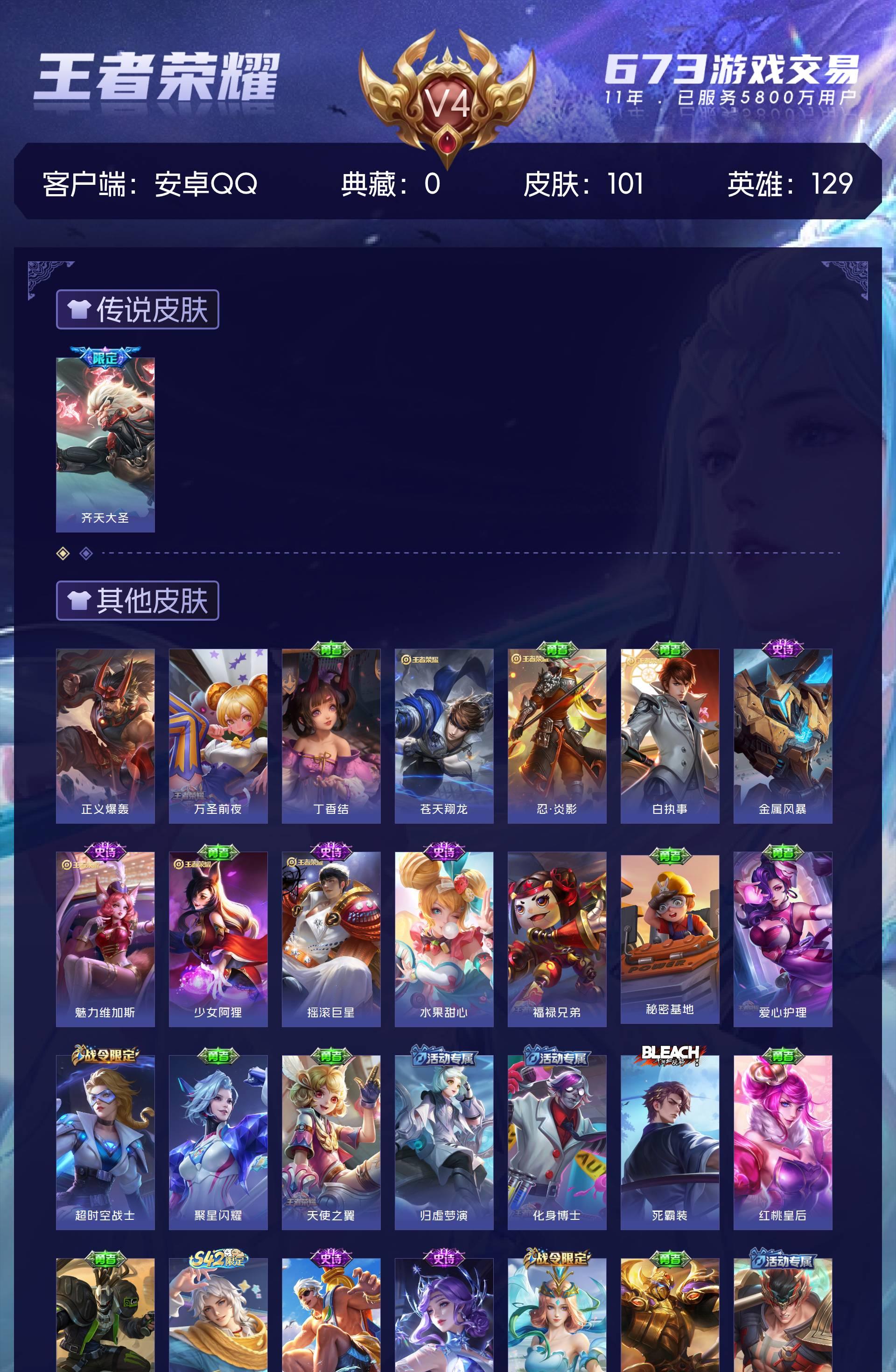 V4 皮肤101 英雄129 至尊星耀 传说1 其他皮肤106
