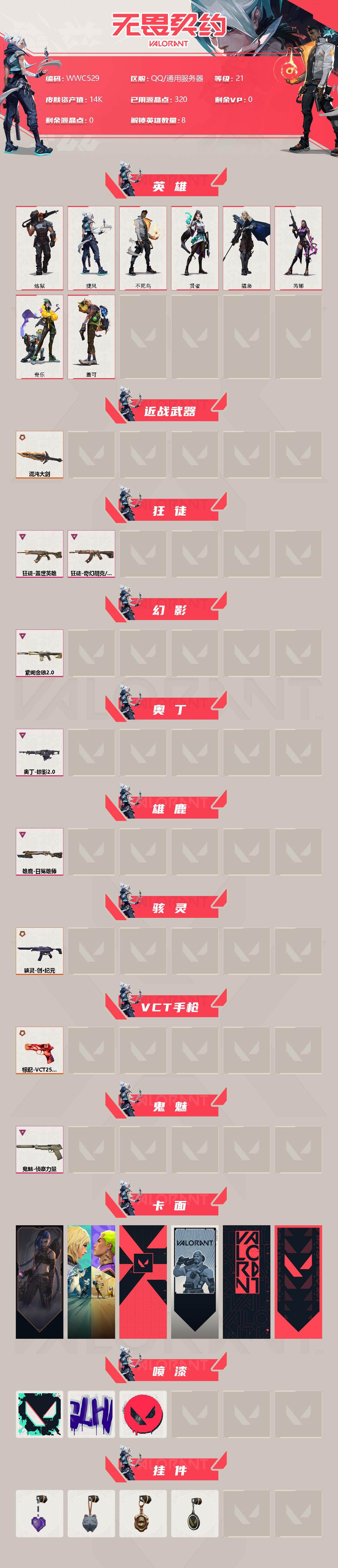 【WWC529】终极*4/卓越*6/皮肤*22/等级*21/段位:未定级/炼狱/捷风/不死鸟/贤者/猎枭/芮娜/奇乐/盖可/近战武器-混沌大剑/狂徒-盖世英雄/狂徒-奇幻朋克//3.0/幻影-紫阙金琅//2.0/奥丁-掠影//2.0/雄鹿-日冕雄师/骇灵-创·纪元/标配-VCT25 x SEN/鬼魅-侦察力量/《双城之战》金克丝 卡面/钢锁vs盖可 卡面/代号红色 卡面/新兵报到 卡面/V契约 卡面/无畏契约 卡面/胜利属于无畏契约 喷漆/GLHF 喷漆/无畏契约 喷漆/薰衣草之心 挂饰/《双城