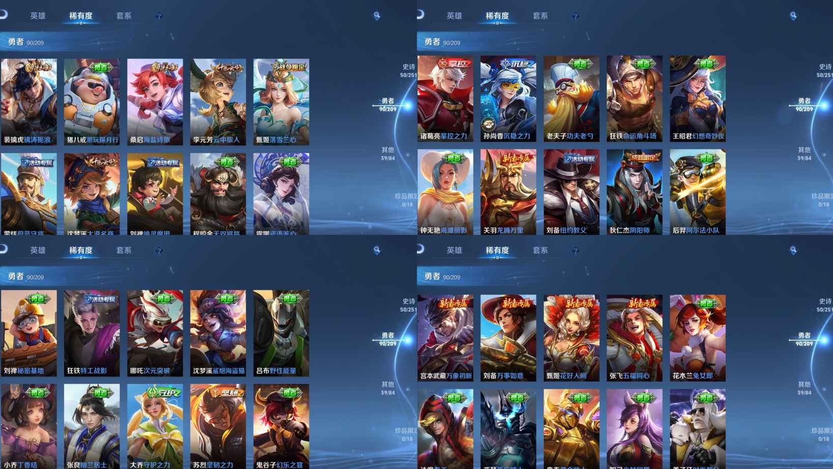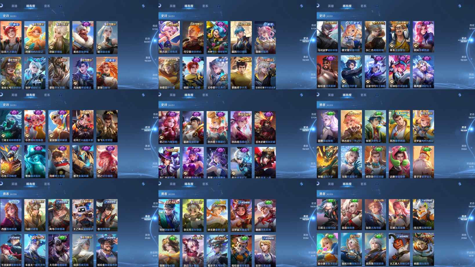 【史诗皮肤】 蔬乡物语 蔬乡物语 茶境仙 孙行者 地狱燃心 青焰无极 怒海争锋 琥珀纪元 苍威无极 孙行者 江河有灵 幻夜行动 完美运算 百解令 暖冬絮语 荣光圣徽 漠中幻影 龙之律动 奇幻香踪 幽灵船长 繁星吟游 拒霜思 功夫厨神 女仆咖啡 魅力维加斯 魔术师 鹰眼统帅 蓝屏警告 鬼剑武藏 水晶猎龙者 曙光守护者 暗隐猎兽者 绅士熊喵 末日机甲 暗影游