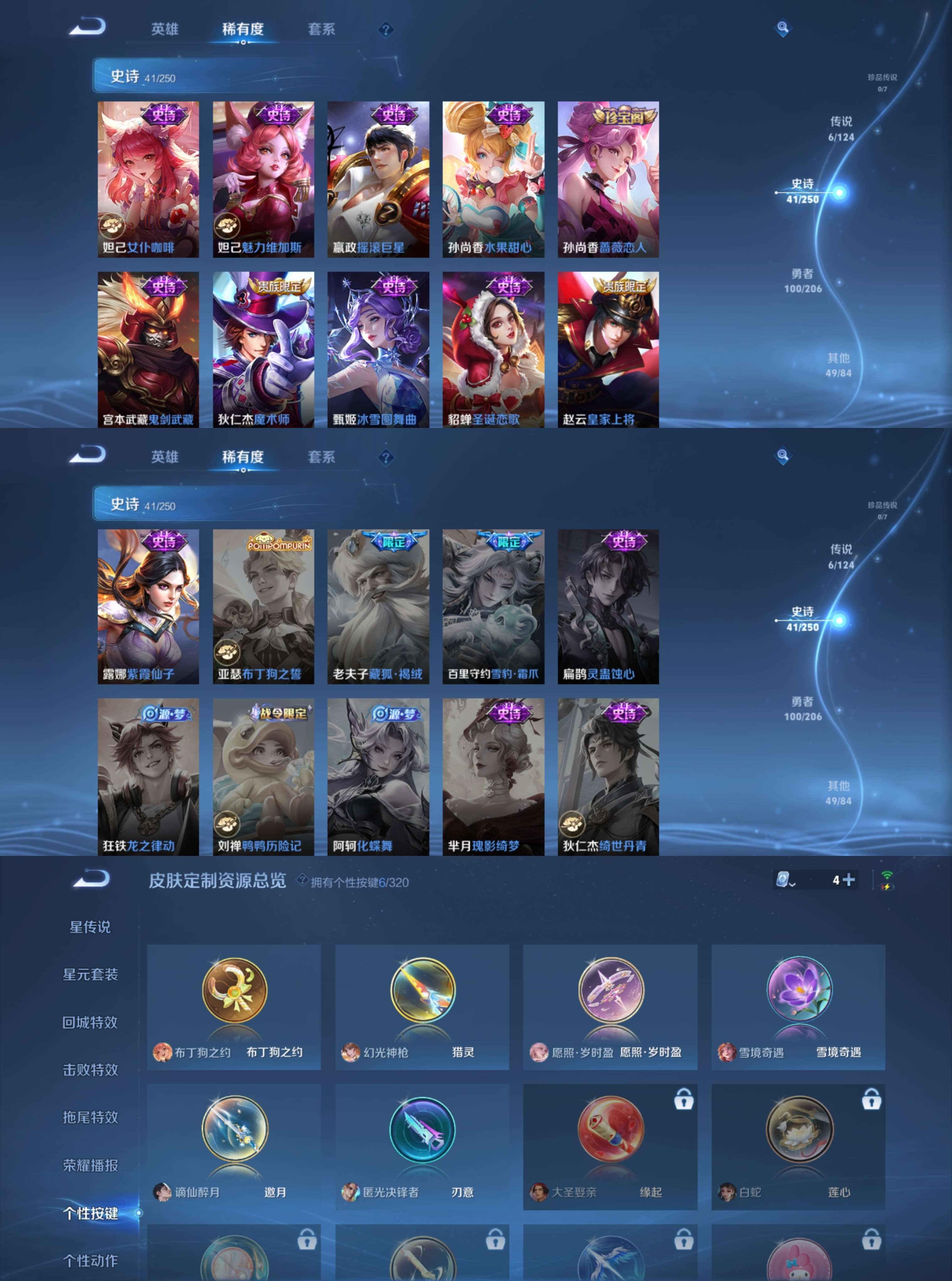 【史诗皮肤】 布丁狗之约 谪仙醉月 谧流熔炉 劲辣红锅 聚星闪耀 玫蓝誓约 江河有灵 铁骨偃魂 苍林狼骑 完美运算 漠中幻影 魅语 幽灵船长 拒霜思 功夫厨神 女仆咖啡 魅力维加斯 魔术师 鹰眼统帅 圣诞恋歌 真爱魔法 鬼剑武藏 水晶猎龙者 火炮绅士 暗隐猎兽者 航海奇遇记 千年之狐 逐浪之夏 紫霞仙子 末日机甲 金属风暴 李
