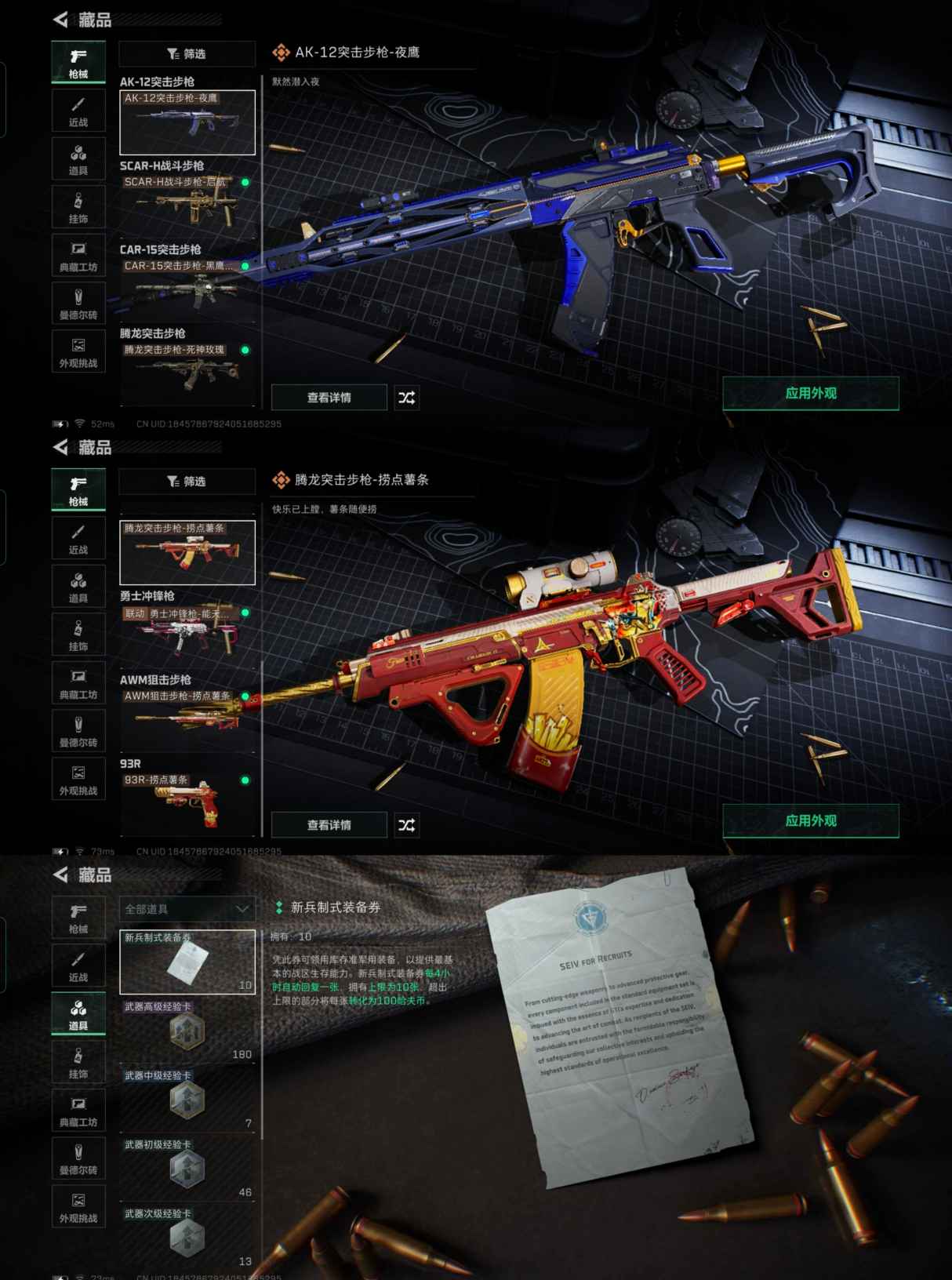 【枪皮】M4A1突击步枪-粉色涂装 M4A1突击步枪-高雅黑 M4A1突击步枪-海色 M4A1突击步枪-零点 AKM突击步枪-肃杀 AKM突击步枪-林中猎手 QBZ95-1突击步枪-高雅黑 QBZ95-1突击步枪-海浪 QBZ95-1突击步枪-海色 QBZ95-1突击步枪-公平竞技 QBZ95-1突击步枪-曙光 ASh-12战斗步枪-守夜人 K416突击步枪-几何迷彩 K4