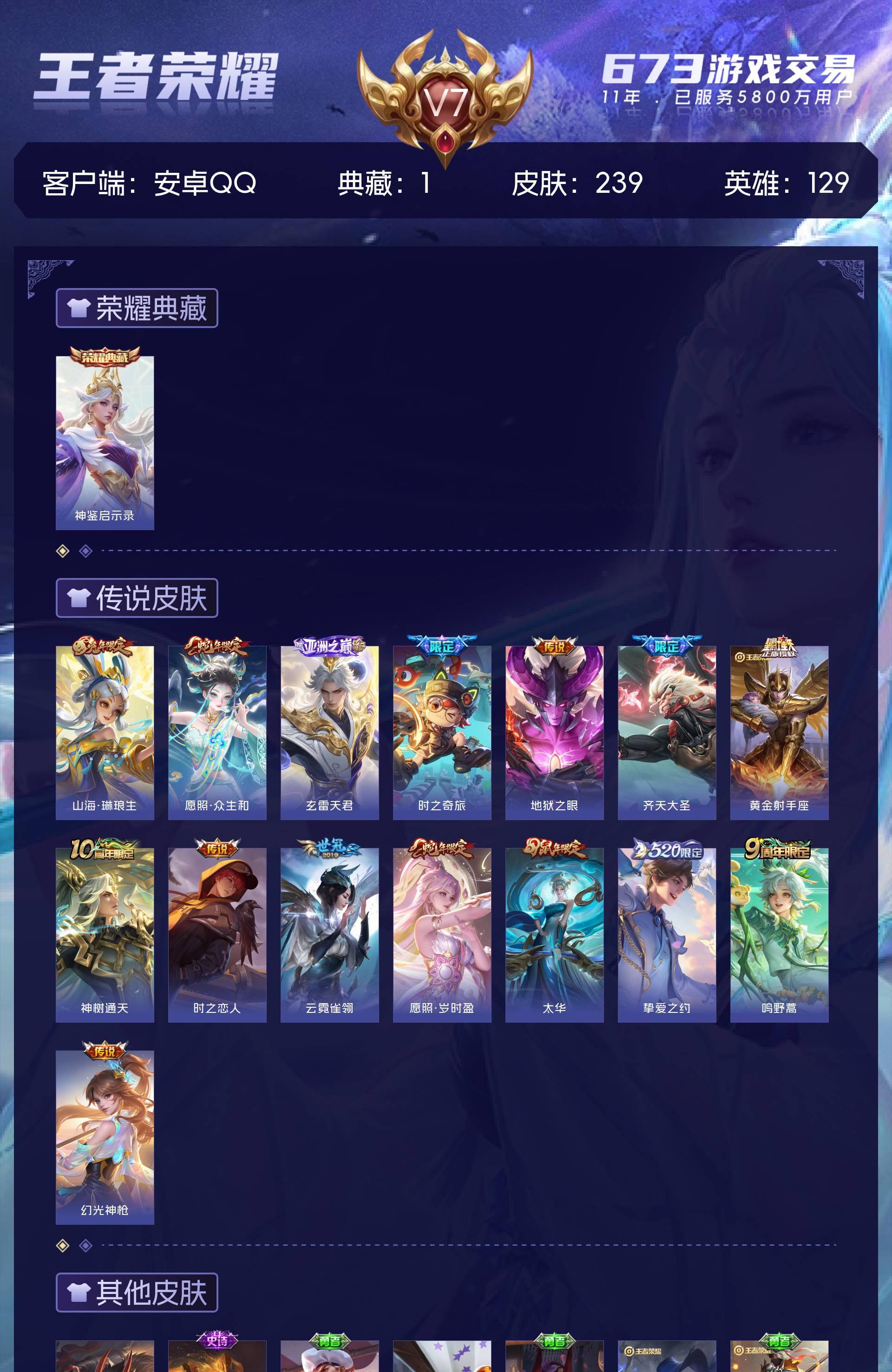V7 皮肤239 英雄129 永恒钻石 荣耀典藏1 传说15 其他皮肤230