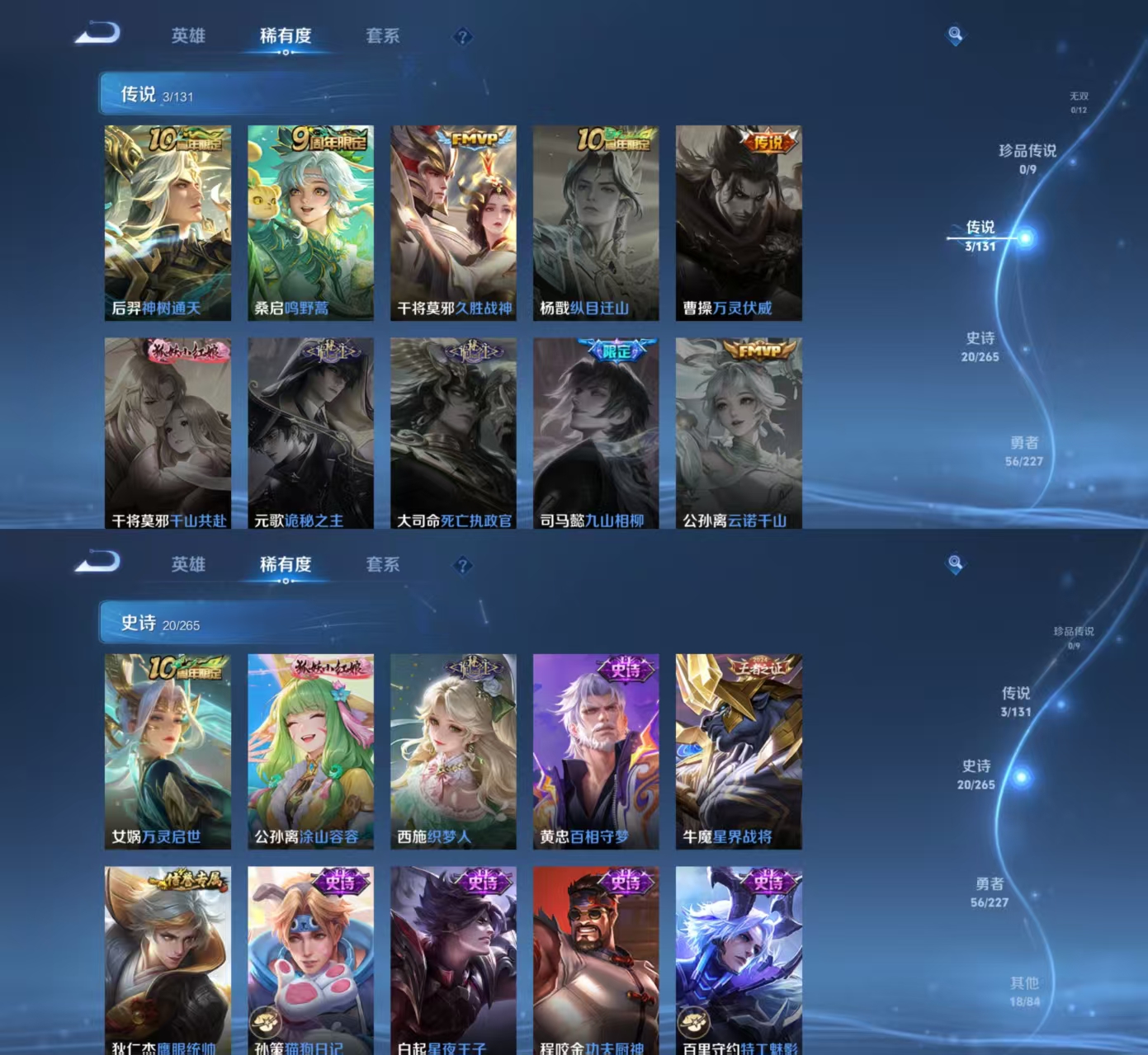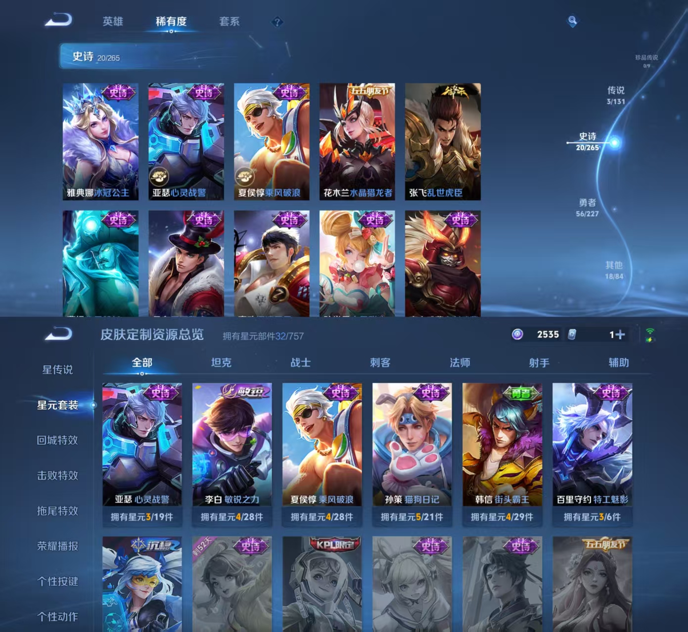 【史诗皮肤】 克喵 织梦人 星界战将 踏浪烽翎 涂山容容 死霸装 小满鸭 虚灵犬护 劲辣红锅 罗小黑战记 命运加冕 完美运算 漠中幻影 逆浪荇歌 幽灵船长 功夫厨神 鹰眼统帅 鬼剑武藏 水晶猎龙者 圣诞狂欢 猫狗日记 水果甜心 乘风破浪 冰冠公主 心灵战警 摇滚巨星 乱世虎臣 星夜王子 特工魅影