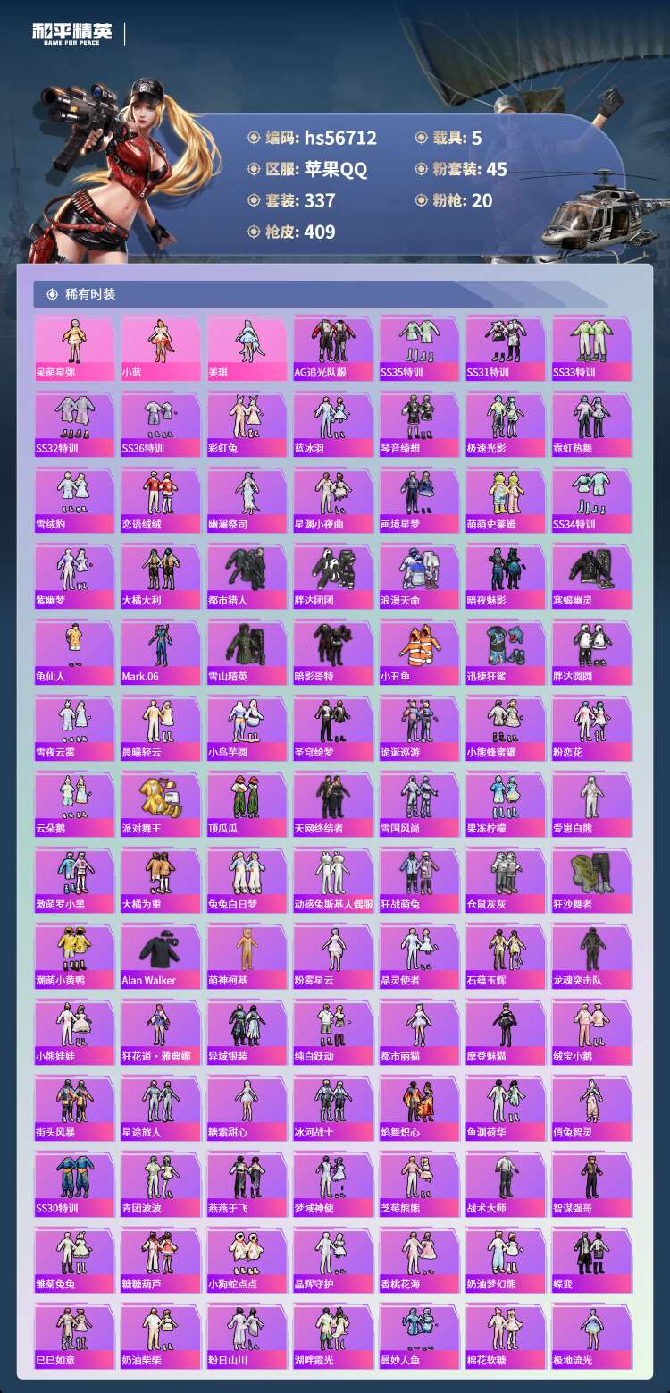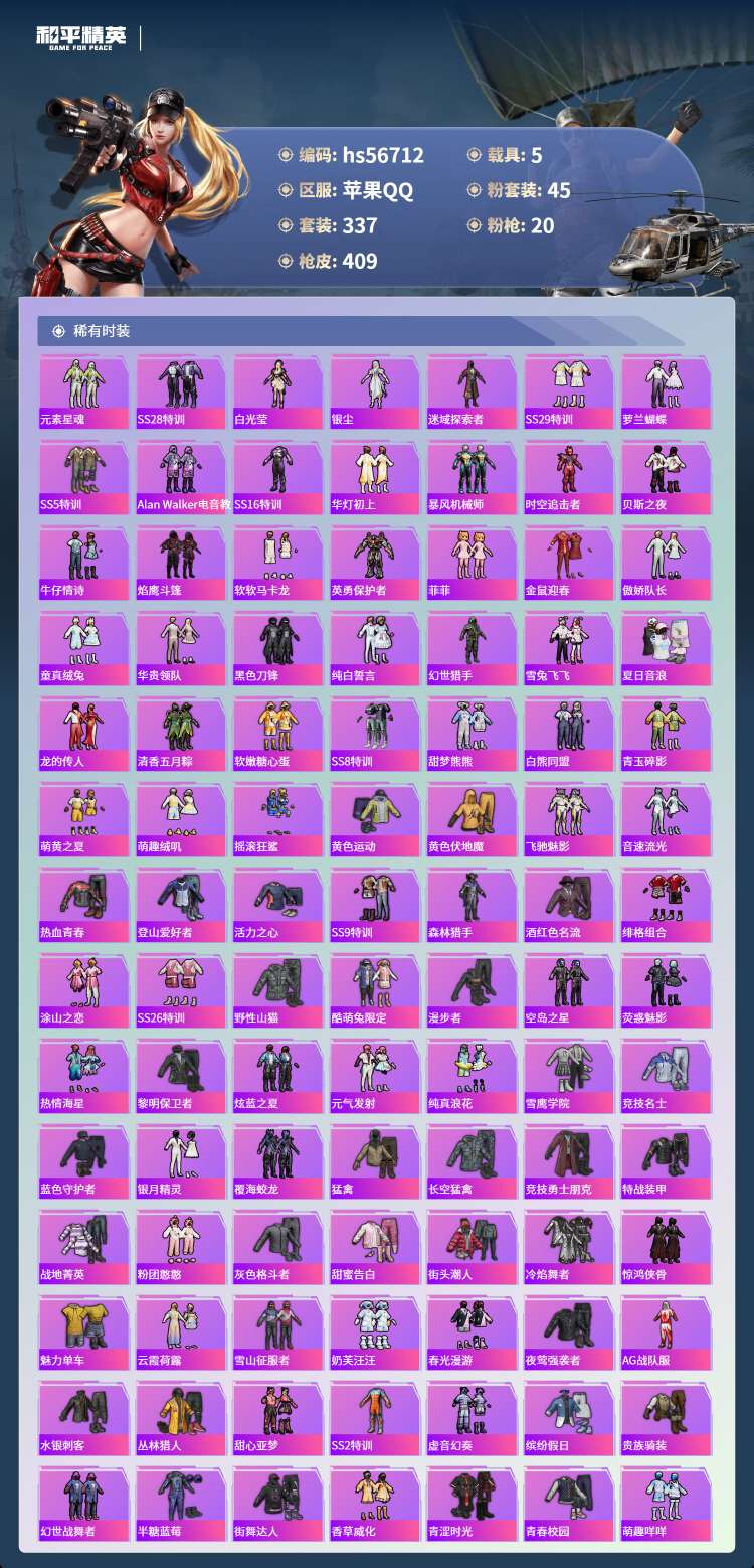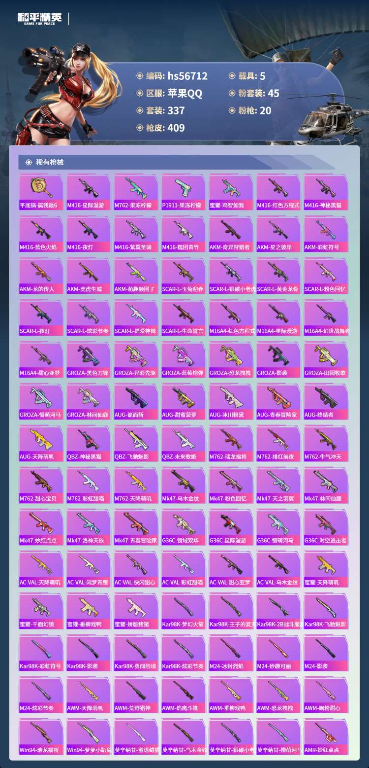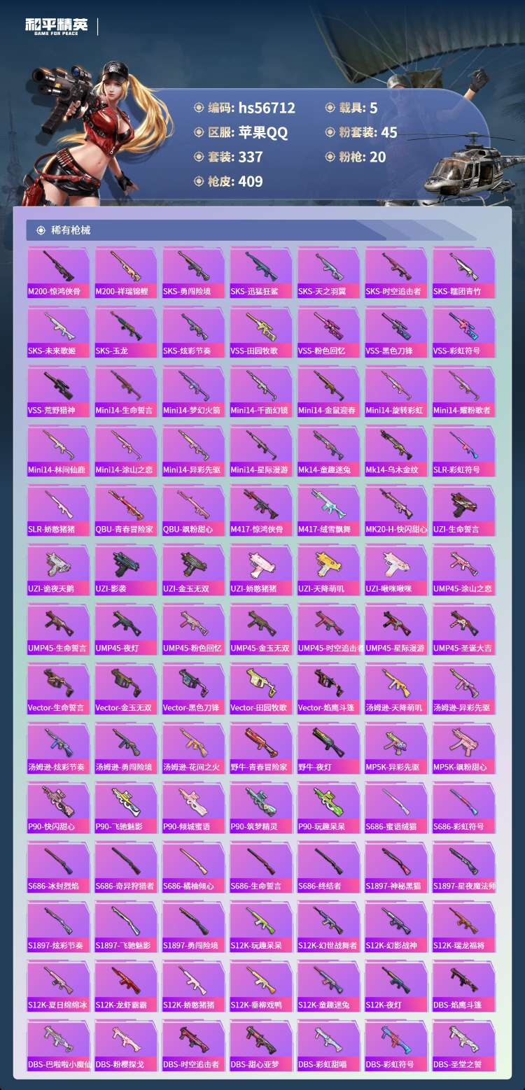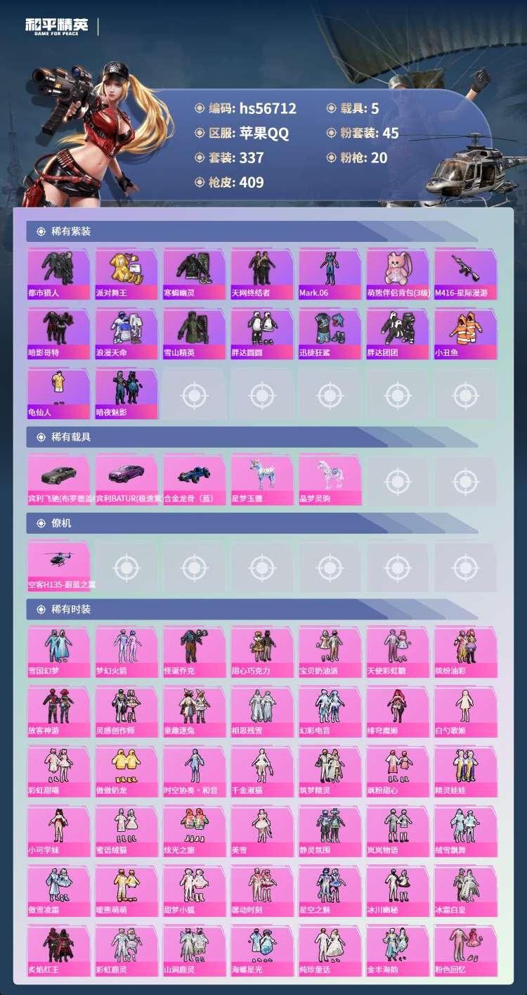 hs56712苹果手Q-19王牌印记-有战神框-45粉装-20特效枪-5载具-155168热力值-3