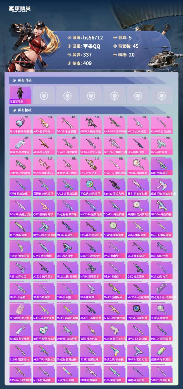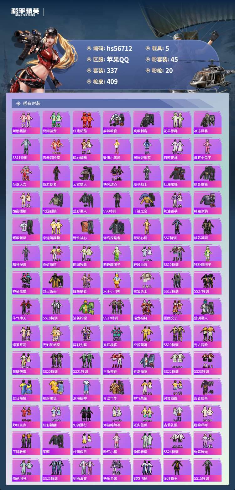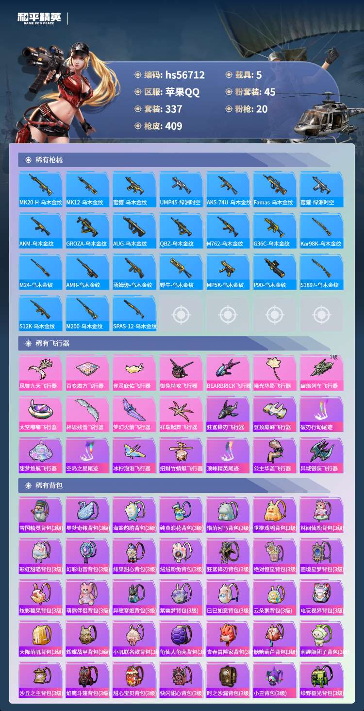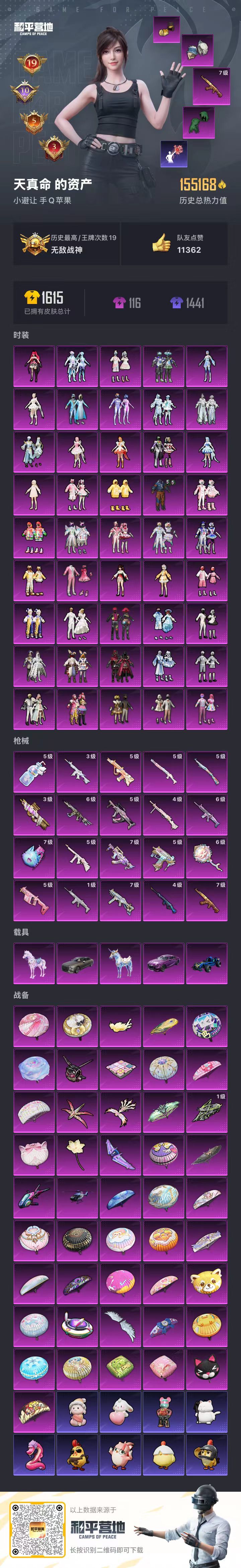 hs56712苹果手Q-19王牌印记-有战神框-45粉装-20特效枪-5载具-155168热力值-3