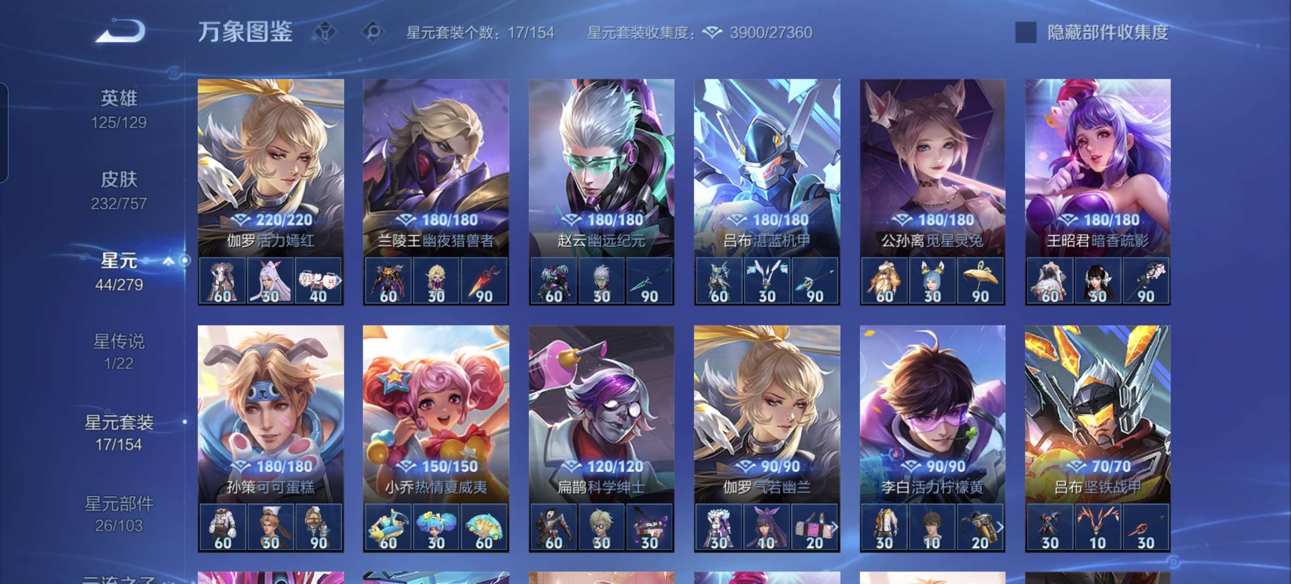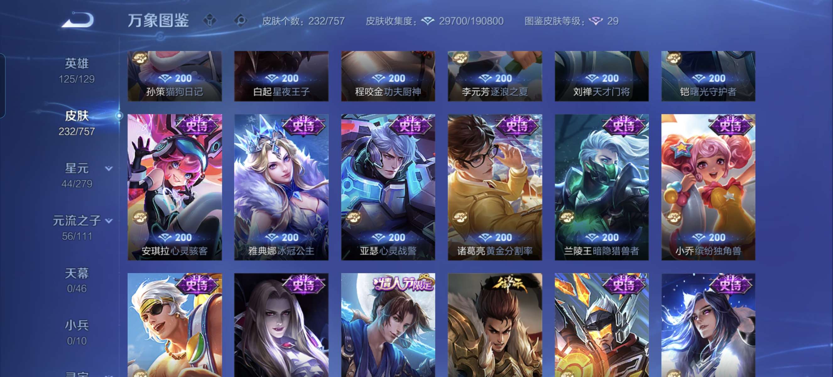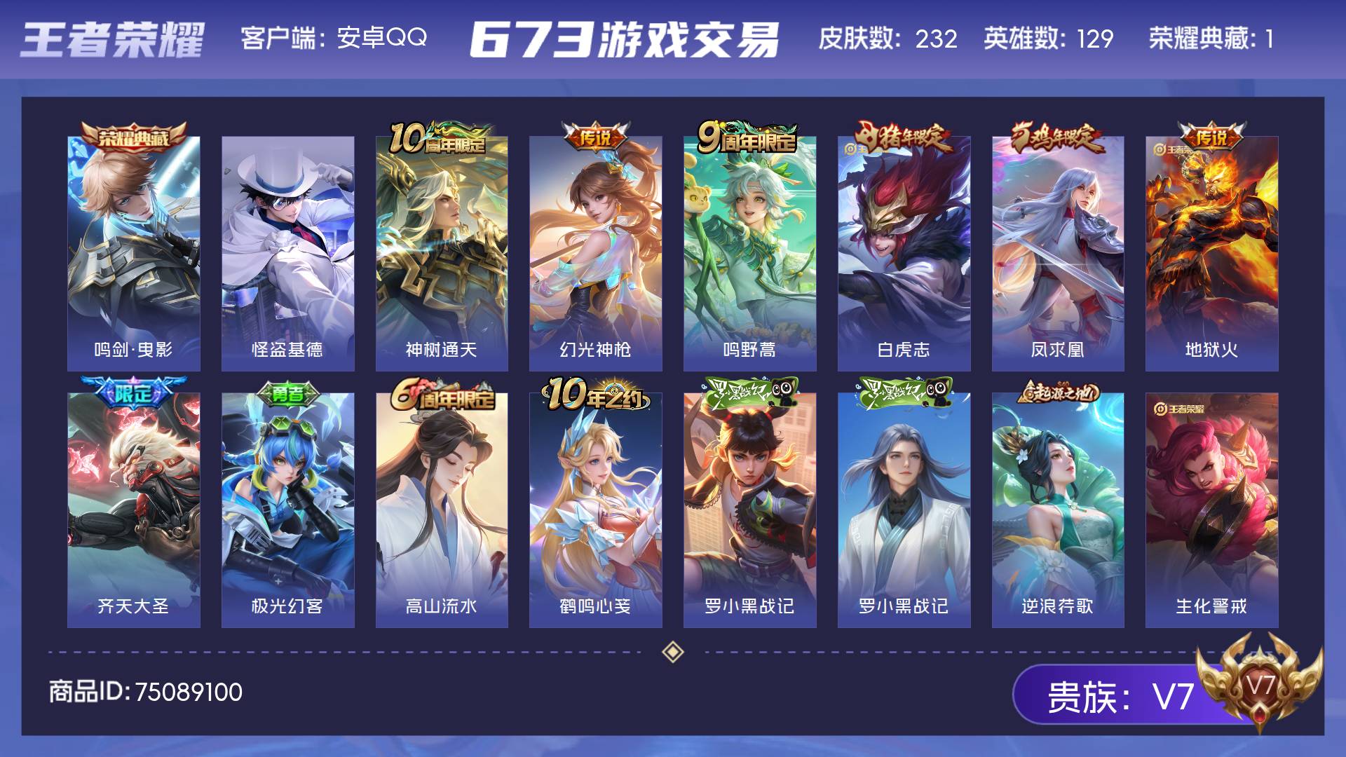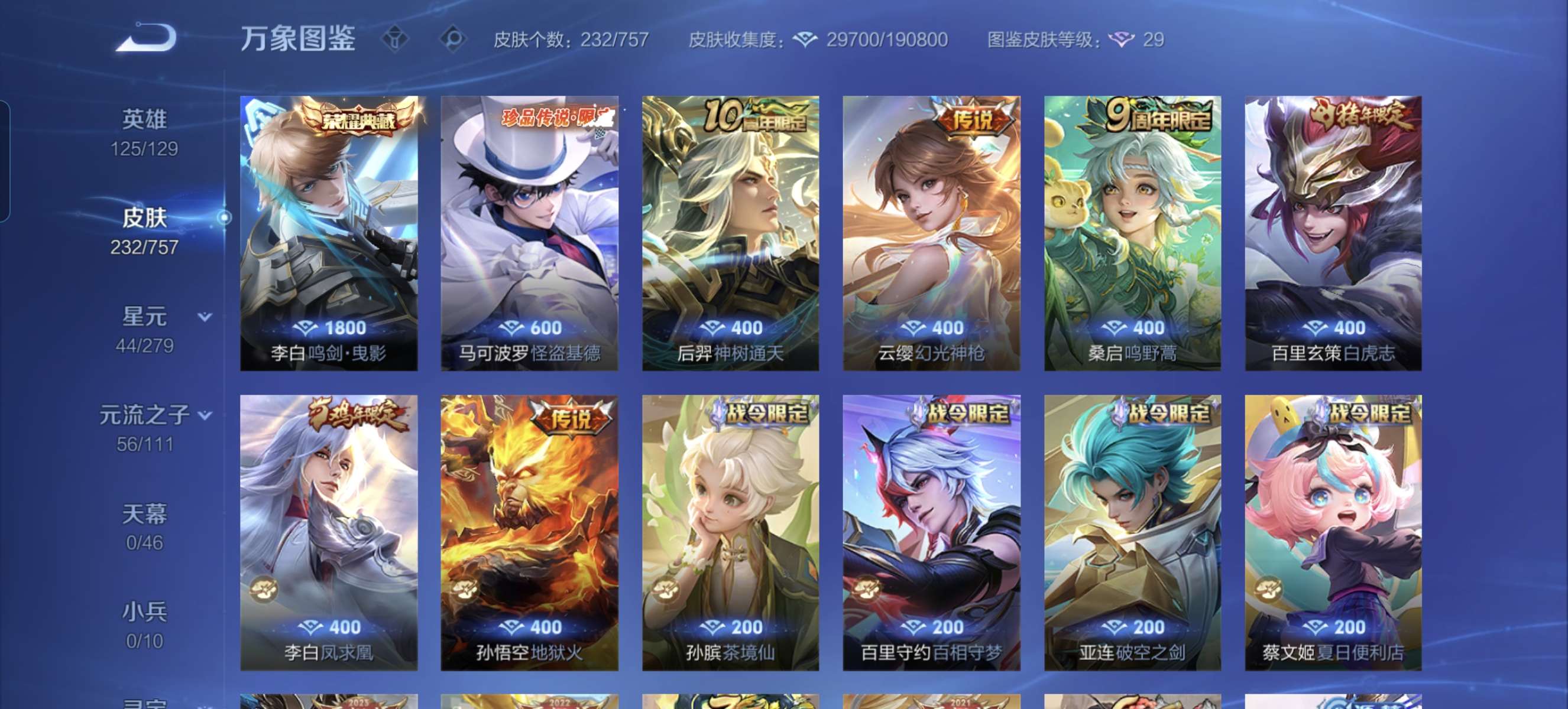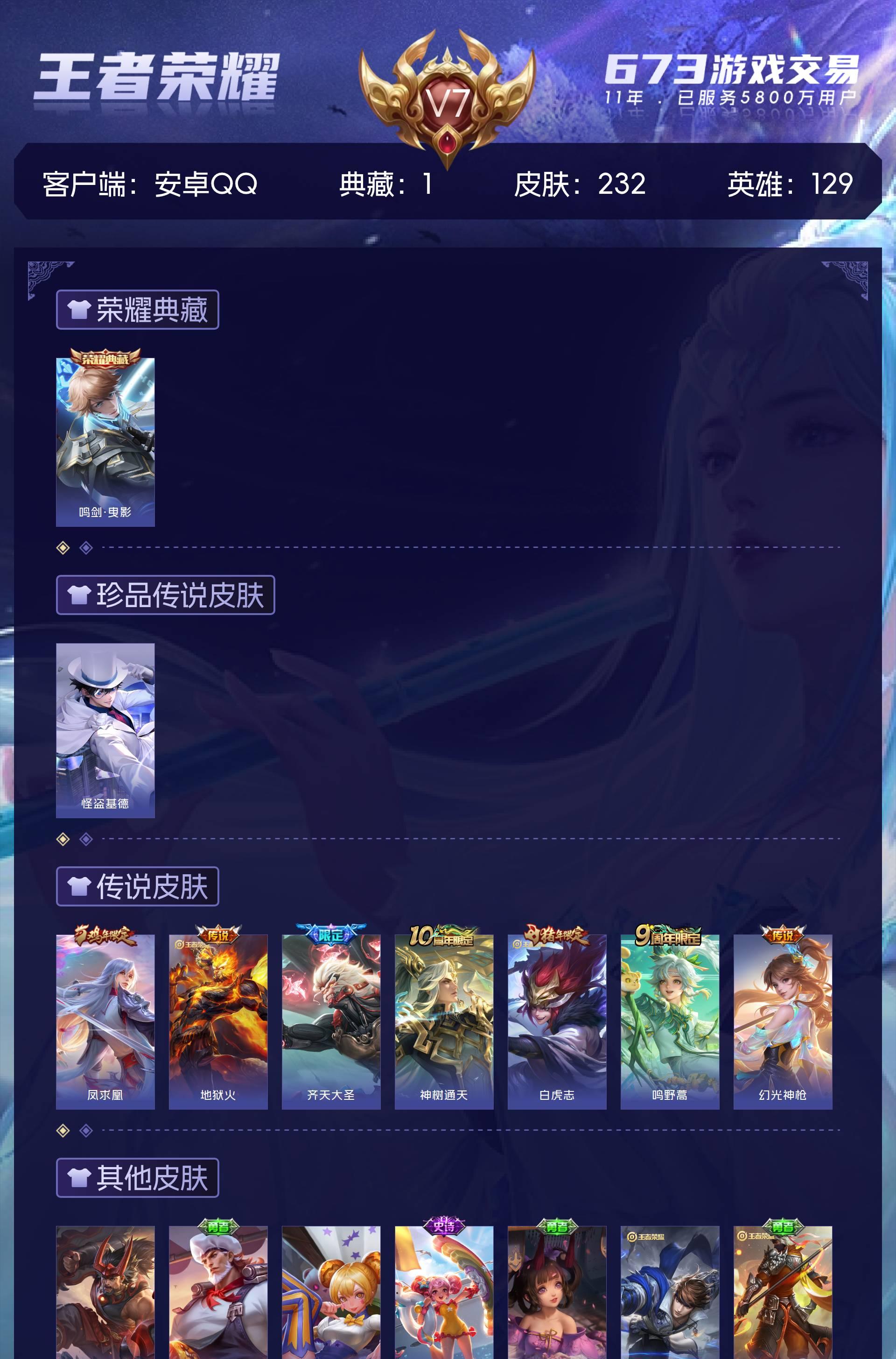 V7 皮肤232 英雄129 荣耀黄金 荣耀典藏1 珍品传说1 星传说1 传说7 其他皮肤230