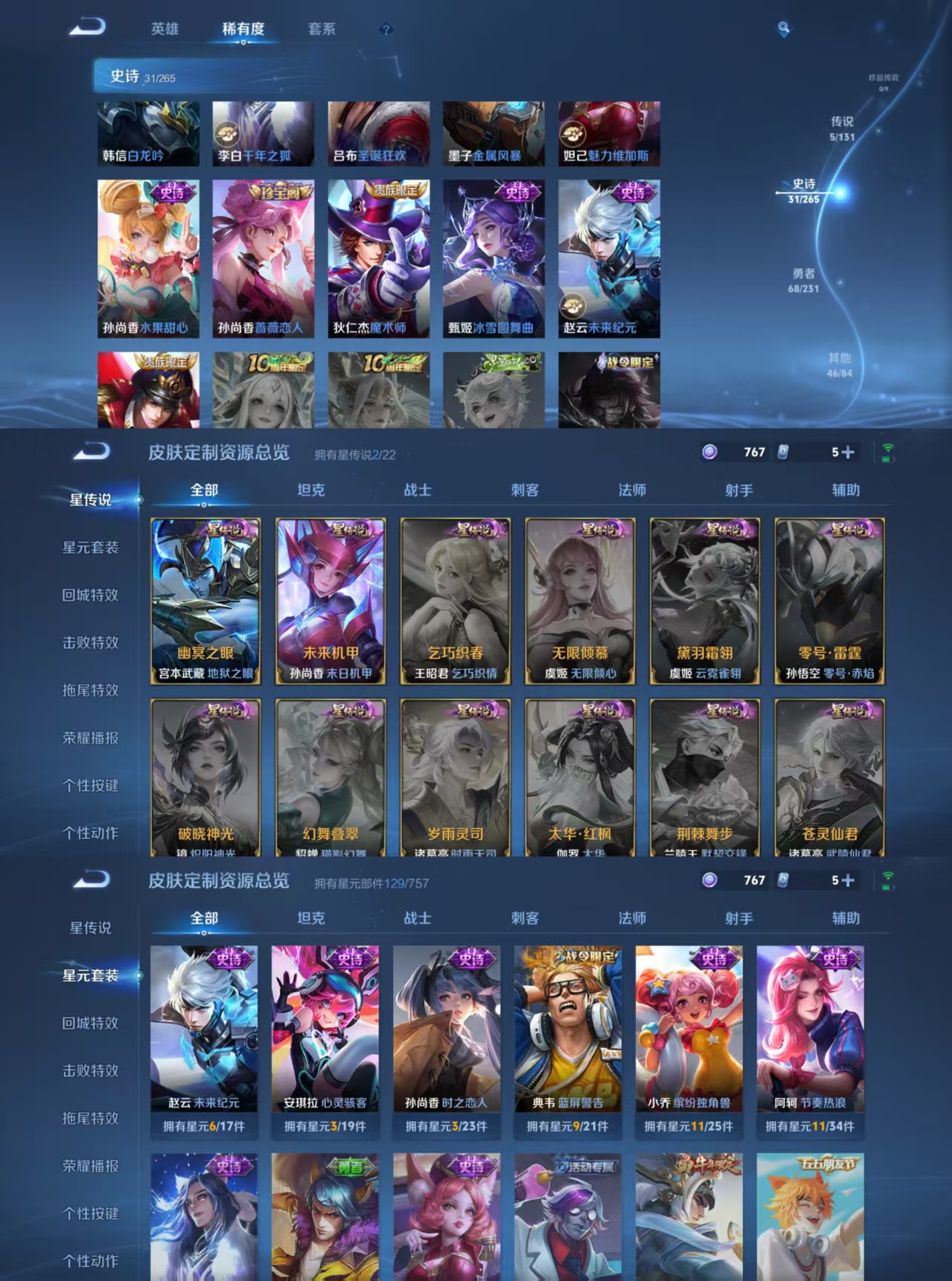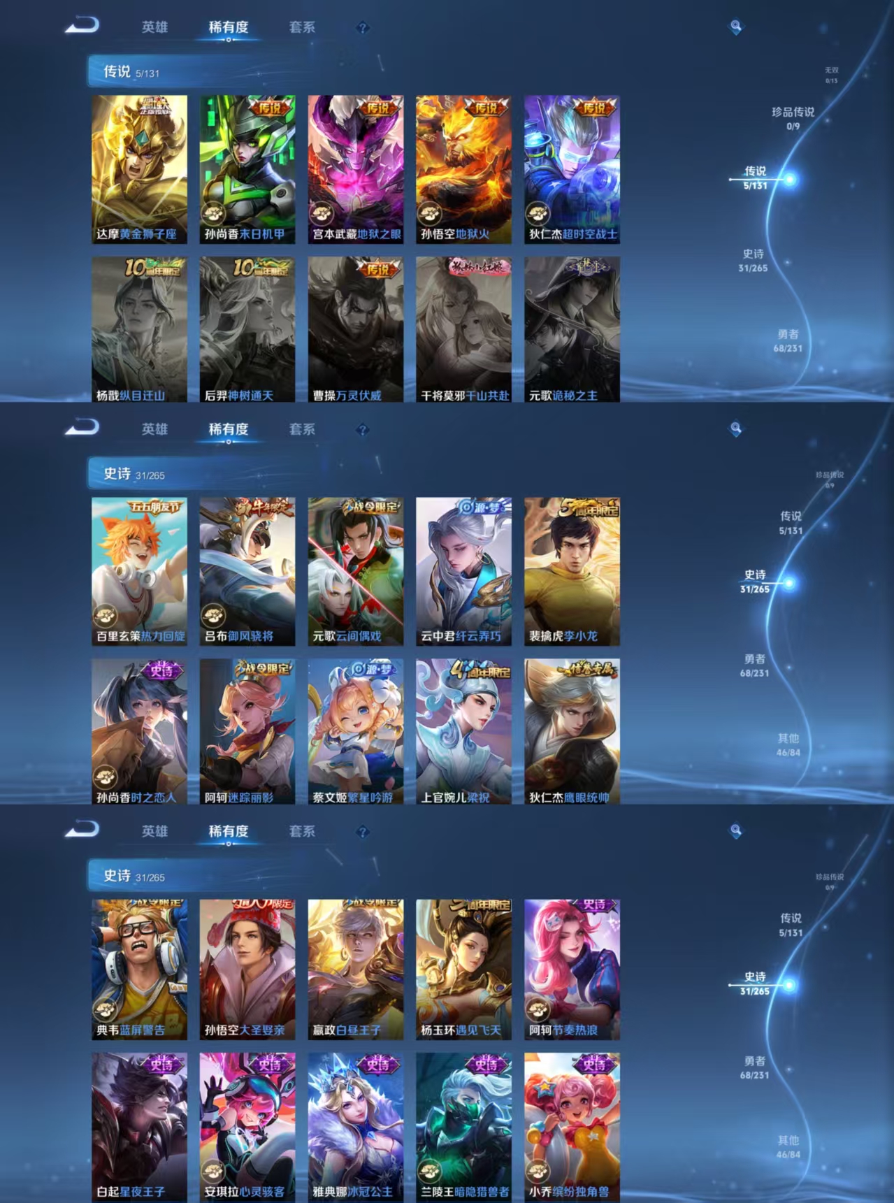 【史诗皮肤】 御风骁将 大圣娶亲 谧流熔炉 威尼斯狂欢 玫蓝誓约 热力回旋 繁星吟游 魅力维加斯 魔术师 鹰眼统帅 蓝屏警告 白龙吟 暗隐猎兽者 千年之狐 圣诞狂欢 金属风暴 梁祝 李小龙 水果甜心 蔷薇恋人 时之恋人 缤纷独角兽 冰冠公主 遇见飞天 白昼王子 云间偶戏 纤云弄巧 皇家上将 冰雪圆舞曲 未来纪元 节奏热浪 迷踪丽影