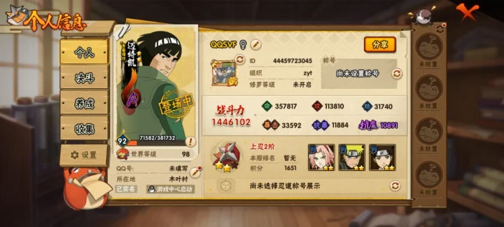 LHY081+【区服】3706【等级】134【S级数量】6【A级数量】17【B级数量】36【C级数量】35【S级】波风水门 自来也「舞之豪杰」 佩恩「天道」 漩涡鸣人·宇智波佐助 宇智波斑「秽土转生·解」 宇智波带土「忍界大战」【A级】宇智波鼬 宇智波佐助「须佐能乎」 我爱罗「疾风传」 漩涡鸣人「九尾查克拉」 地陆 长门「青年」 迈特凯 宇智波泉奈 蝎 飞段「死司凭血」 宇智波鼬「夏日限定」 迪达拉 干柿鬼鲛 漩涡博人「桃式显现」 猿飞阿斯玛 日向宁次「忍界大战」 迈特凯「青春爆炸」【B级】夕日