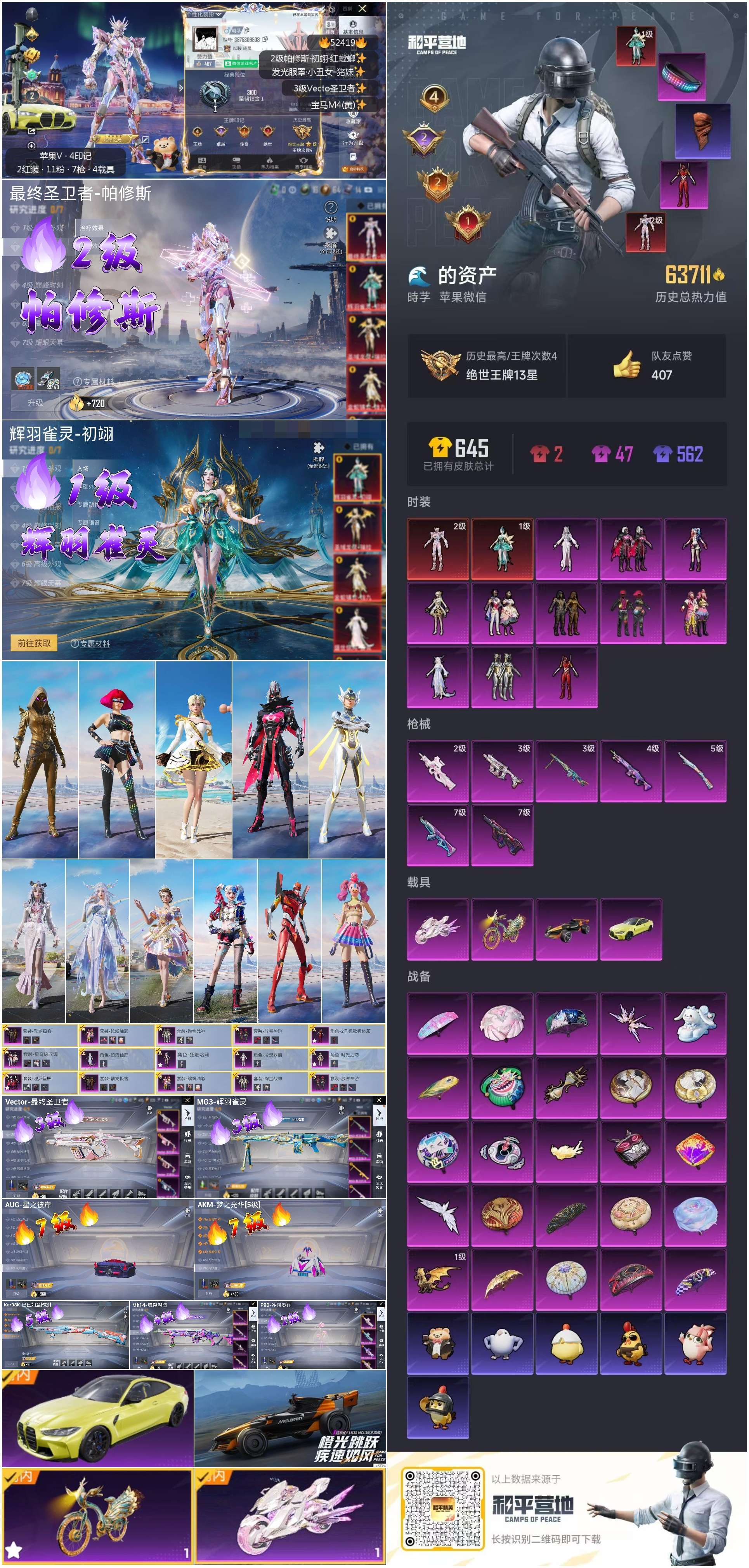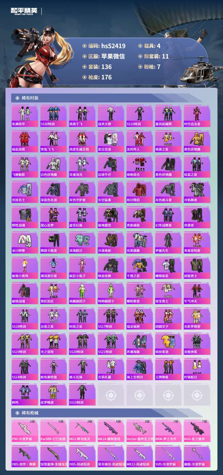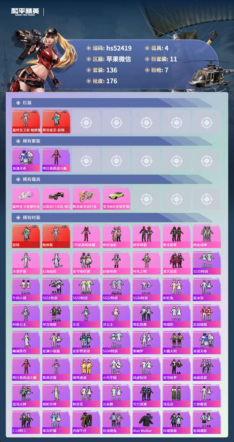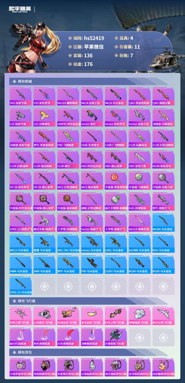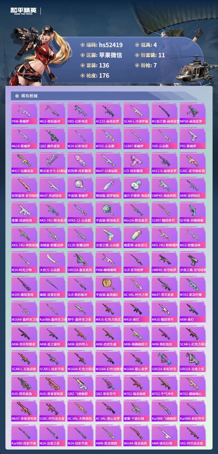hs52419 苹果微-4王牌印记-2红装-11粉装-7特效枪-4载具-65395热力值-136套