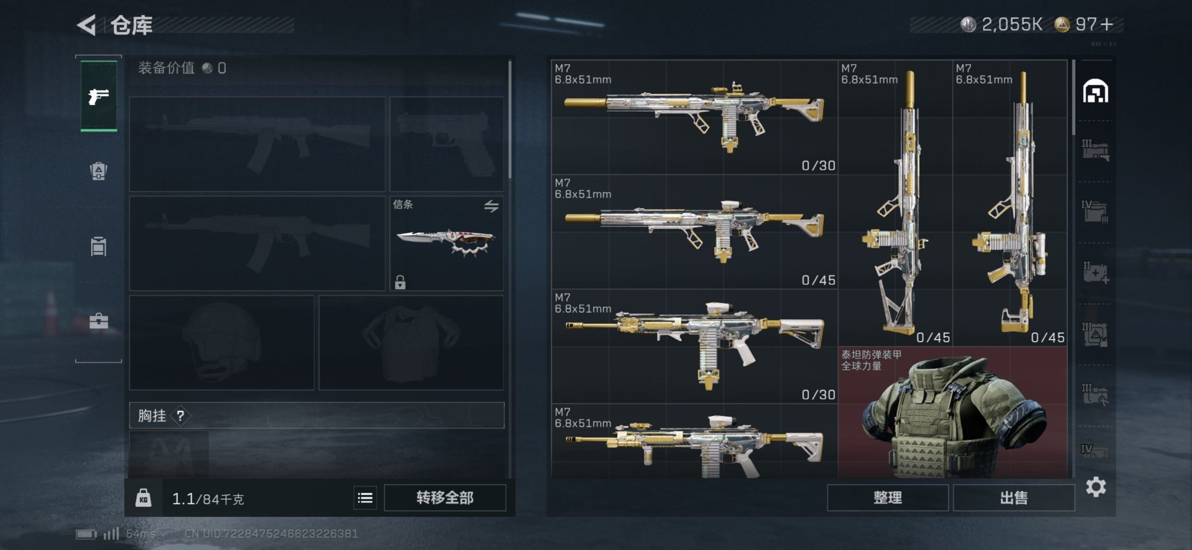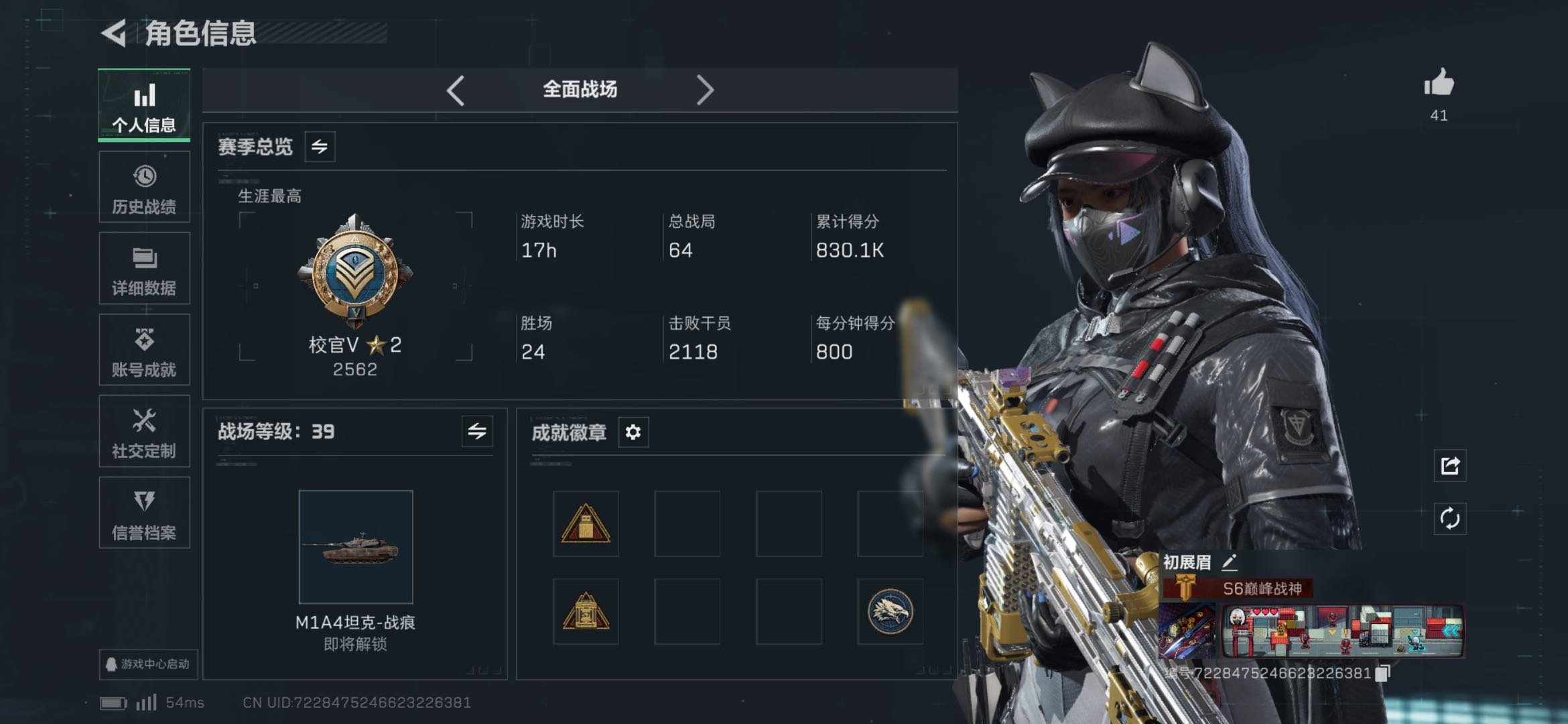 总资产116.3M,哈夫币 2056K,战场等级:39 上等兵,行动等级:60 黑鹰,角色皮肤5,枪