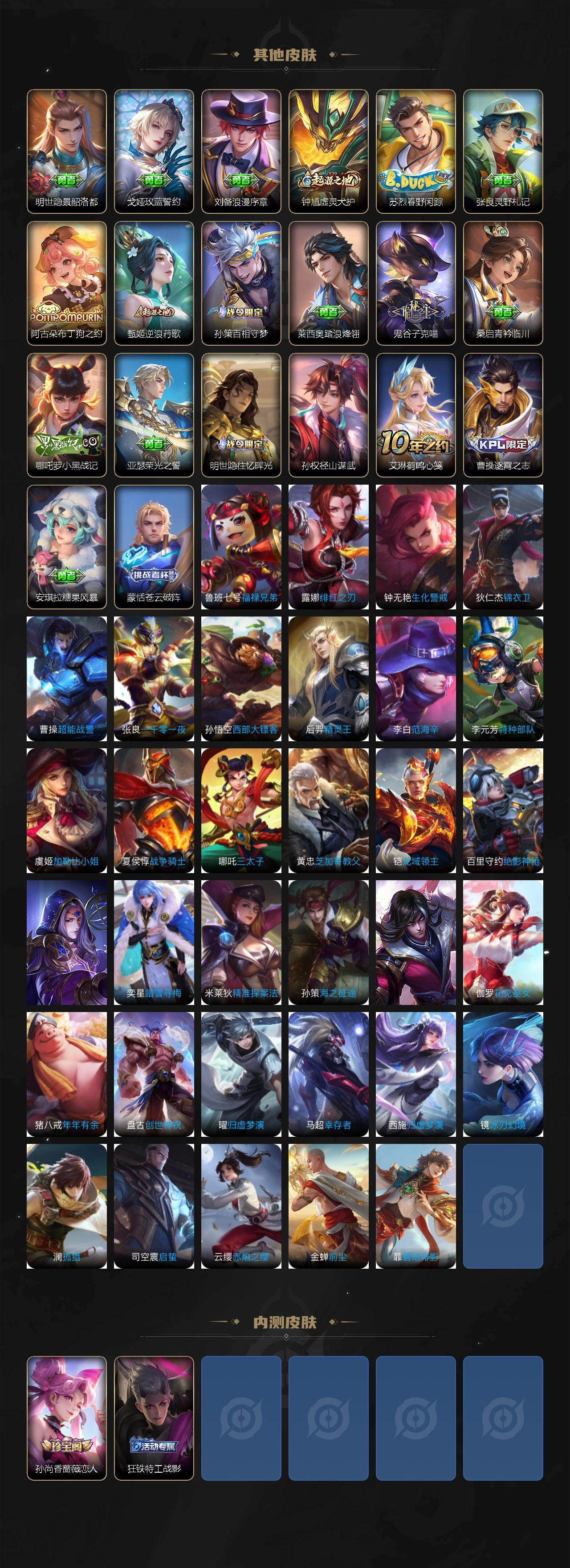【限定皮肤】:姜子牙天穹之誓,狄仁杰阴阳师,赵云皇家上将,墨子神迹守卫,孙尚香蔷薇恋人,阿轲迷踪丽影,典韦岱宗,马可波罗山海玄木吟,狄仁杰万华元夜,达摩沙漠行僧,项羽海滩派对,老夫子醍醐杖