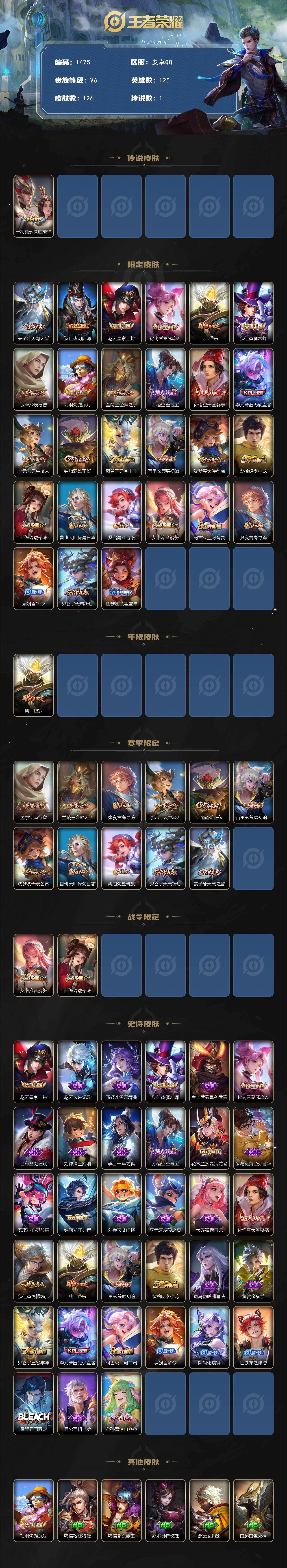 【126皮1传说(还有3000多星币) 至尊宝大圣娶亲小号 久胜战神 玲珑珍味 流音漫舞 匿光侦查者】安卓Q-V6-最强王者段位-125英雄-126皮肤-1传说-33史诗