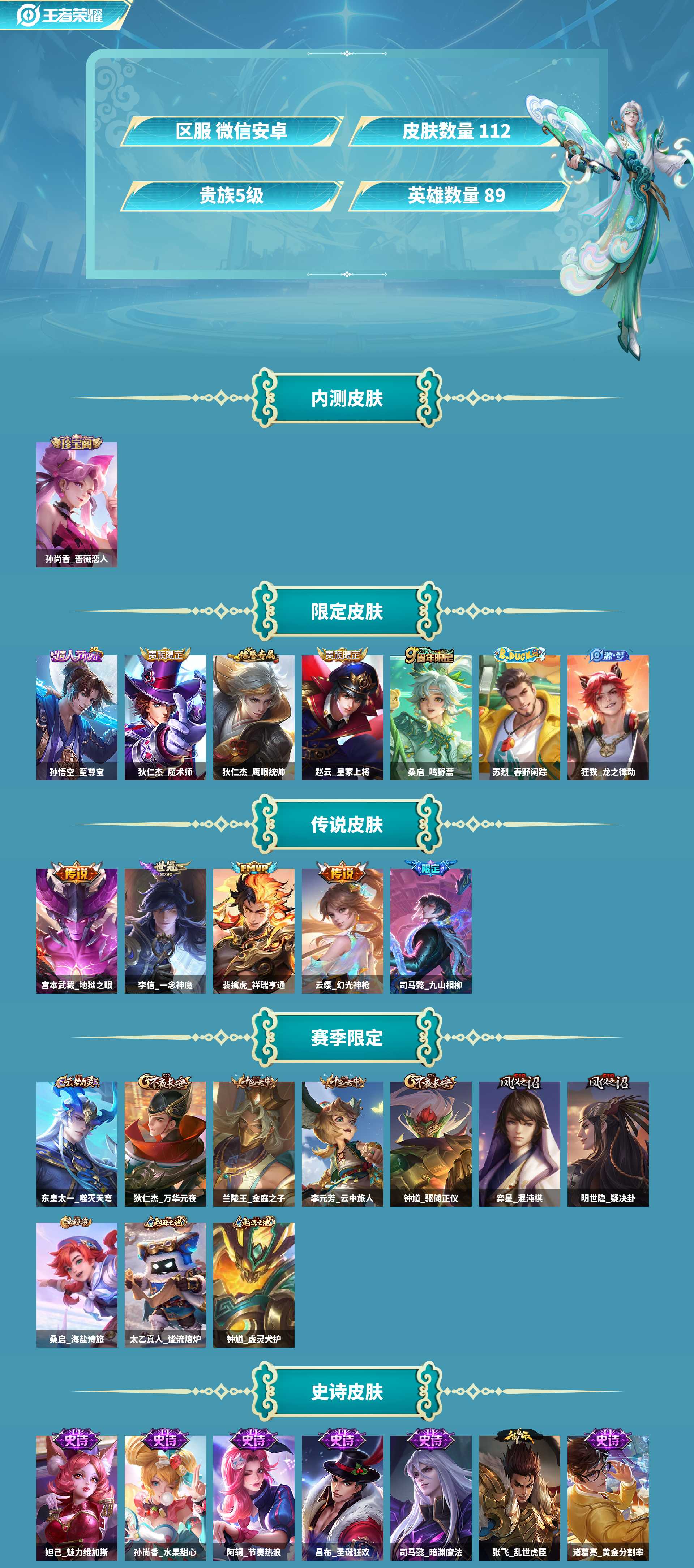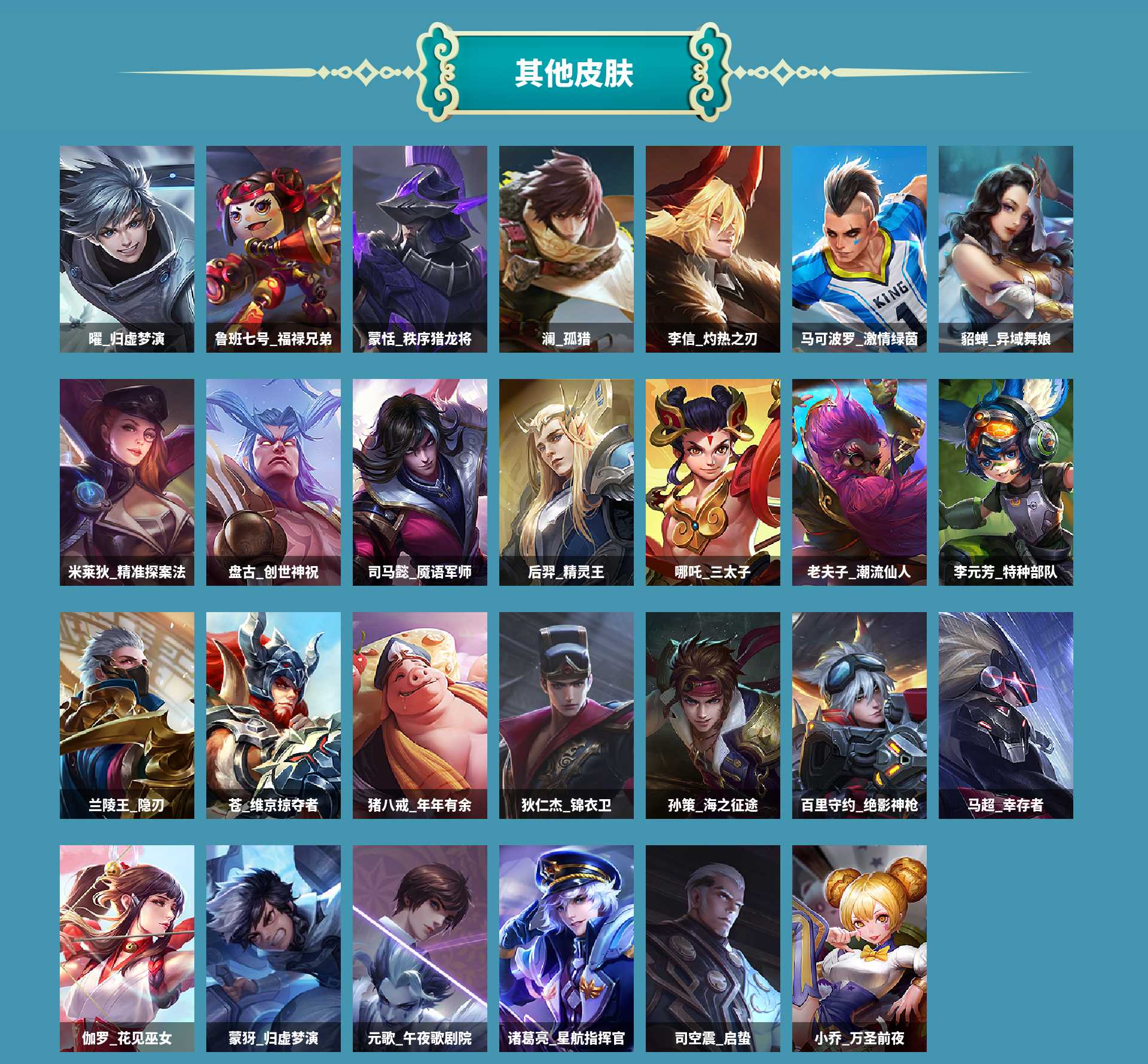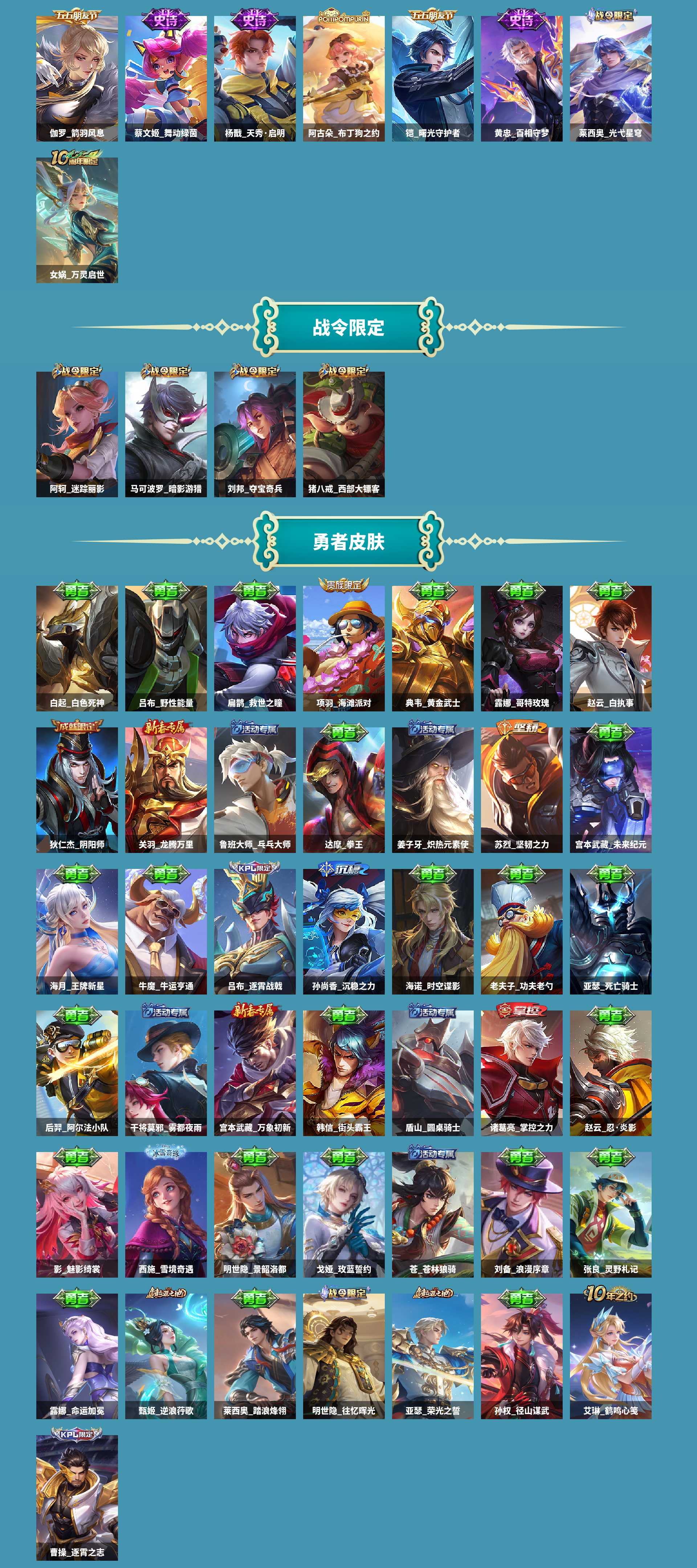传说皮肤:李信一念神魔,宫本武藏地狱之眼,司马懿九山相柳,云缨幻光神枪,裴擒虎祥瑞亨通,桑启鸣野蒿,铠曙光守护者 至尊宝