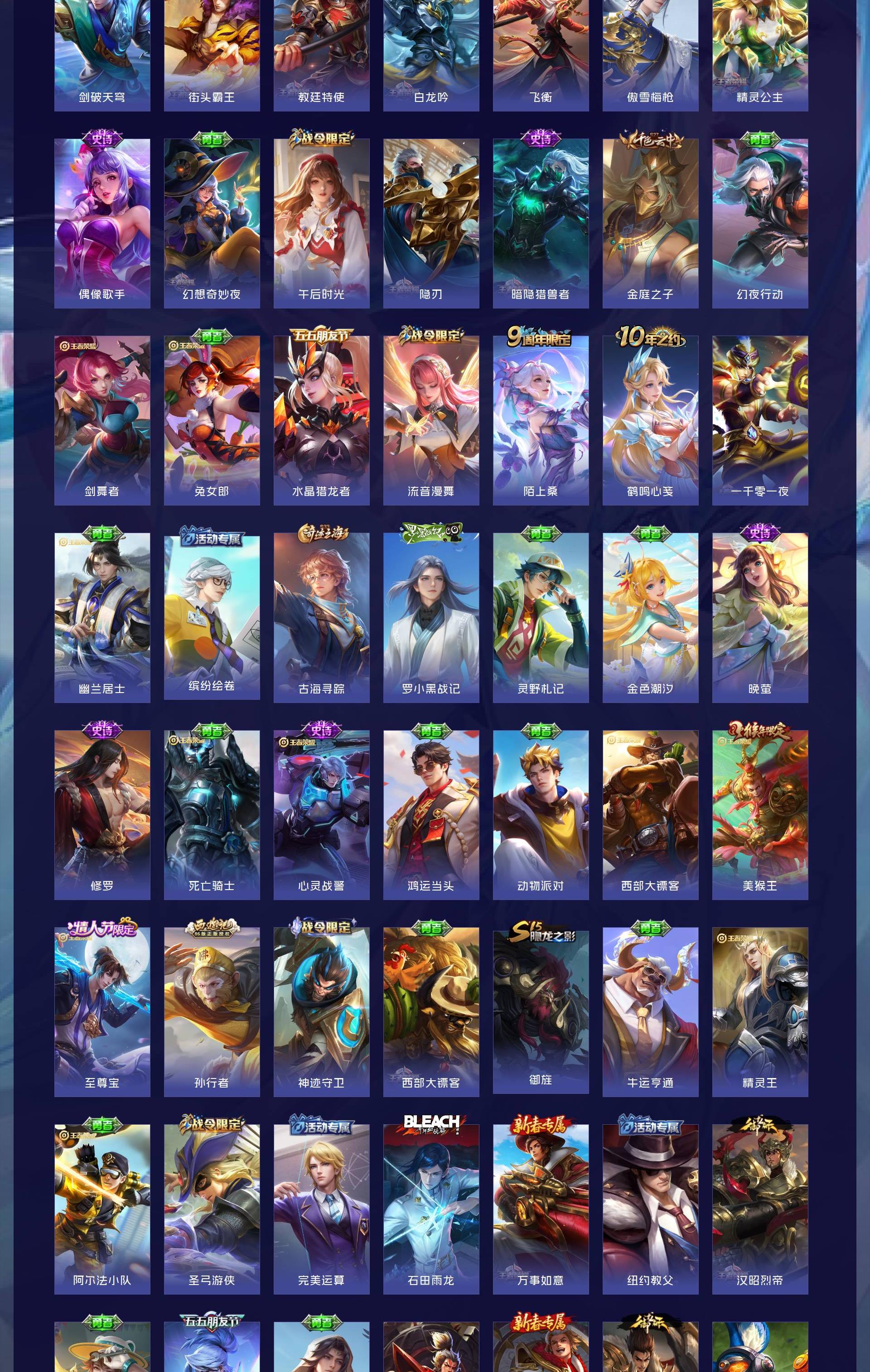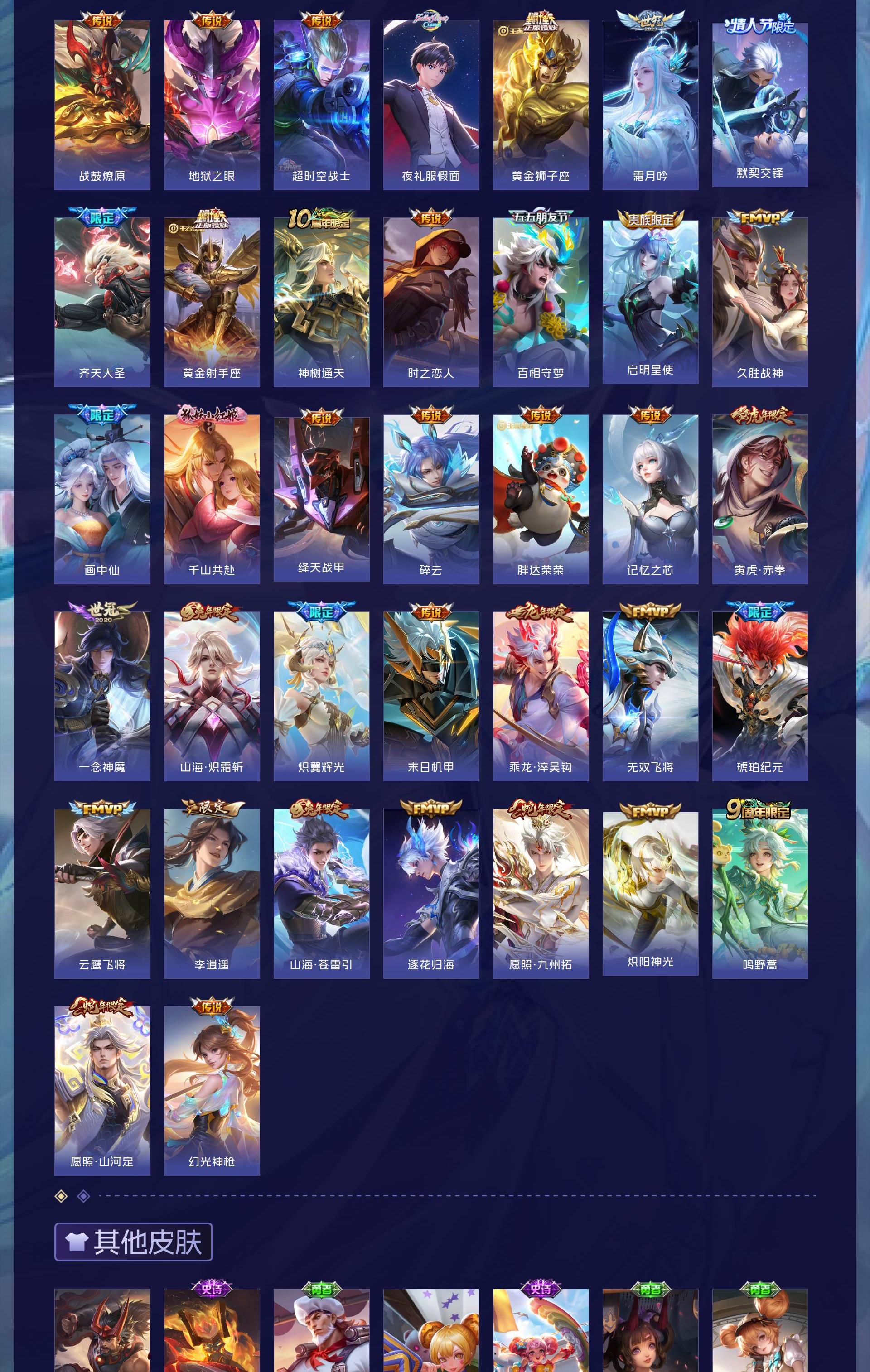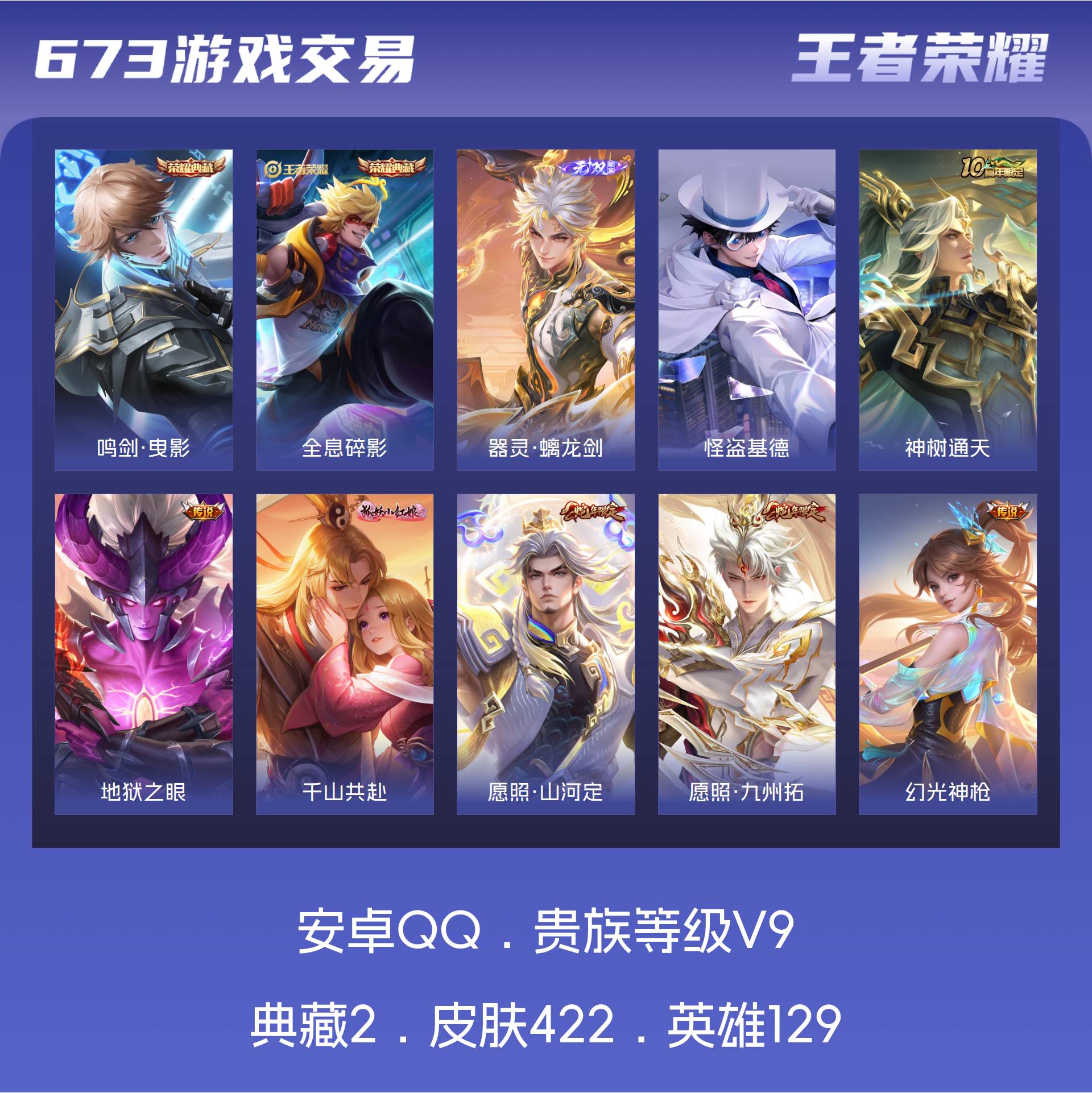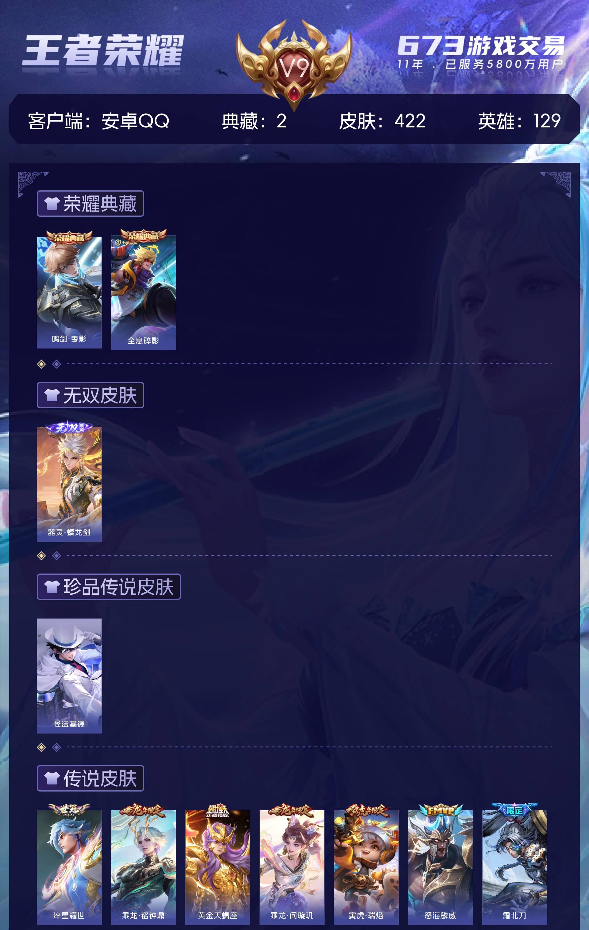 V9 皮肤422 英雄129 永恒钻石 荣耀典藏2 无双皮肤1 珍品传说1 传说44 其他皮肤379