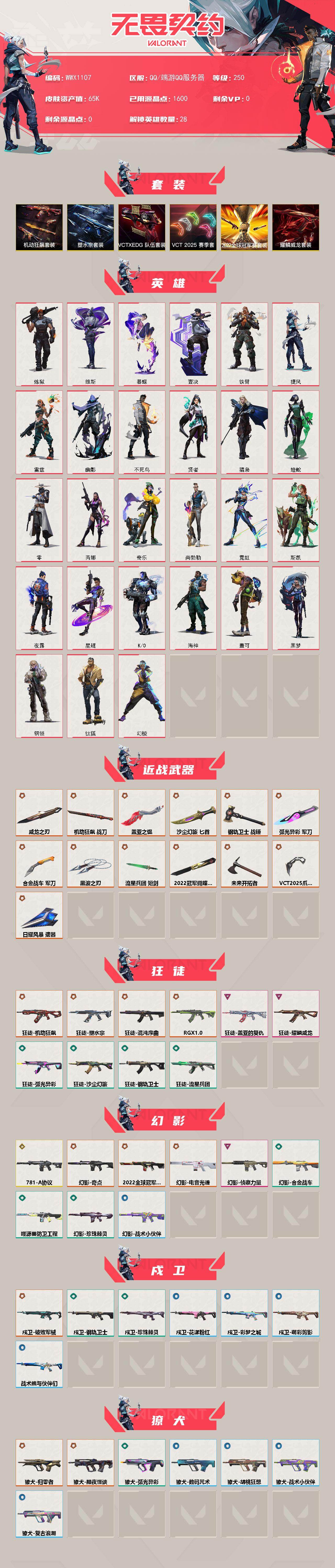 【WWX1107】终极*33/传奇*1/卓越*6/皮肤*128/等级*250/段位:未定级/2022全球冠军赛套装/VCT 2025 赛季套装/塑水宗套装/机动狂飙套装/VCTxEDG 队伍套装/耀鳞威龙套装/幻棱/炼狱/维斯/暮蝶/钛狐/壹决/铁臂/捷风/雷兹/幽影/不死鸟/贤者/猎枭/蝰蛇/零/芮娜/奇乐/尚勃勒/霓虹/斯凯/夜露/星礈/K/O/海神/盖可/黑梦/钢锁/近战武器-2022全球冠军赛 蝴蝶刀/近战武器-VCT 2025 爪刀/近战武器-黑波之刃/近战武器-威龙之刃/近战武器-未