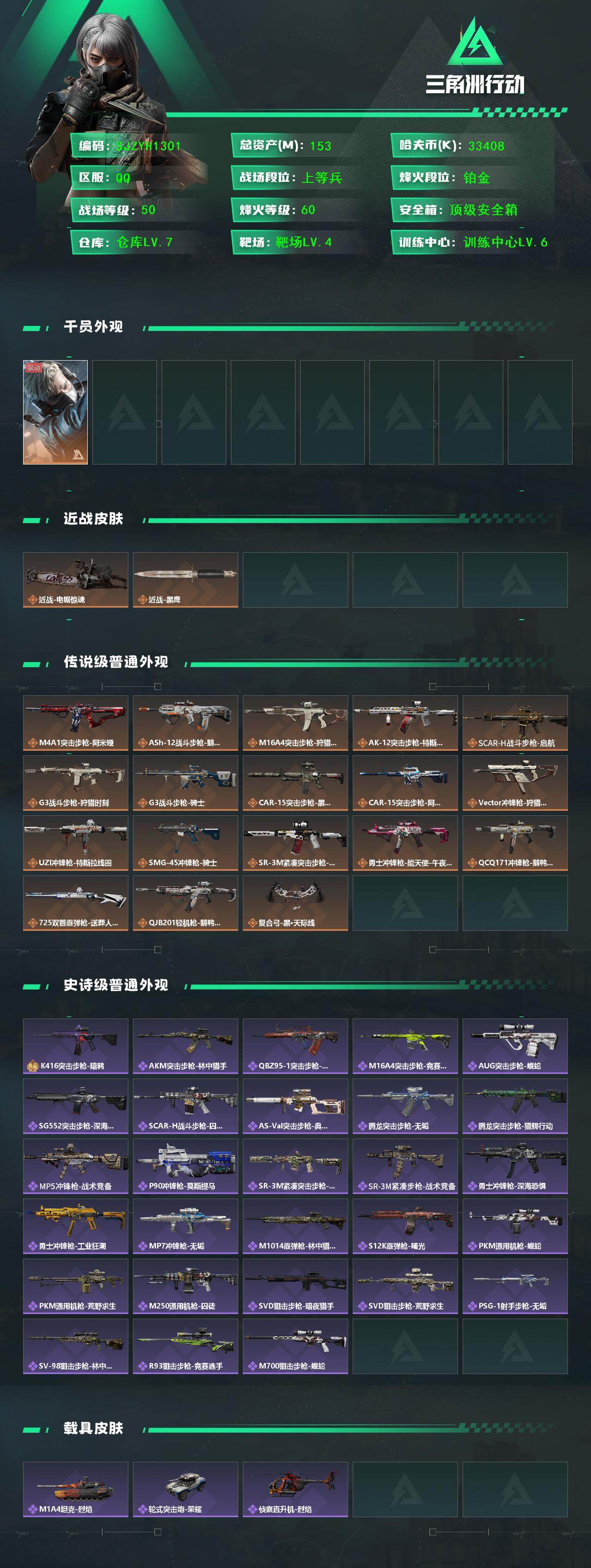 【SJZYH1301】总资产(M):153M/哈夫币(K):33408K/哈夫币(K):33408K/传说枪皮数:18/全面战场等级:50_段位:上等兵/烽火地带等级:60_段位:铂金/蜂医-送葬人·无题密令/近战-电锯惊魂/近战-黑鹰/M4A1突击步枪-阿米娅/ASh-12战斗步枪-鹅鸭杀/M16A4突击步枪-狩猎时刻/AK-12突击步枪-特斯拉线圈/SCAR-H战斗步枪-启航/G3战斗步枪-狩猎时刻/G3战斗步枪-骑士/CAR-15突击步枪-黑鹰坠落/CAR-15突击步枪-阿米娅/Vecto