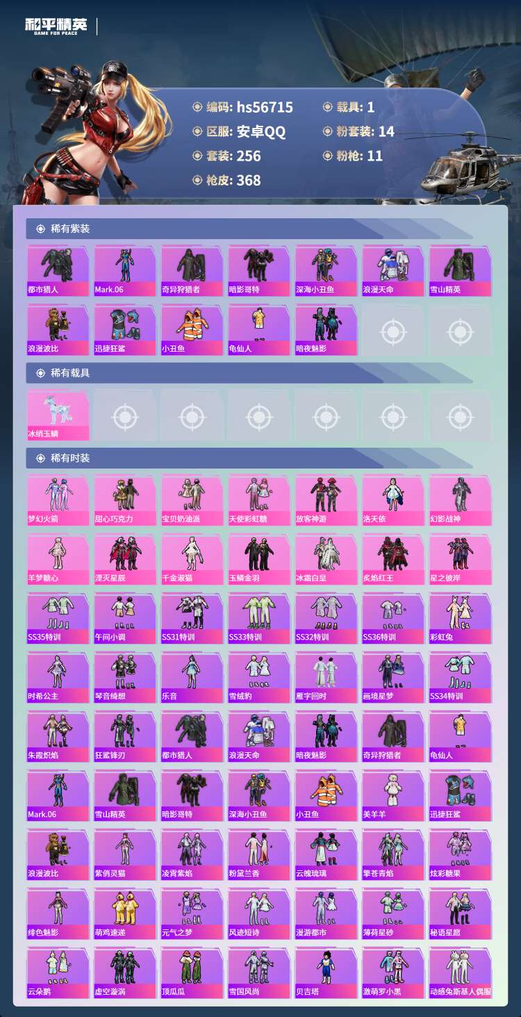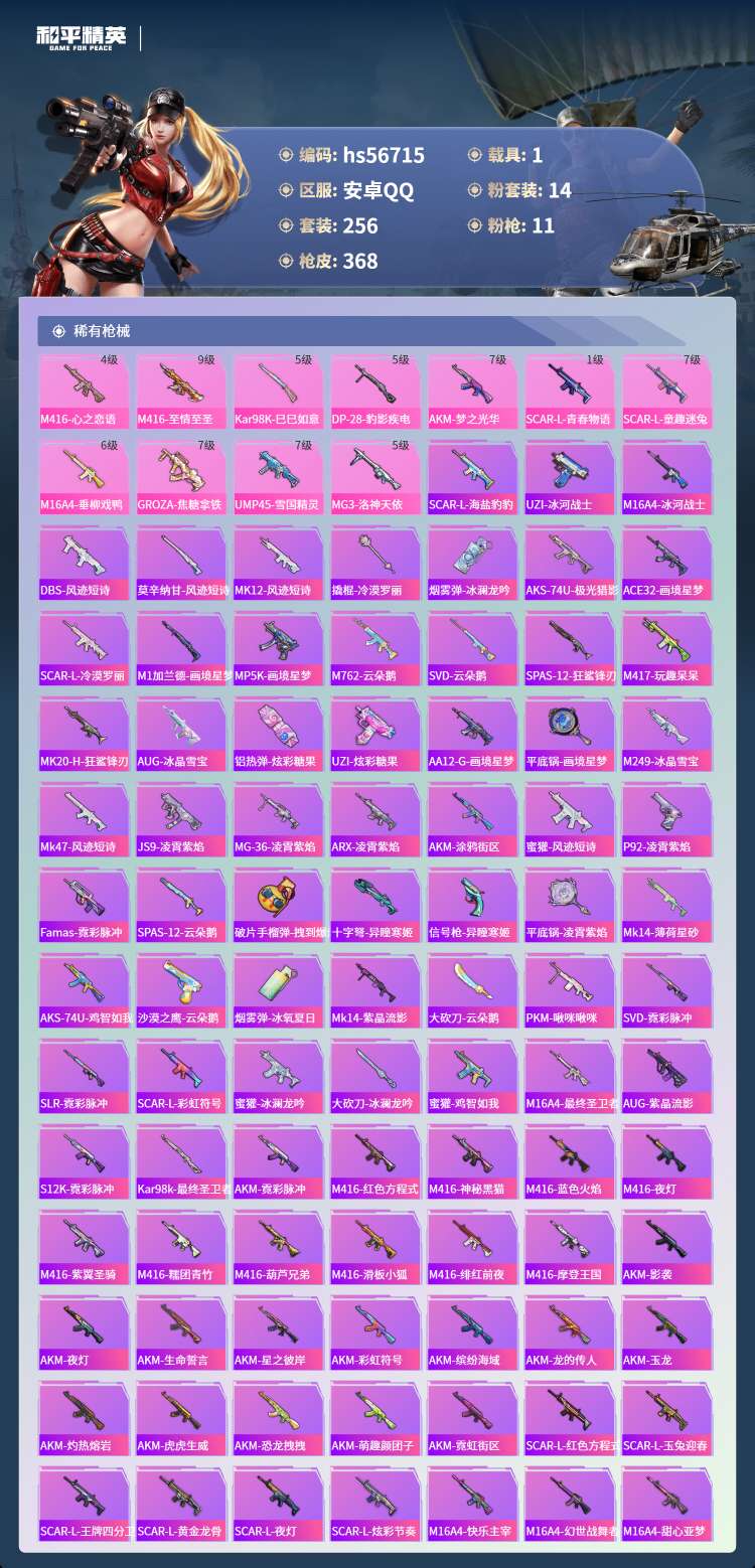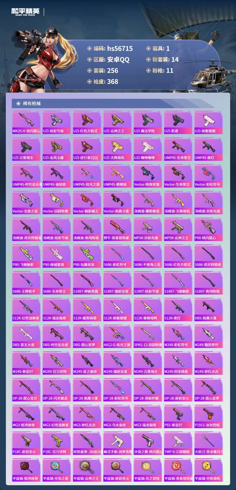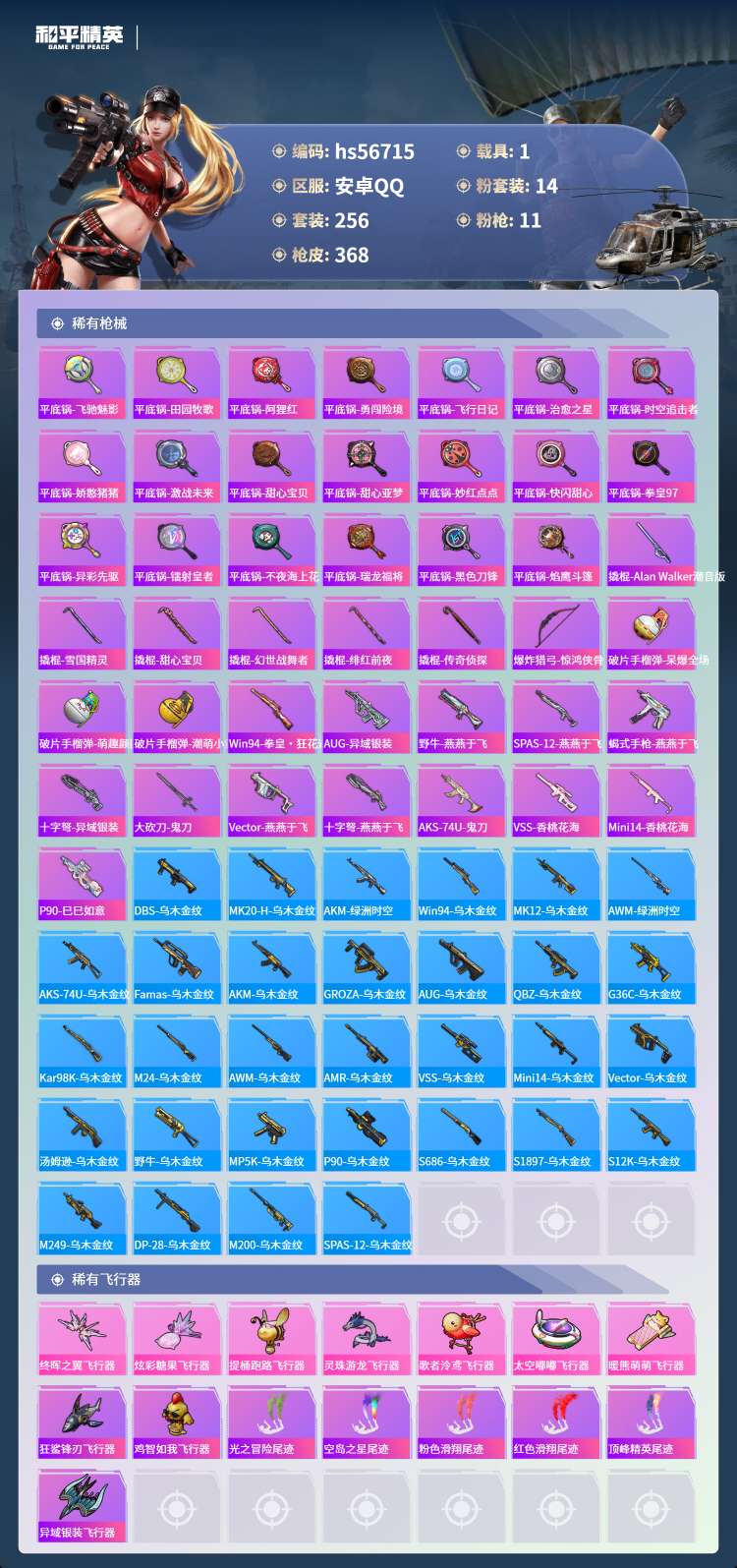 hs56715安卓手Q-20王牌印记-有战神框-14粉装-11特效枪-1载具-118405热力值-2