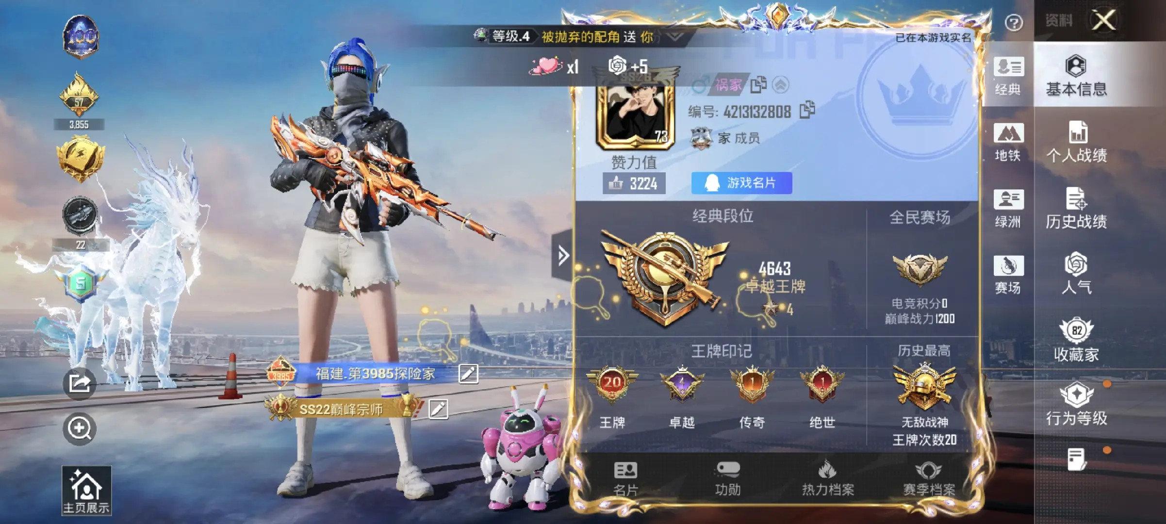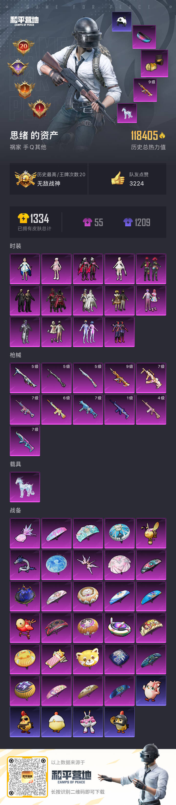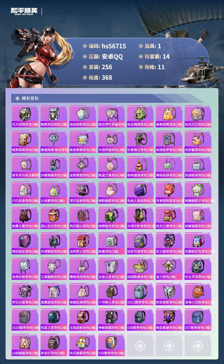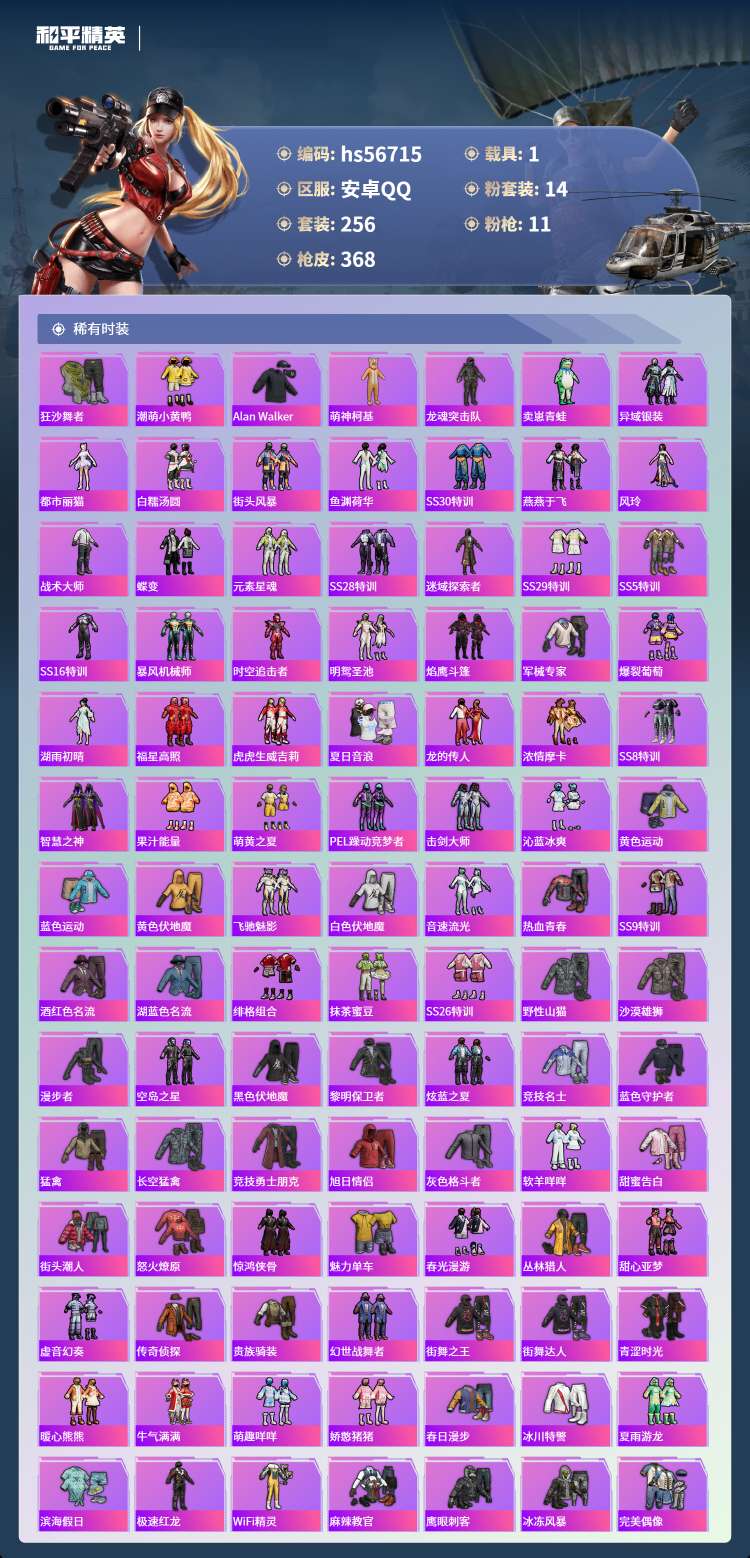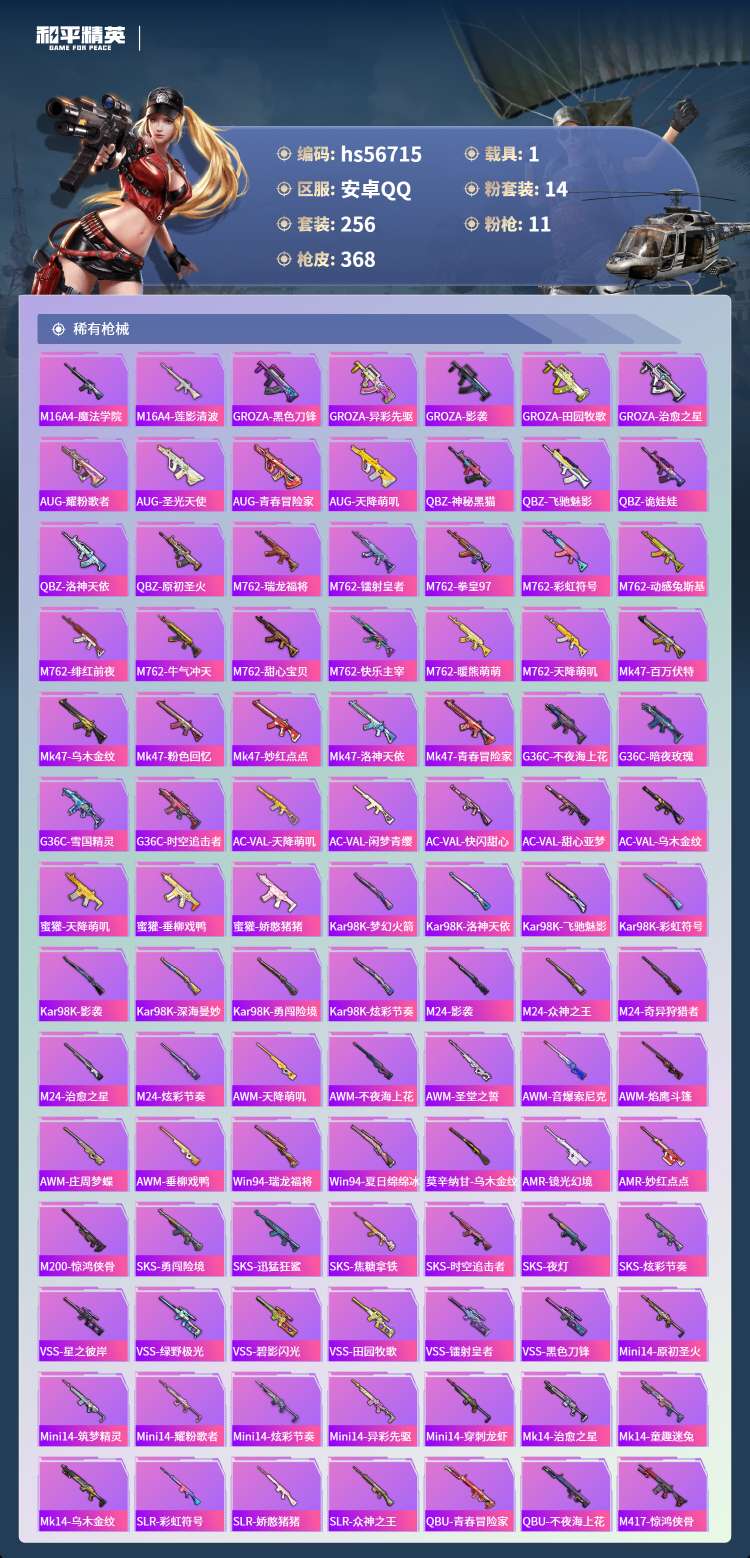 hs56715安卓手Q-20王牌印记-有战神框-14粉装-11特效枪-1载具-118405热力值-2