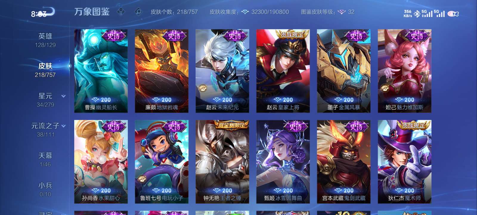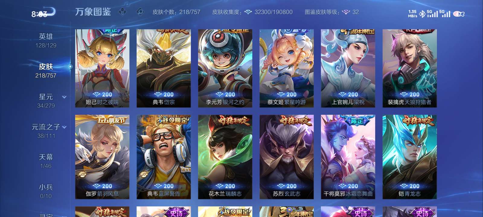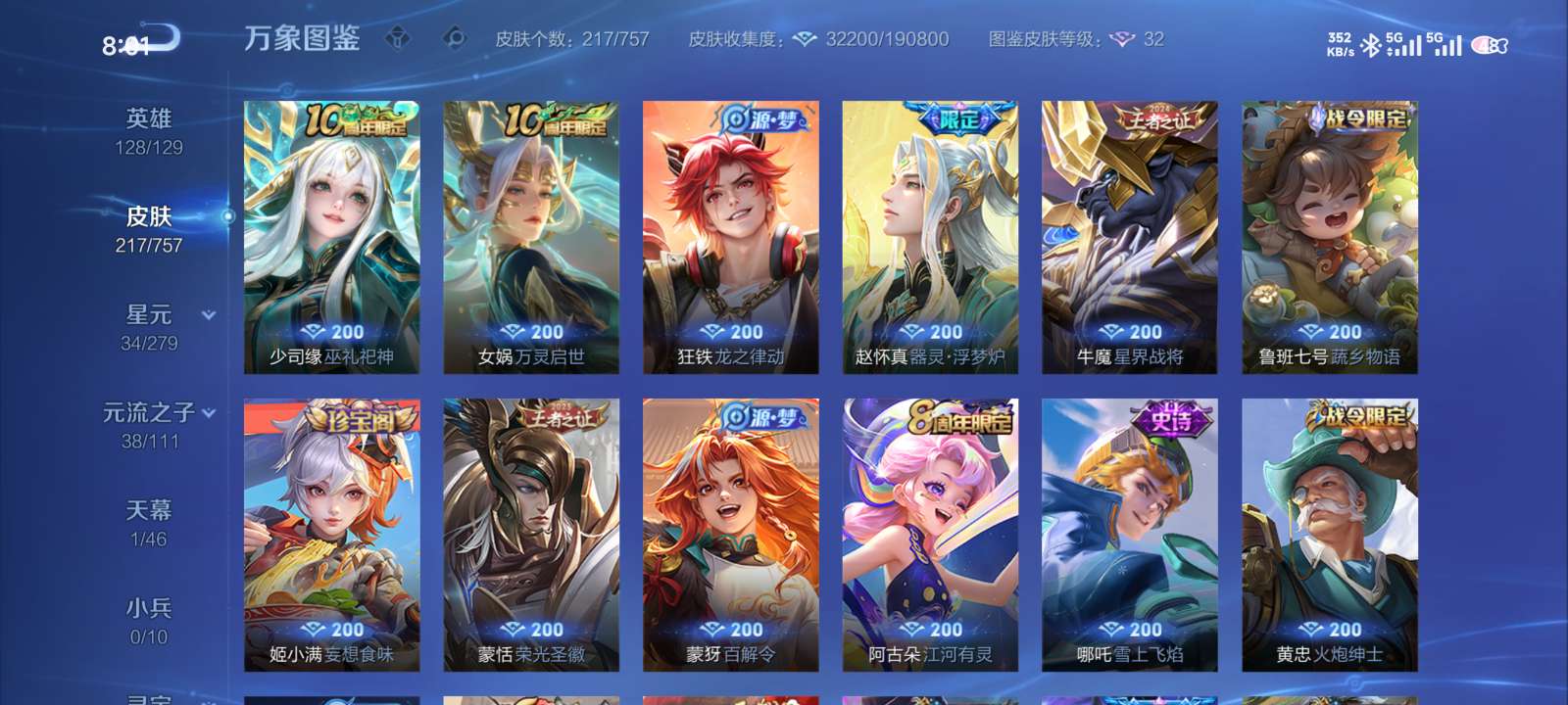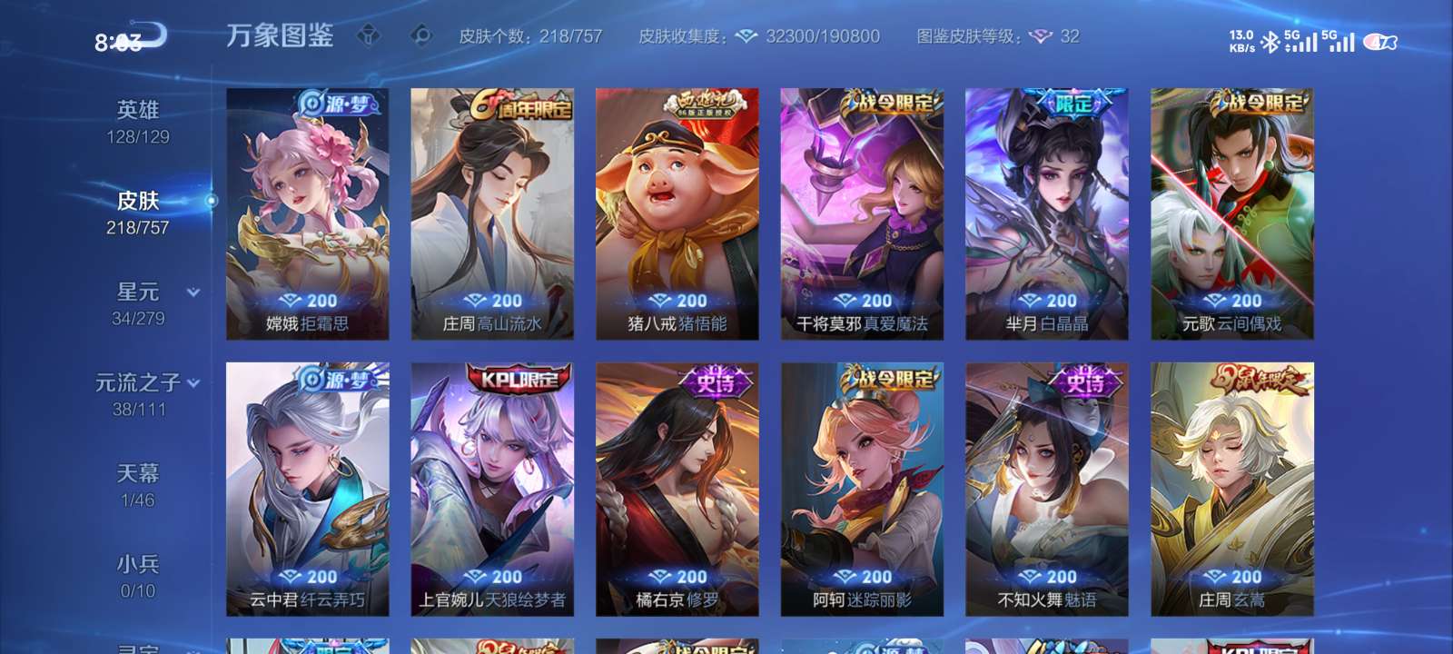 多皮肤账号,荣耀水晶加猪年全满