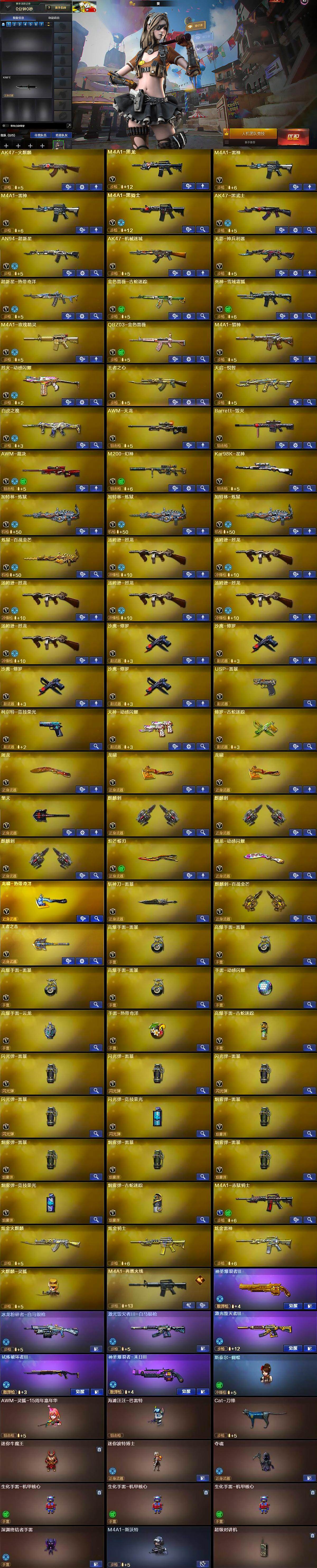 【热门武器】:QBZ03-金色蔷薇,M200-幻神,金色蔷薇-古蛇迷踪,修罗-古蛇迷踪,Kar98K-星神,金色小号,Cat-刀锋,M4A1-黑骑士,汤姆逊-烈龙*6,加特林-炼狱*3,斯泰尔-蝴蝶,USP-雷暴,沙鹰-修罗*4,Knife-冠军之刃*2,炽芒蝶刃,炽芒蝶刃-冠军炽芒皮肤