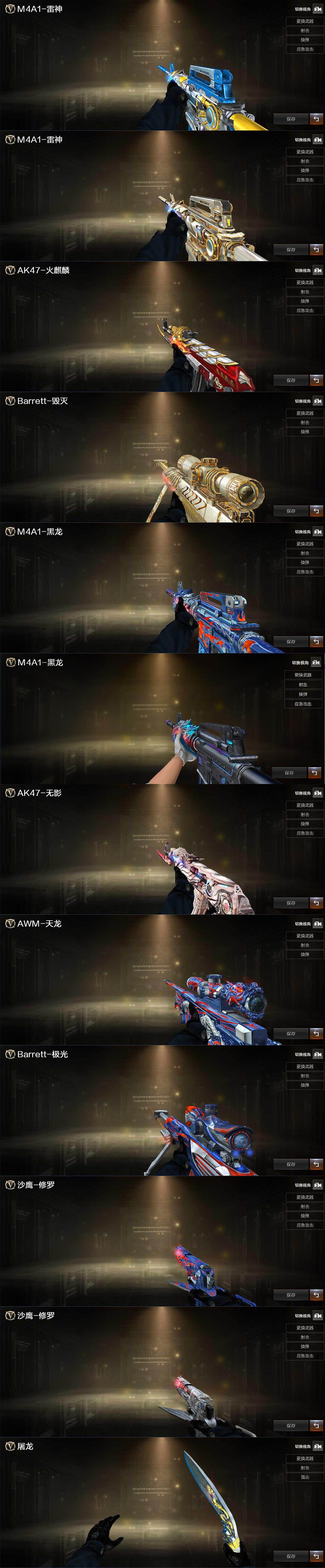 【皮肤】:雷神-荣耀之魄,雷神-耀金皮肤,火麒麟-华夏之心,毁灭耀金皮肤,黑龙-能量核心,M4