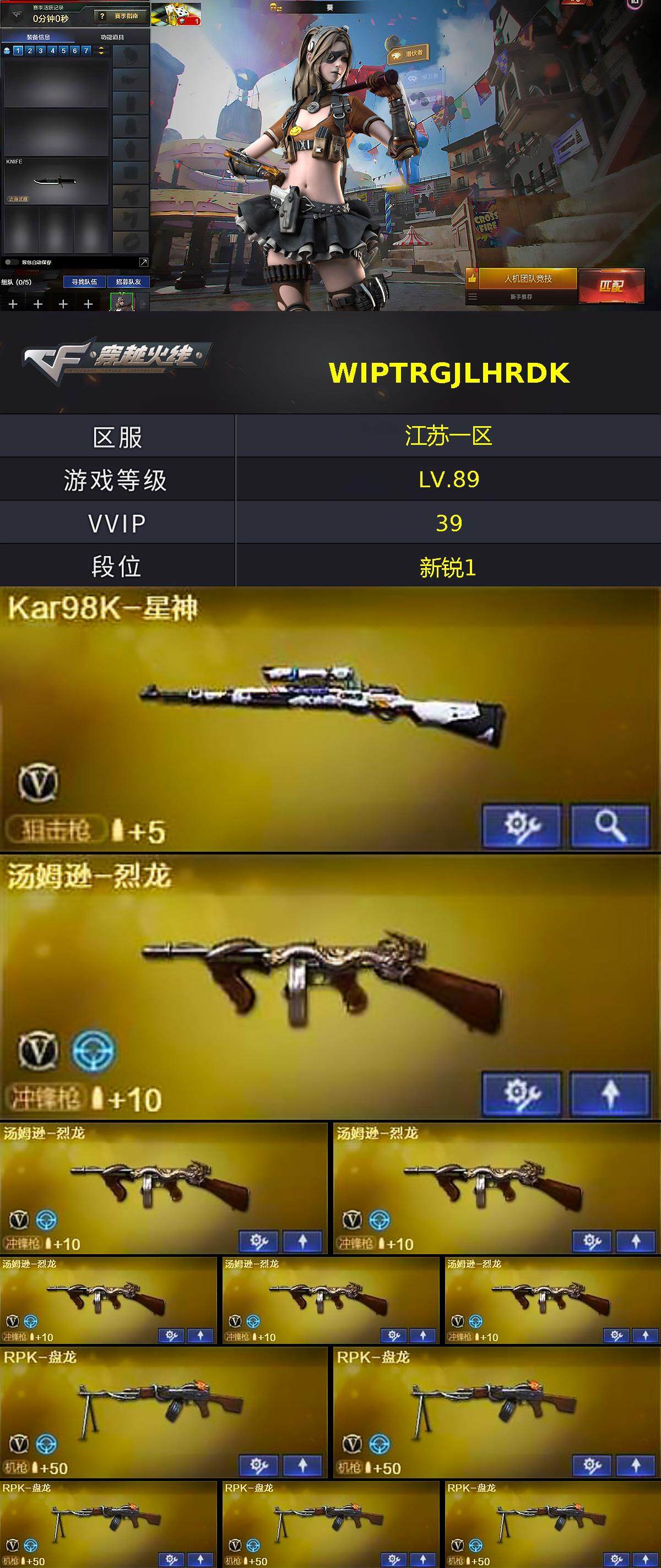 【热门武器】:HK417-朱雀,死亡之眼,Kar98K-星神,M4A1-黑骑士*3,汤姆逊-烈龙*6,RPK-盘龙*5,加特林-炼狱*2,沙鹰-修罗