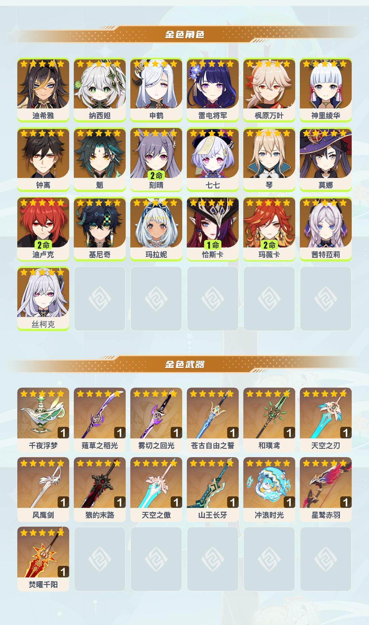 【YSC255】57级/39黄/女主/19个五星角色/13个五星武器/2命玛薇卡/茜特菈莉/枫原万叶/魈/0命丝柯克/神里绫华/纳西妲/钟离/申鹤/基尼奇/雷电将军/1命恰斯卡/2命迪卢克/2命刻晴/七七/琴/迪希雅/玛拉妮/莫娜/千夜浮梦/薙草之稻光/焚曜千阳/狼的末路/雾切之回光/天空之刃/星鹫赤羽/冲浪时光/山王长牙/苍古自由之誓/和璞鸢/天空之傲/风鹰剑