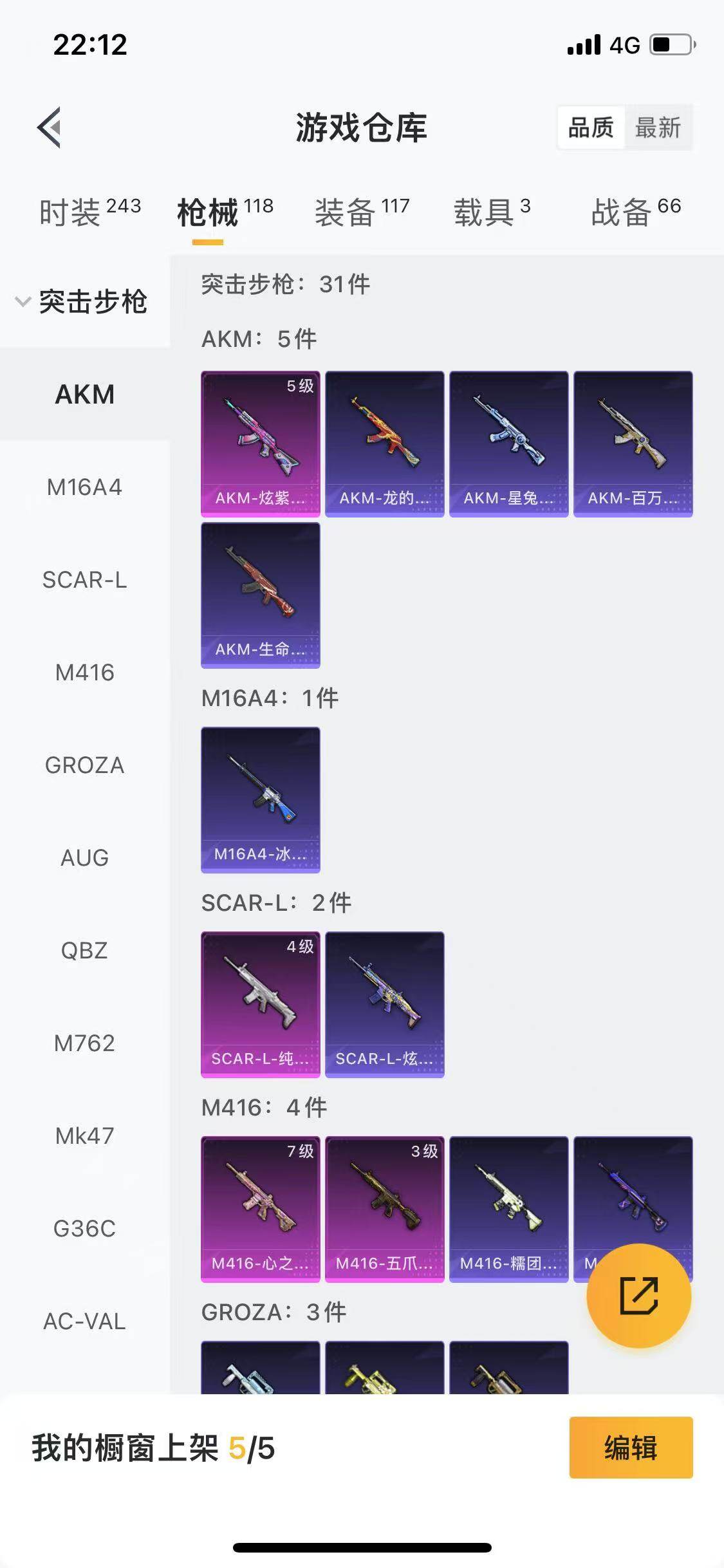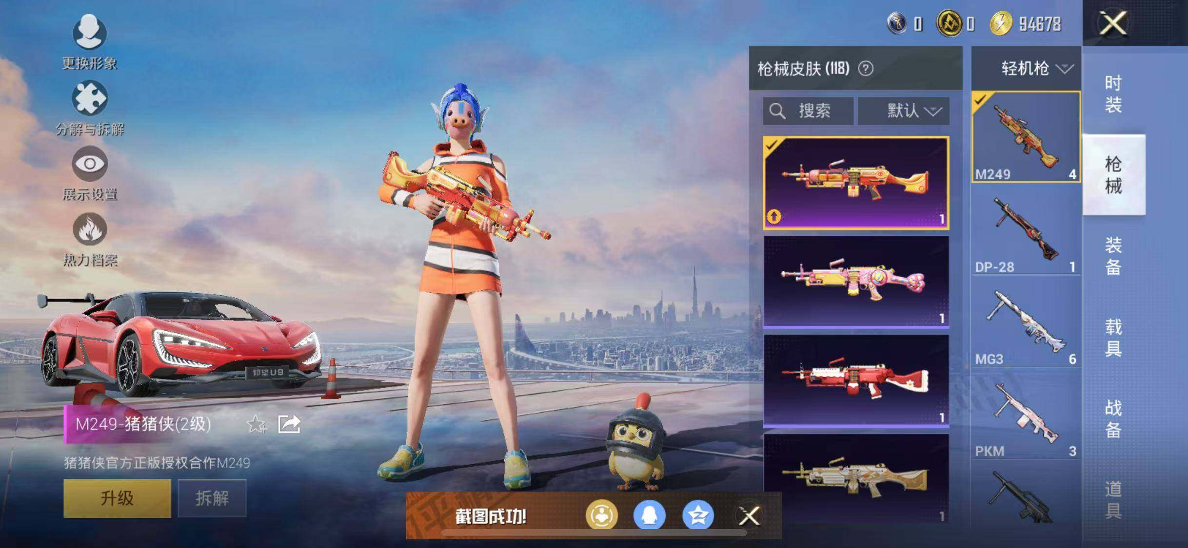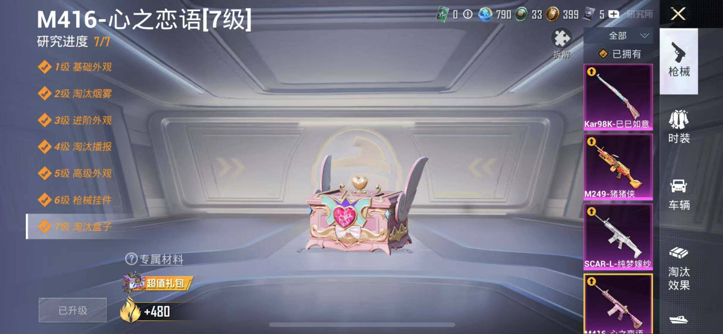 【特效枪等级】:AKM-炫紫旋律(五级),SCAR-L-纯梦嫁纱(四级),M416-五爪金龙(三级),M416-心之恋语(七级),Kar98K-巳巳如意(五级),M249-猪猪侠(二级)