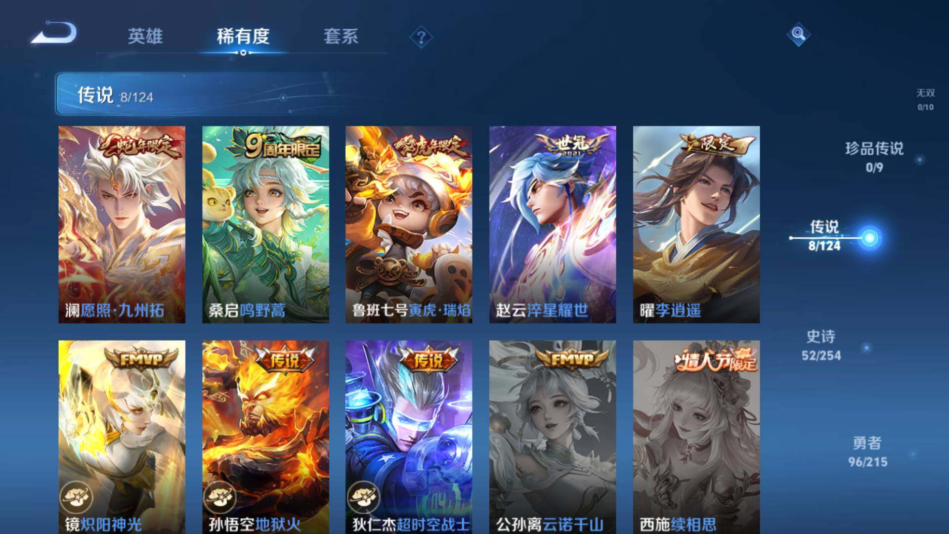【传说皮肤】:狄仁杰超时空战士,孙悟空地狱火,镜炽阳神光,曜李逍遥 ,赵云淬星耀世,鲁班七号寅虎瑞焰,桑启鸣野蒿,澜愿照九州拓