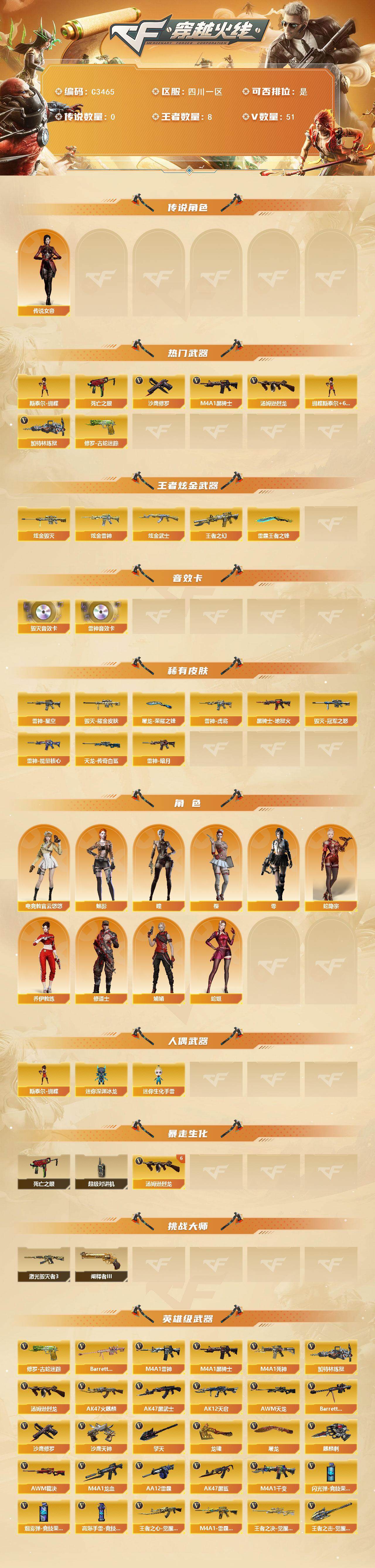 四川一区-51V-8王者-3炫金【传说角色】:传说女帝【热门武器】:修罗-