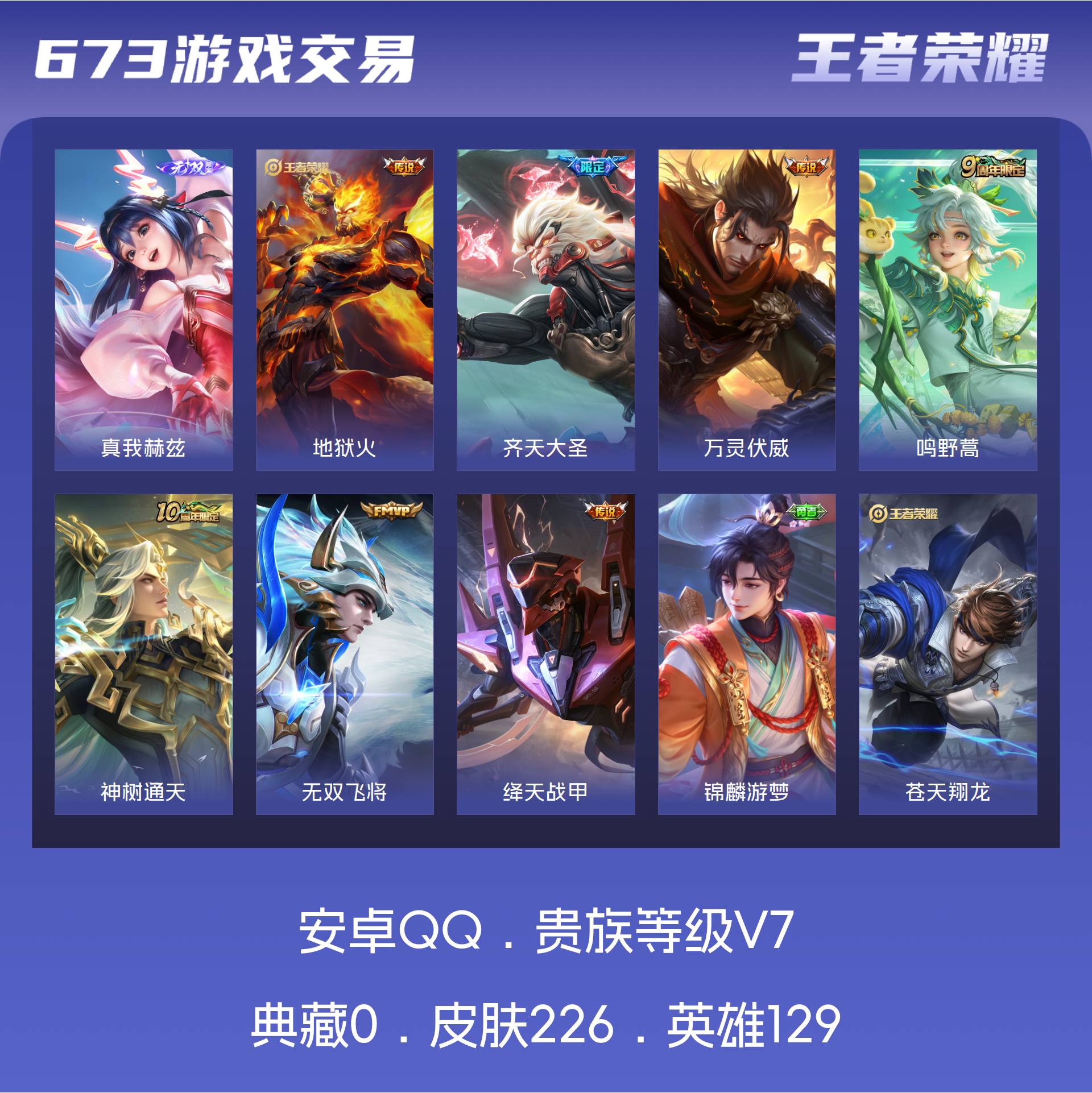 V7 皮肤226 英雄129 至尊星耀 无双皮肤1 星传说1 传说7 其他皮肤224