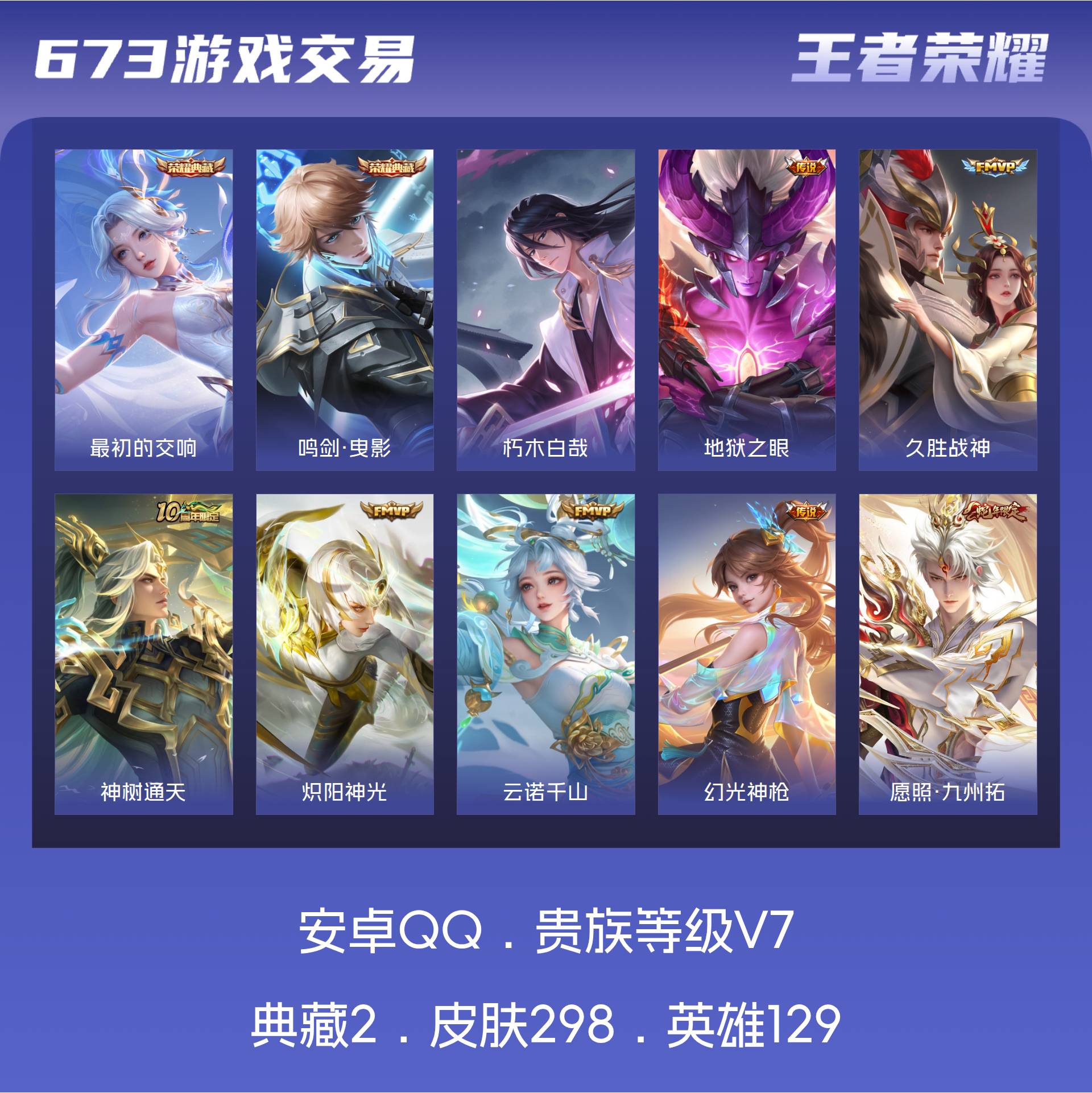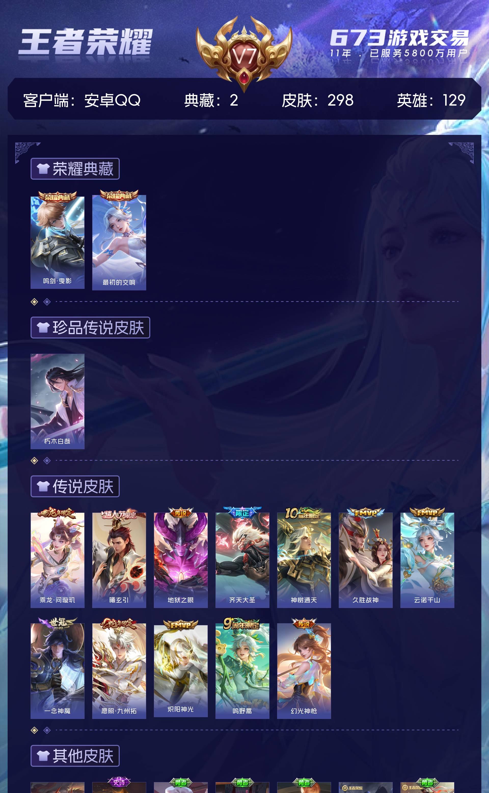 V7 皮肤298 英雄129 至尊星耀 荣耀典藏2 珍品传说1 星传说2 传说12 其他皮肤288