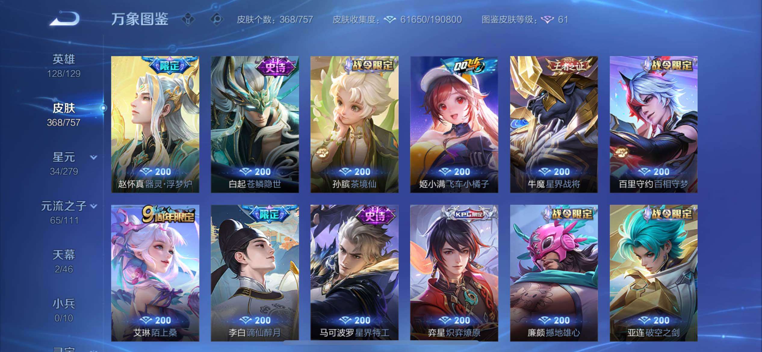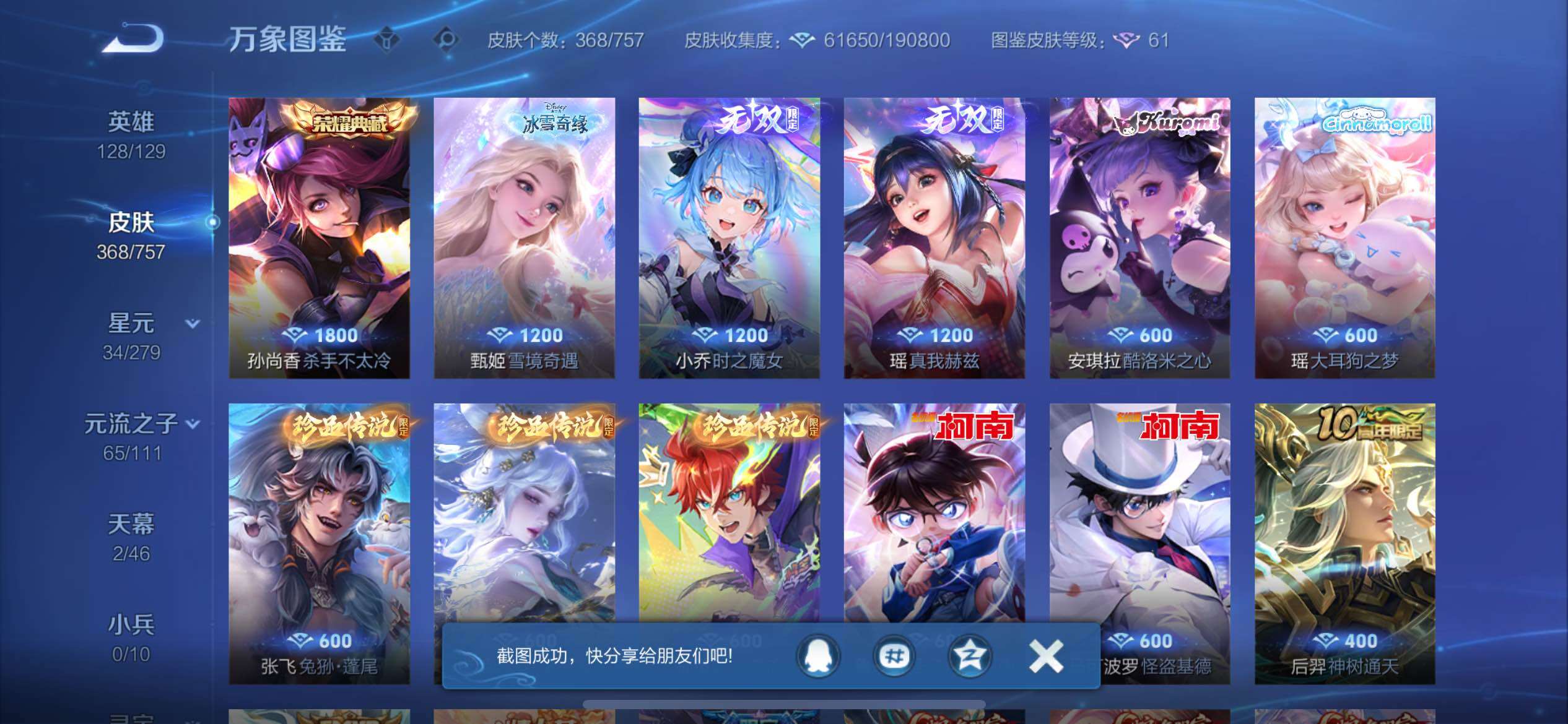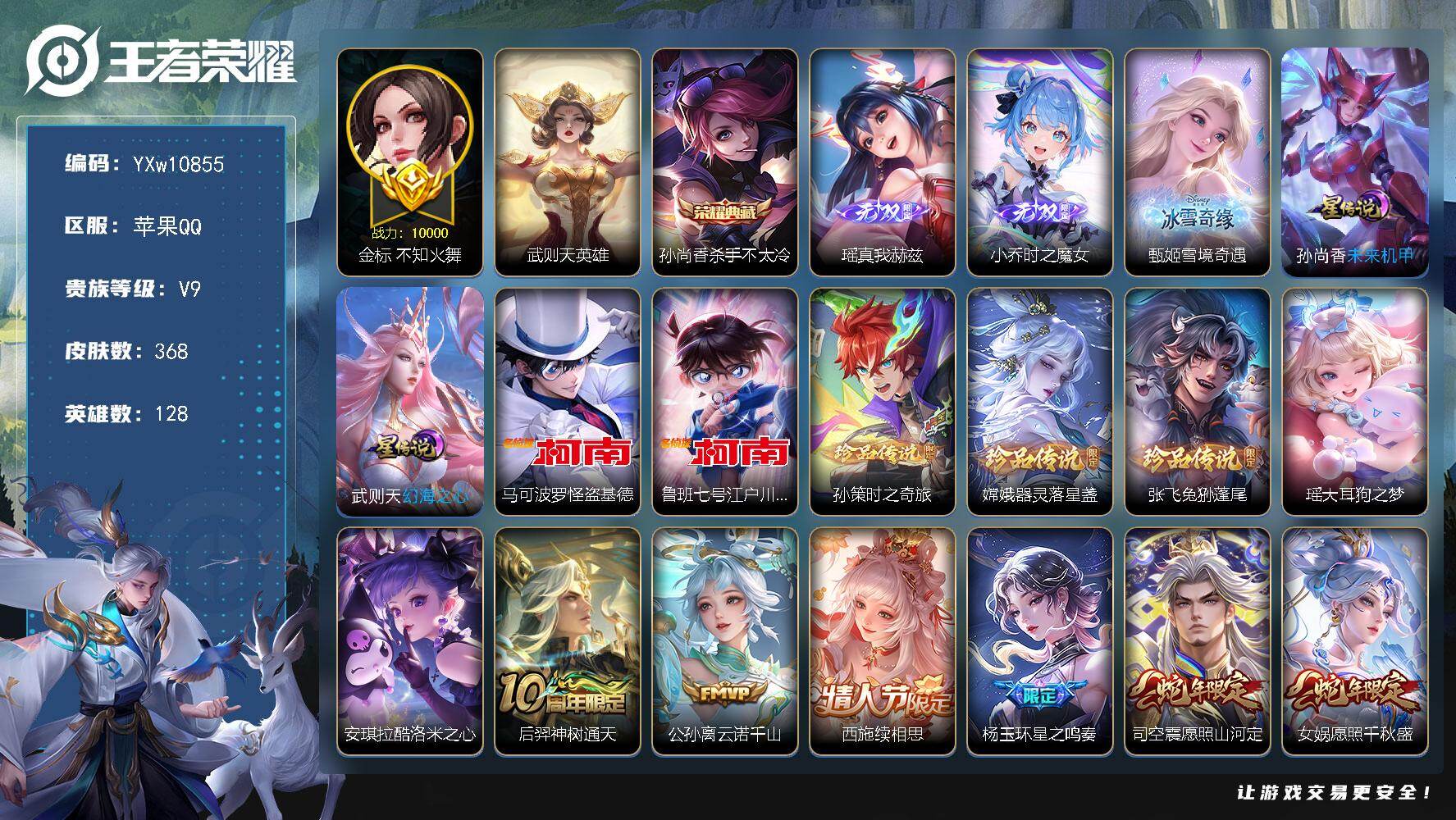 【店铺主推女号·2典藏·3无双·7珍品·42按键·怪盗基德天幕·杀手不太冷·武则天·瑶真我赫兹·甄姬雪境奇遇·金标万战火舞·酷洛米之心·瑶大耳狗之梦·兔狲蓬尾·器灵落星盏·江户川柯南·马可怪盗基德·续相思·满蛇年限定·可二次】YXw10855-苹果Q-128英雄-368皮肤-9王者印记-200铭文-贵族积分12W【贵族9】【2典藏·3无双·7珍品·2星传说·34传