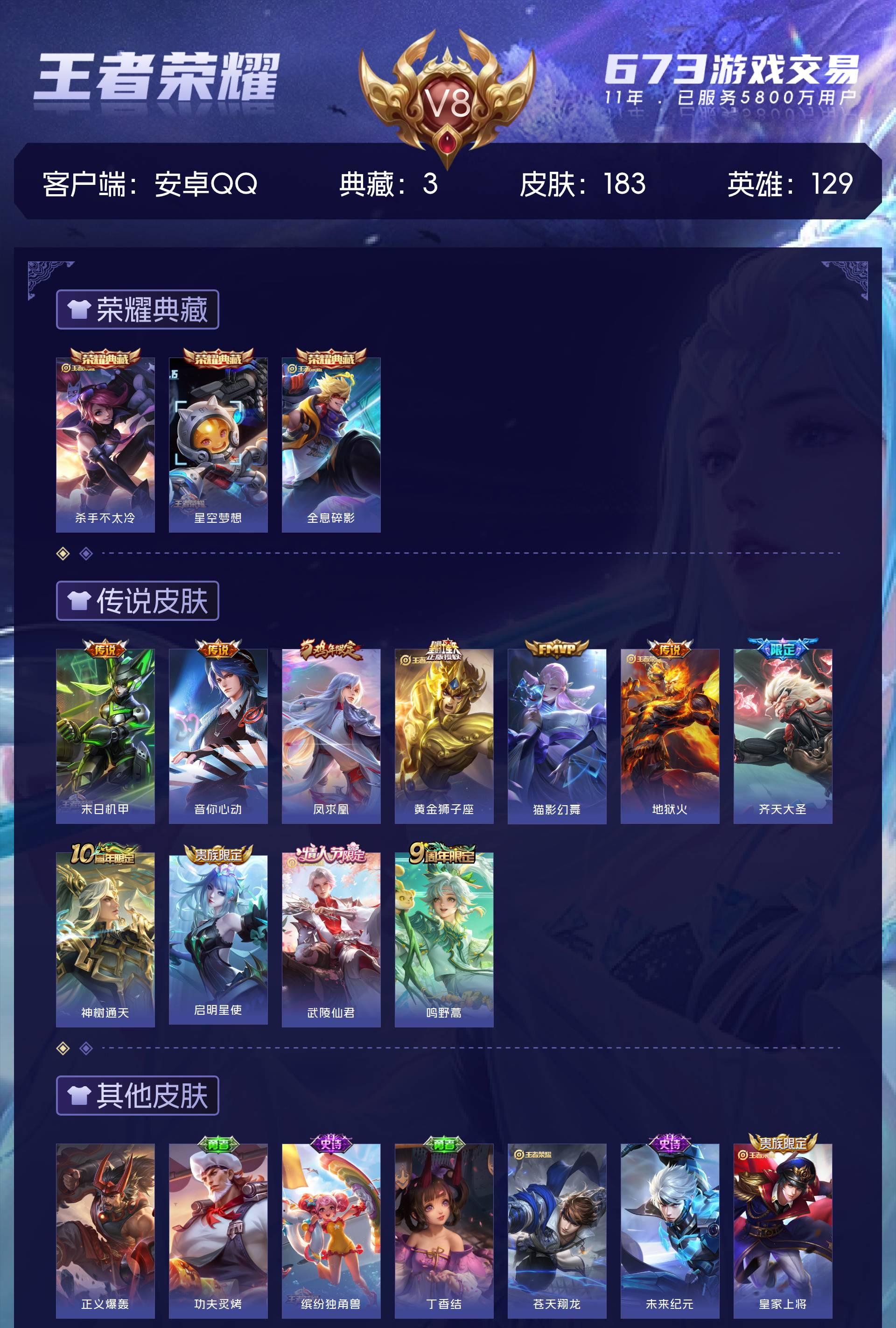 V8 皮肤183 英雄129 永恒钻石 荣耀典藏3 传说11 其他皮肤176