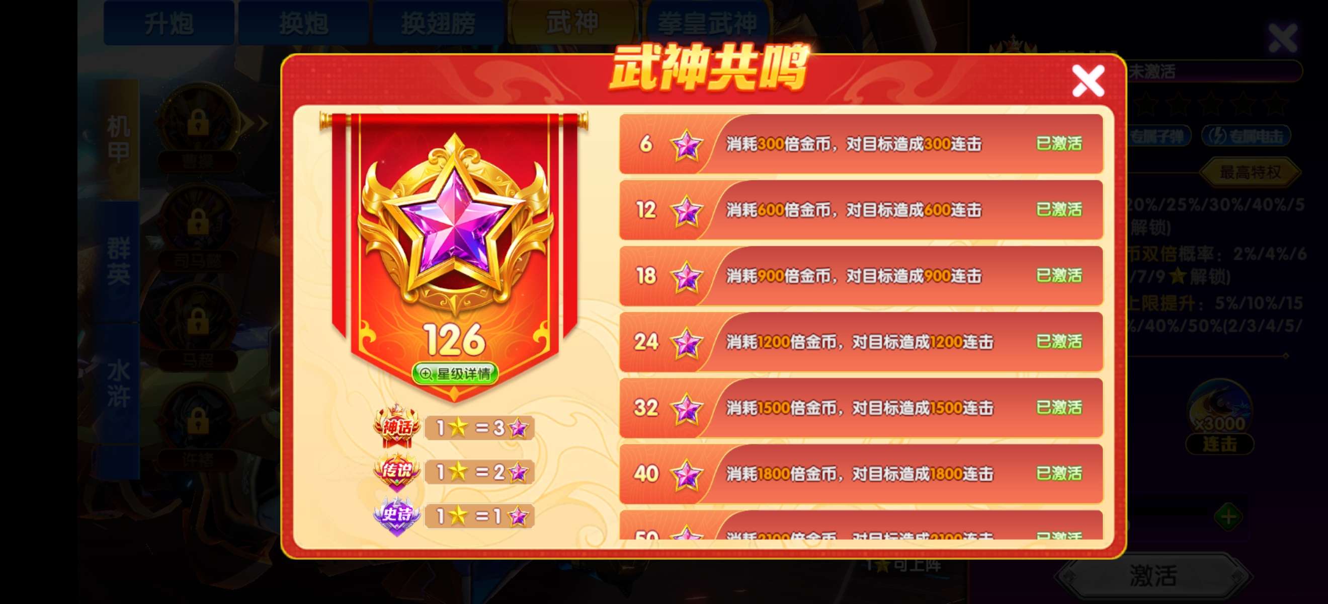 V10 加成2800 快2万炮三条翻倍羁绊,绝版武神翻倍。